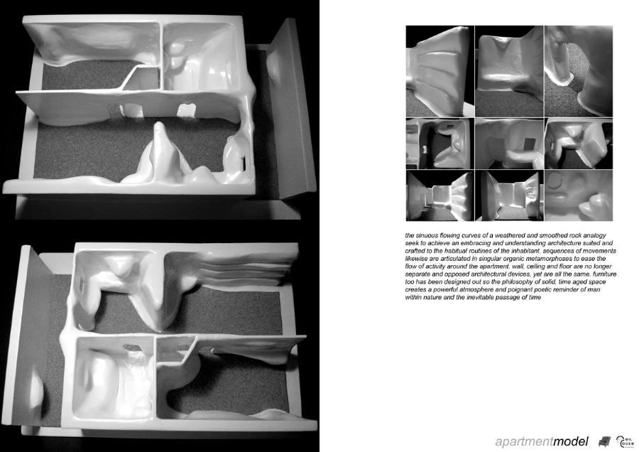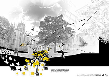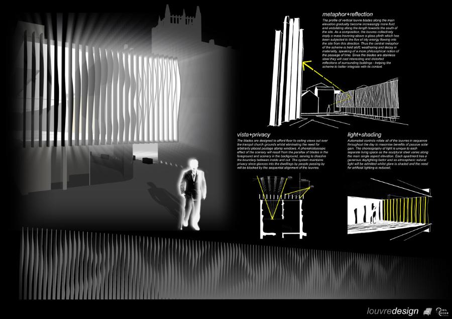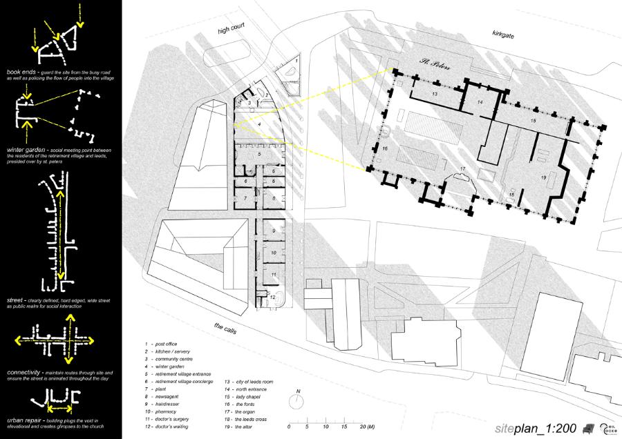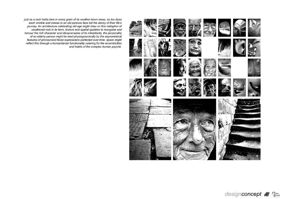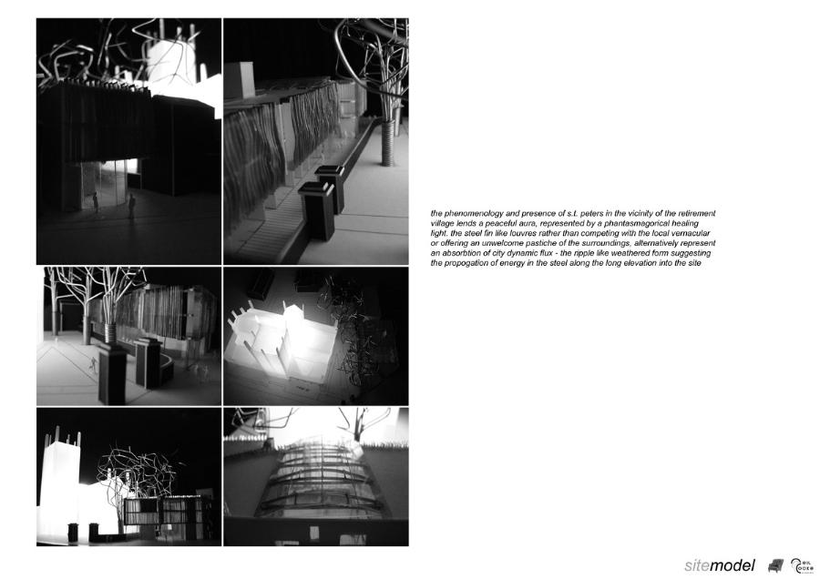 Kirkgate Retirement Village Part 1 Project 2008 Neil Cooke Leeds Beckett University | UK The weather worn stone which surrounds the site is a poetic reminder of the passage of time and man's own mortality and humble place along side nature. In its interest in and engagement with the patina and character which emerge through the passage of time, the design attempts to establish a respectful and coherent relationship between the site, the building and its users.The sectional perspective illustrates the omnipresence of the looming St Peter’s tower - paying homage to the real icon on the site. The roof structure is designed as a contextual gesture to the plant life which inhabits the winter garden. At night the glowing louver system lights up the shimmering undulating stainless steel facade to make a beautiful public art installation for people taking an evening stroll through the now well lit church grounds. The translucent church with a singular light source inside seeks to represent the spiritual presence experienced in this locale with St. Peter’s at the epicentre. Just as the celestial glow fades as you get further from the church, so too does the feeling of tranquillity. It is these qualities of the site which have informed the orientation of the winter garden to maximise the benefits of this spiritually healing aura. Instead of trying to pay homage by replicating materiality, form, orientation or proportionality, the external façade treatment seeks to pursue its own form, texture and function with elegance and subtlety as its main objectives. The steel fins become gradually more undulating as the façade moves south away from the city - as if the metal has absorbed the dynamic city flux as documented in the psychogeographic drawing at the outset of the design. The apartment model is made of plaster as a substitute for concrete, and is an exploration of the physical properties and limitations of this material. The weather hewn forms are subtly stylised so as to carve out ergonomically embracing spaces which would cater for the complex routines and habits of an elderly person. In the Third Year projects, students synthesize, in the design of a building in an urban context, the knowledge and skills gained during the Course.The brief, (adapted from a brief issued by the Anchor Trust) suggested sizes and types of dwelling units, types of ancillary accommodation, and the relative area of residential accommodation which would be needed to support the ancillary accommodation.The site (identified by tutors as potentially appropriate for a hypothetical retirement village)is immediately to the west of Leeds Parish Church and awaiting redevelopment. Only the end-buildings remain of a terrace facing eastwards directly onto the churchyard. (Neil proposed the demolition of these buildings). Students were encouraged to study the plans of English villages. Bordering or passing through the block (of which the site forms part) are pedestrian walk-ways with a village-like scale. Neil's project supplements these with a walkway traversing the block on the north-south axis, creating a central crossroads. (Villages commonly developed around crossroads.)Neil's observations of the weathered stonework around the Parish Church (part of the process of site-analysis) have led to reflections on the parallel process of human ageing and the sensitive and imaginative conclusion that the softness of "eroded" forms might have a role to play in the creation of a safe environment appropriate for the elderly.His project is notable for its artistry and the lively approach (delighting in metaphor, simile and analogy) which is equally apparent in the drawings and models which communicate it. (The adjacent city is jumbled, dynamic and threatening (as wordlessly communicated in the drawing.)) (The Parish Church is an urban beacon (as Neil's model shows us by making it a source of light)). (Structural trusses can be like the leaves which grow in the winter-garden below them.) (THe development could feel more village-like because of the introduction of a crossroads.)Neil's presentation provides only an edited version of the holistic coverage (including studies relating to environmental physics, structures, construction, landscaping etc.) which he undertook, and only partial evidence of his industry, energy, commitment and breadth of exploration.