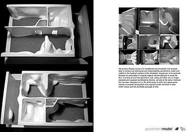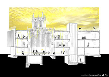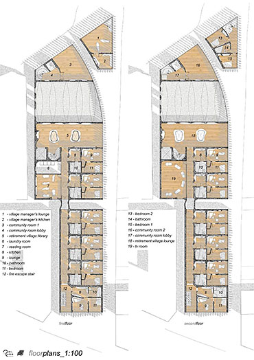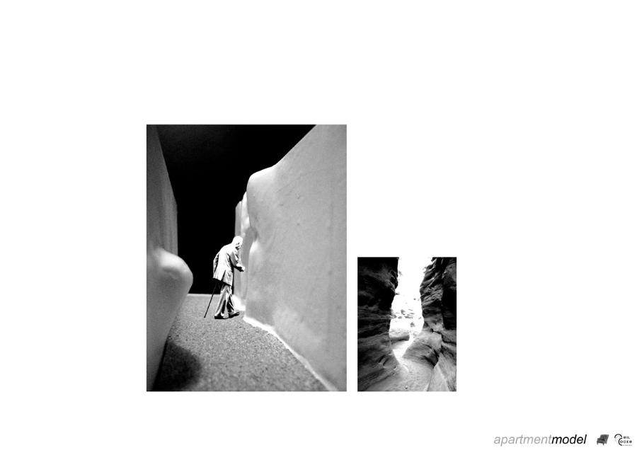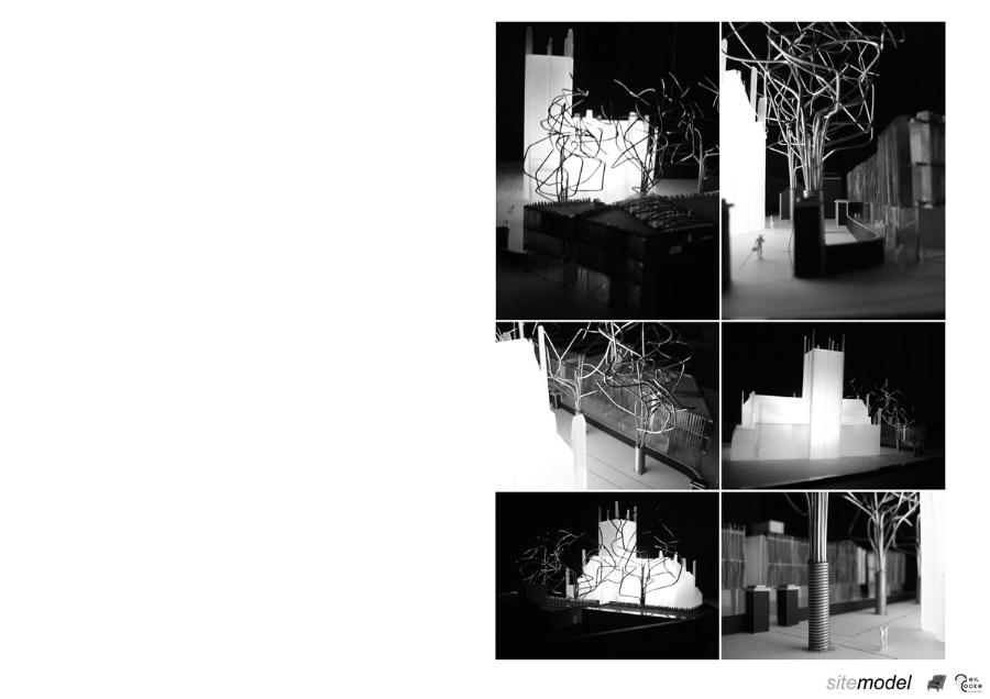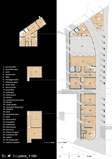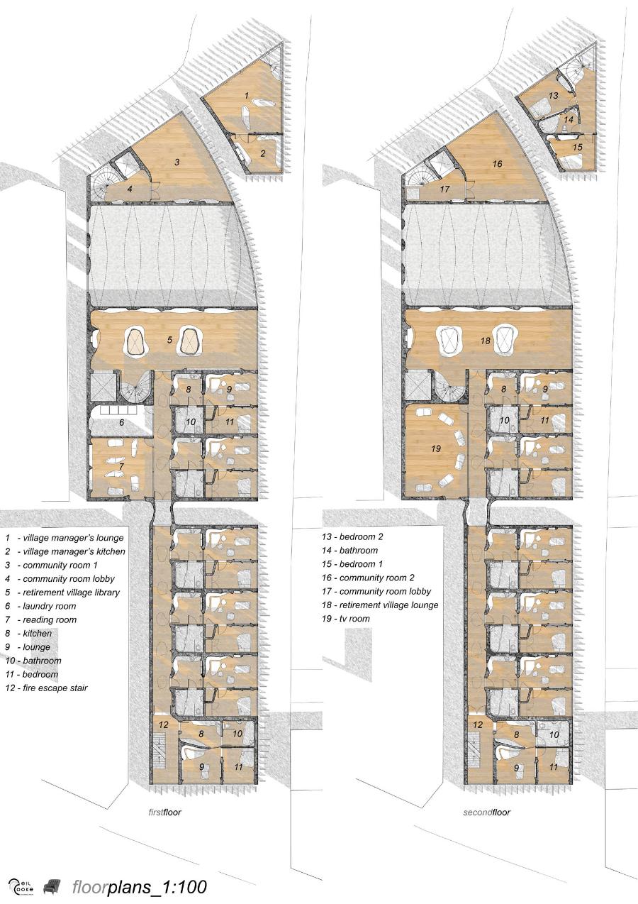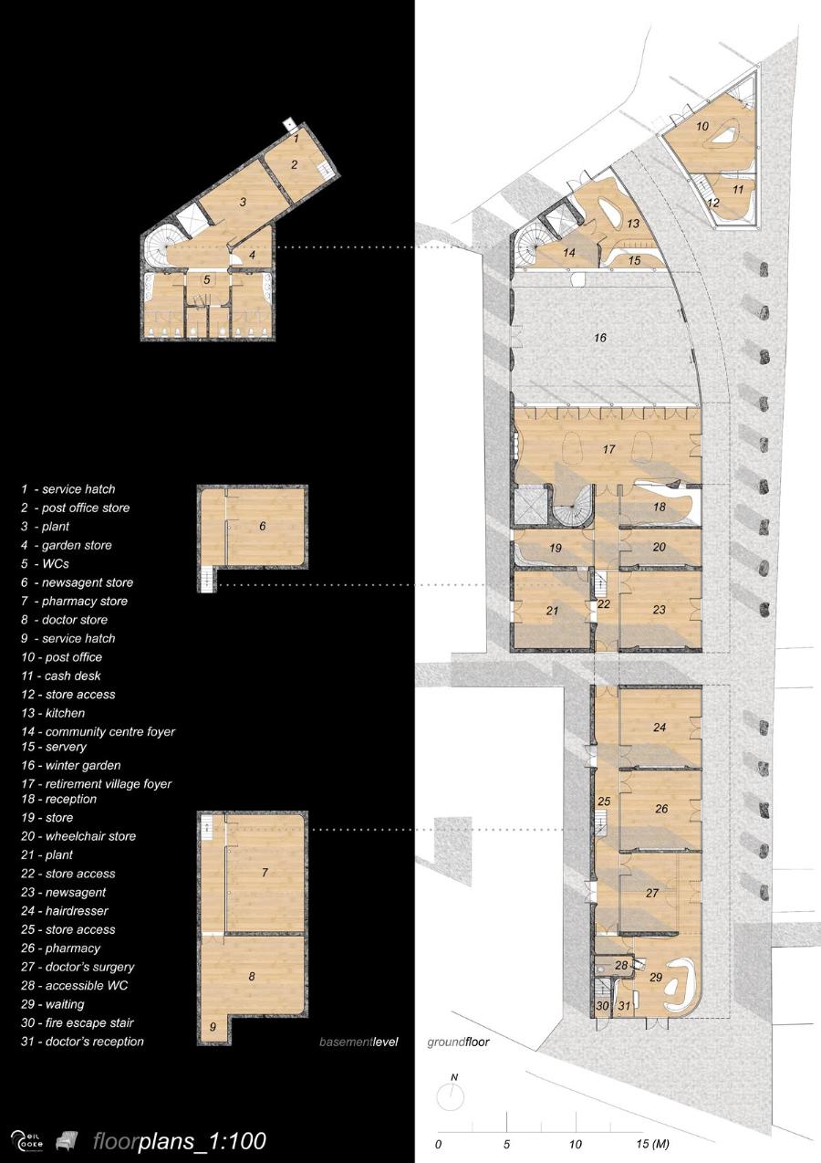 Kirkgate Retirement Village Part 1 Project 2008 Neil Cooke Leeds Beckett University | UK The weather worn stone which surrounds the site is a poetic reminder of the passage of time and man's own mortality and humble place along side nature. In its interest in and engagement with the patina and character which emerge through the passage of time, the design attempts to establish a respectful and coherent relationship between the site, the building and its users.The sectional perspective illustrates the omnipresence of the looming St Peter’s tower - paying homage to the real icon on the site. The roof structure is designed as a contextual gesture to the plant life which inhabits the winter garden. At night the glowing louver system lights up the shimmering undulating stainless steel facade to make a beautiful public art installation for people taking an evening stroll through the now well lit church grounds. The translucent church with a singular light source inside seeks to represent the spiritual presence experienced in this locale with St. Peter’s at the epicentre. Just as the celestial glow fades as you get further from the church, so too does the feeling of tranquillity. It is these qualities of the site which have informed the orientation of the winter garden to maximise the benefits of this spiritually healing aura. Instead of trying to pay homage by replicating materiality, form, orientation or proportionality, the external façade treatment seeks to pursue its own form, texture and function with elegance and subtlety as its main objectives. The steel fins become gradually more undulating as the façade moves south away from the city - as if the metal has absorbed the dynamic city flux as documented in the psychogeographic drawing at the outset of the design. The apartment model is made of plaster as a substitute for concrete, and is an exploration of the physical properties and limitations of this material. The weather hewn forms are subtly stylised so as to carve out ergonomically embracing spaces which would cater for the complex routines and habits of an elderly person. In the Third Year projects, students synthesize, in the design of a building in an urban context, the knowledge and skills gained during the Course.The brief, (adapted from a brief issued by the Anchor Trust) suggested sizes and types of dwelling units, types of ancillary accommodation, and the relative area of residential accommodation which would be needed to support the ancillary accommodation.The site (identified by tutors as potentially appropriate for a hypothetical retirement village)is immediately to the west of Leeds Parish Church and awaiting redevelopment. Only the end-buildings remain of a terrace facing eastwards directly onto the churchyard. (Neil proposed the demolition of these buildings). Students were encouraged to study the plans of English villages. Bordering or passing through the block (of which the site forms part) are pedestrian walk-ways with a village-like scale. Neil's project supplements these with a walkway traversing the block on the north-south axis, creating a central crossroads. (Villages commonly developed around crossroads.)Neil's observations of the weathered stonework around the Parish Church (part of the process of site-analysis) have led to reflections on the parallel process of human ageing and the sensitive and imaginative conclusion that the softness of "eroded" forms might have a role to play in the creation of a safe environment appropriate for the elderly.His project is notable for its artistry and the lively approach (delighting in metaphor, simile and analogy) which is equally apparent in the drawings and models which communicate it. (The adjacent city is jumbled, dynamic and threatening (as wordlessly communicated in the drawing.)) (The Parish Church is an urban beacon (as Neil's model shows us by making it a source of light)). (Structural trusses can be like the leaves which grow in the winter-garden below them.) (THe development could feel more village-like because of the introduction of a crossroads.)Neil's presentation provides only an edited version of the holistic coverage (including studies relating to environmental physics, structures, construction, landscaping etc.) which he undertook, and only partial evidence of his industry, energy, commitment and breadth of exploration.