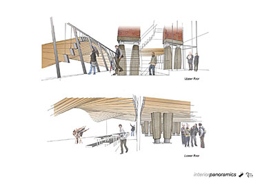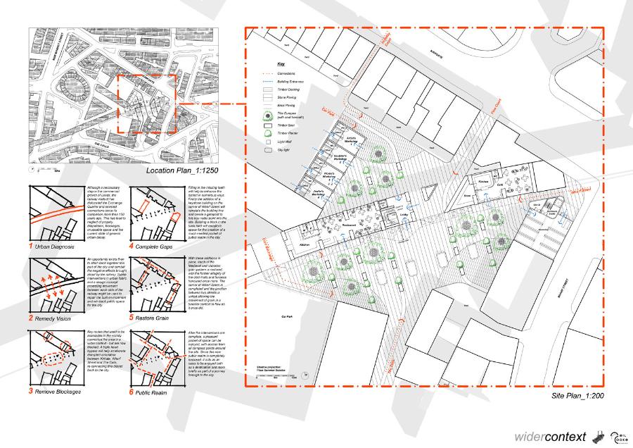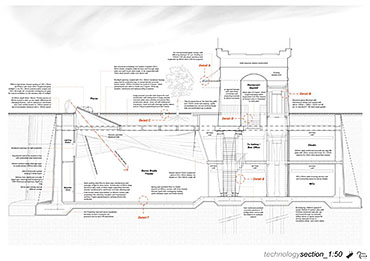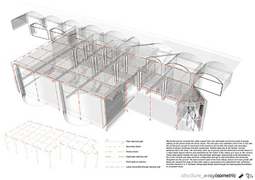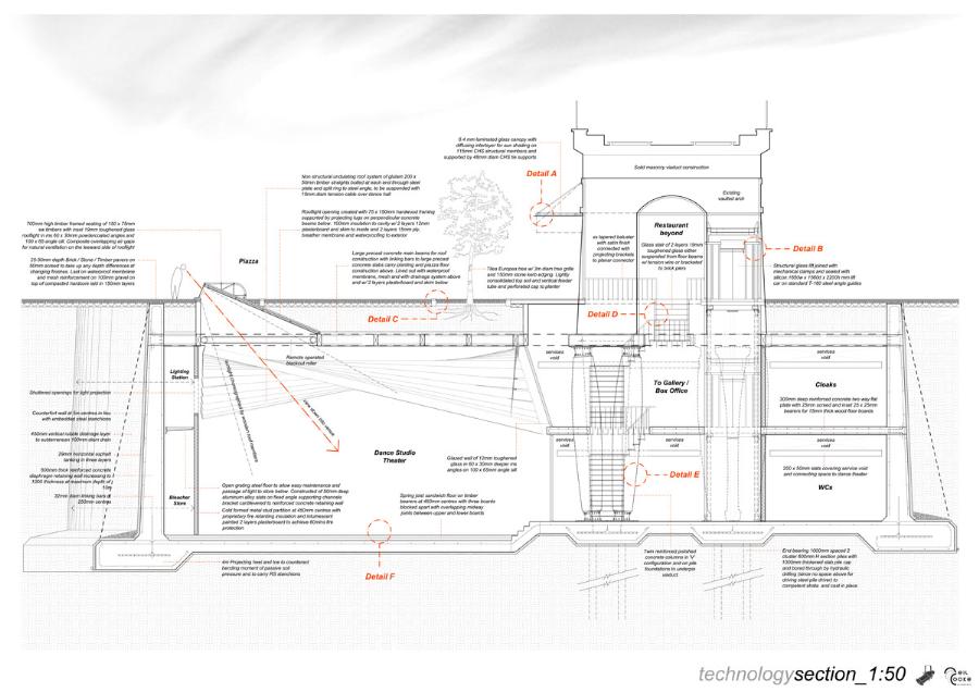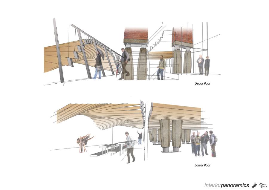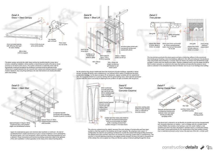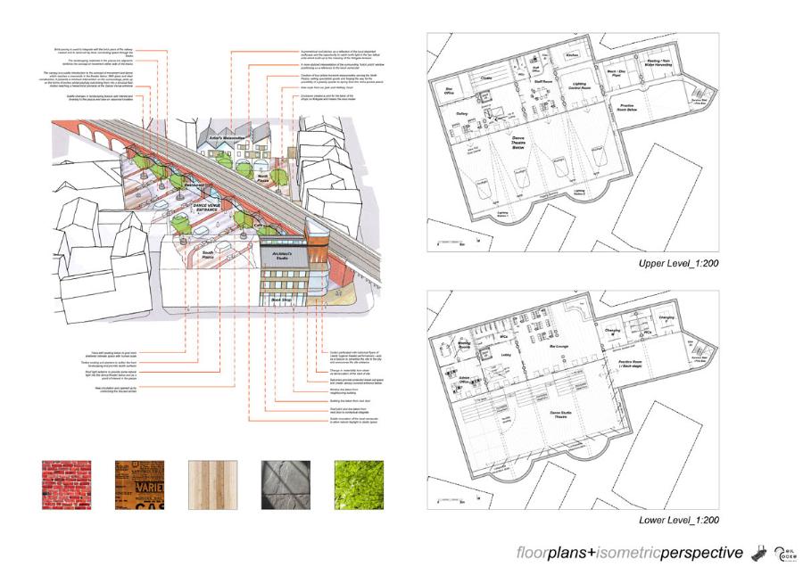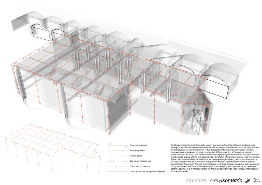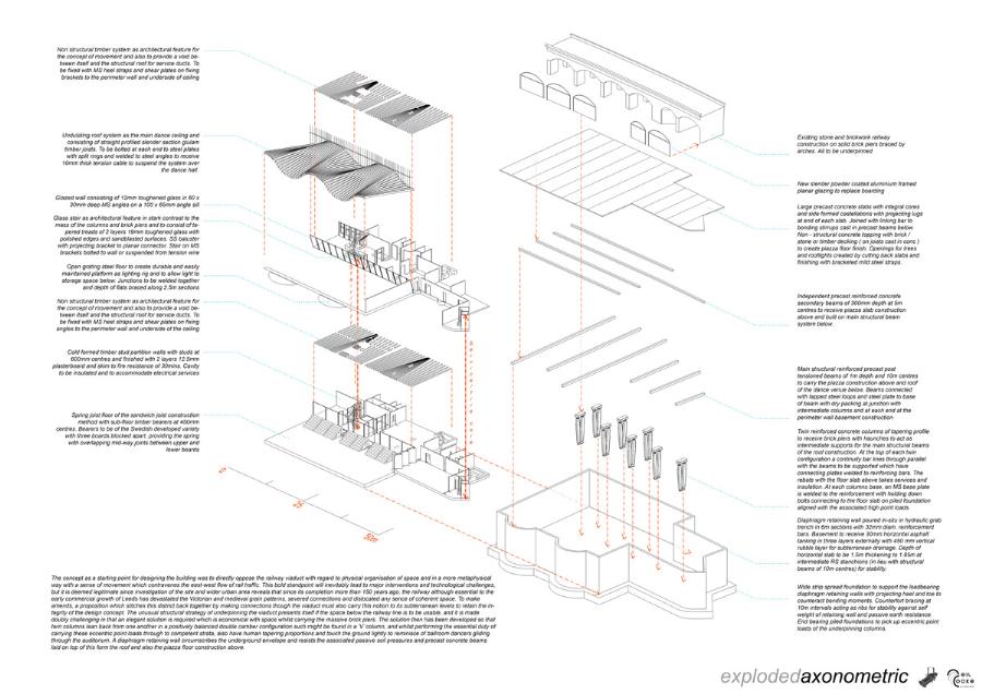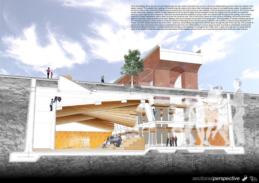 Leeds Dance Centre Part 1 Project 2008 Neil Cooke Leeds Beckett University | UK The project brief is for a dance centre and compromises two main elements. A response to the wider urban setting above ground and a subterranean envelope which seeks to offer a constructional language more specific to dance. It is evident on the lower basement plan how the timber members (shown dotted on plan) serve to offer a more feminine balance to the very masculine brick piers of the railway viaduct and the necessarily substantial underpinning. The circulation core, staff facilities and bar/lounge area all look out over the main hierarchical double height performance space. Moveable bleachers seating is used to cater for a variety of audience/stage configurations which will be well received by the more contemporary dance companies whom sometimes have innovative stage/audience relationships.The section aims to describe how the constructional detailing of the dance venue could add delight to the overall experience of the space. The twin column arrangement, taking point loads from each pier of the railway viaduct, lean back from each another as a dancing couple might hold one another in a routine. The columns modelled with human tapering profiles, descending to touch the ground in an altogether more light manner than might have occurred had an underpinning relied on the line of the splayed brick piers been extrapolated down through the venue.The sectional perspective drawing attempts to illustrate the two key design ideas promoting dance in the building. Firstly the twin column arrangement at set intervals has been layered in a montage with ghosts dancing to show how the columns pick up the gentle arc of the railway line which they support and appear to glide through the venue. Secondly, the long timber slat configuration, which creates a void between itself and the main structural envelope for services, exemplifies the use of chronophotography as a method of describing a fluid motion; such as dance. In the last projects of the Third year, the student synthesises, in the design of a building in an urban context, the knowledge and skills gained during the Course.An outline brief for a Dance Centre was provided for the students. Four sites were suggested as being (hypothetically) suitable.The briefs were developed through guided tours to the Contact Theatre, Manchester (where students learnt about the requirements for bungee dancing, aerial dancing and dancing for the disabled); the Northern Ballet theatre; and the Yorkshire School of Contemporary Dance.Neil chose a site on Wharf Street, Leeds. As part of the site analysis, he looked at the wider area and became interested in the divisive effect of the railway viaduct and the fact that a culverted beck ran close to the site. He developed an obsession with underground Leeds; secret Leeds; spaces which are known to exist but are sealed off and no longer used.He suggested that the area could be unified by an underground Dance Centre underneath and on both sides of the viaduct.His project is notable for its independence; the thoroughness with which the decision to underpin the railway viaduct has been pursued; his determination to establish an architectural language reflective of both the site and the brief; and its lively approach,(delighting in metaphor, simile and analogy) which is equally apparent in the drawings and models which communicate it.There are paired,"dancing" columns; the establishment of rhythm (a beat or time-signature which organises the planning); a ceiling like a chronophotographic record of the oscillating flight of a see-saw through the space. (The derivation of the ceiling's design from the work of Etienne-Jules Marey is referred to in the chronophotograph of the performer being observed by the Dance-Theatre audience.) There are attempts to allocate a gender to the piers and columns of the viaduct (male) and the ceiling (female). There are references to the site's historic past as a timber-yard.Neil's submission provides only an edited version of the holistic coverage (including studies relating to environmental physics, structures, construction and landscaping etc.) which he undertook, and only partial evidence of his industry, energy, commitment and breadth of exploration.