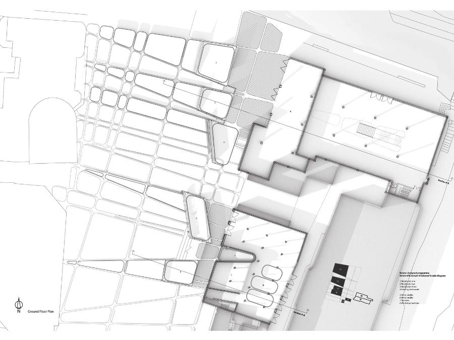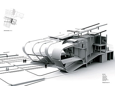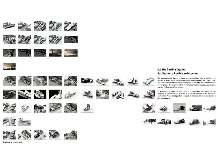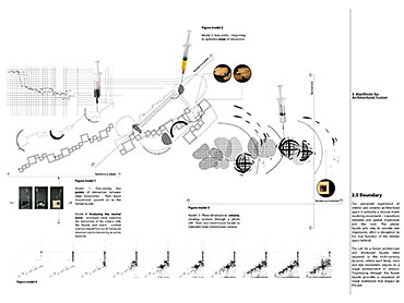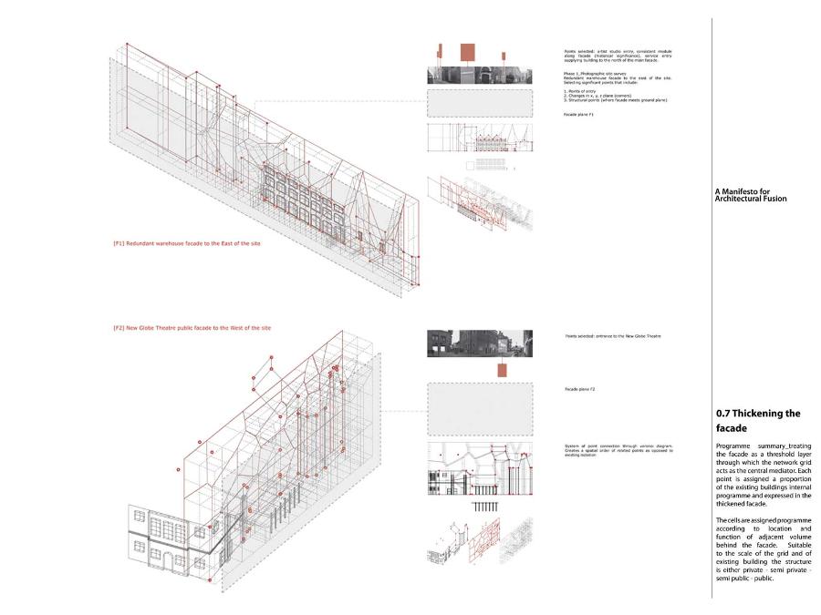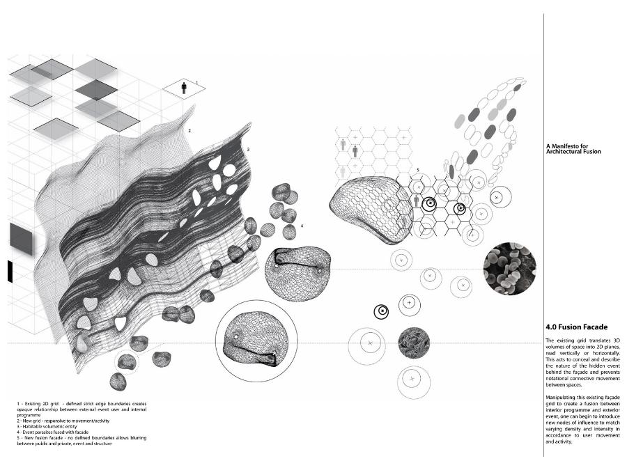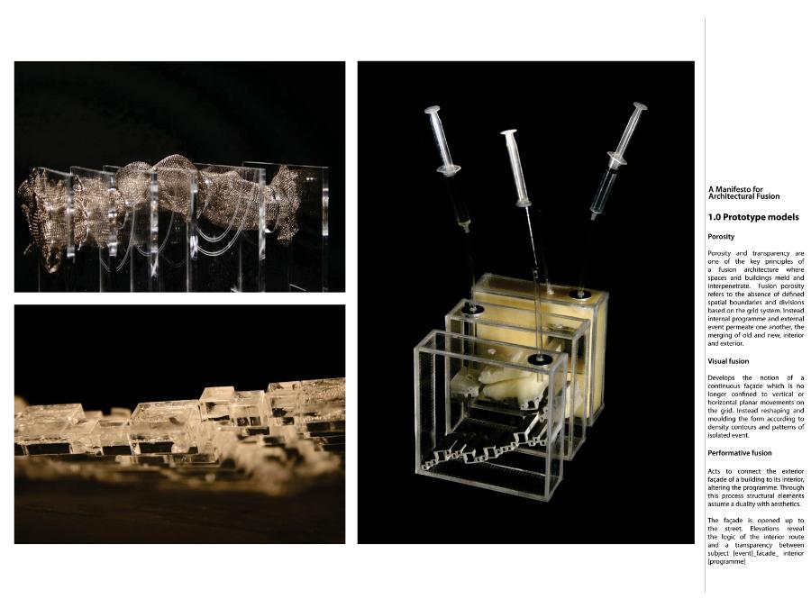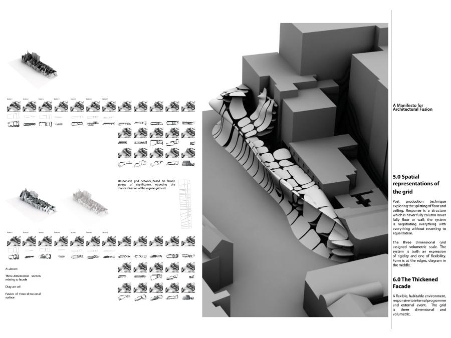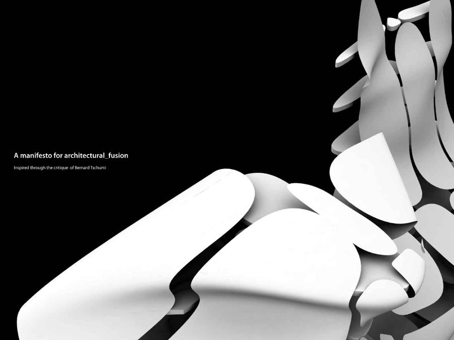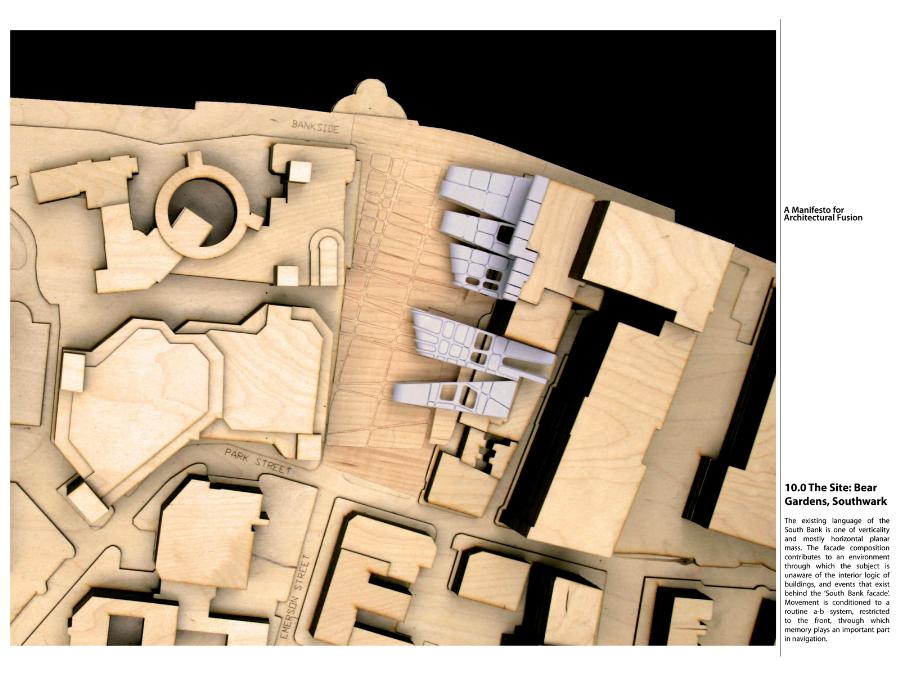 A Manifesto for Architectural Fusion Part 1 Project 2008 Aaron Holden University of Nottingham Nottingham | UK Our perception of interior and exterior architectural space is primarily a sensual event dependent on movement and transitions. The planar façade often deceptive, acts to provide a singular two-dimensional image. In opposition, my manifesto for a 'fusion architecture' and a habitable 'thickened façade' favours a multi-sensory dynamic, both experienced from the inside and the outside. Fusion between internal programme and external event promotes an interpenetration of spaces and the blurring of traditional boundaries. Ultimately, thickening and multiplying the layers of the façade and controlling its framing creates a sequence of visual revelations: impacting on the users pattern of occupation and interaction. Aaron’s project explores the tradition of the architectural manifesto threefold. Firstly, as Manifesto. A speculative written and graphical piece of work establishing his notion of ‘architectural fusion.’ It questions the static relationship between function and form. Secondly, through the idea of Prototype. A series of artifacts investigating the visual and material resistance and behaviour that is produced by different movements and tectonic conditions. Thirdly, as Manifestation. A strategic design-proposal that utilises his previous studies and develops a ‘thickened façade.’ It negotiates the conventional boundaries of privacy and creates a much needed multiple, yet coherent reading of the southern riverbank of the Thames. Miss Julie RichardsMr Sam Jacoby
