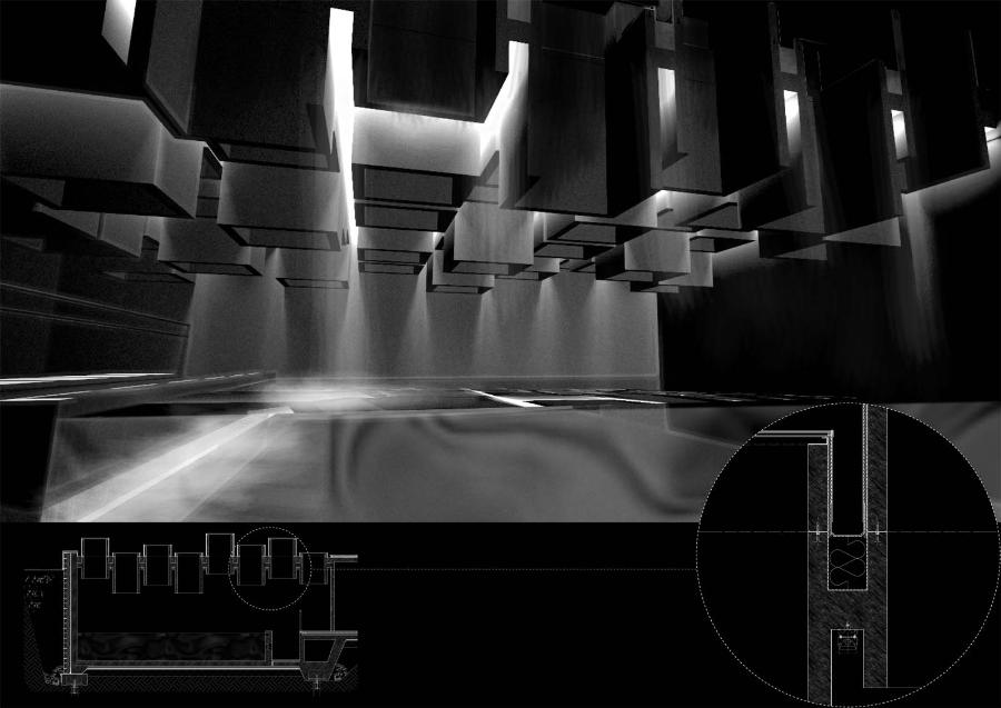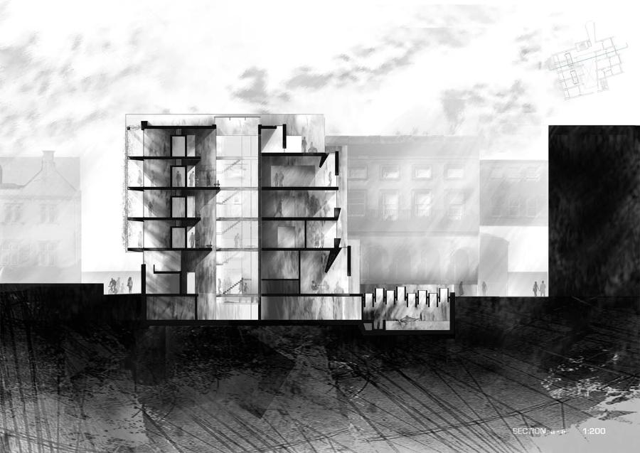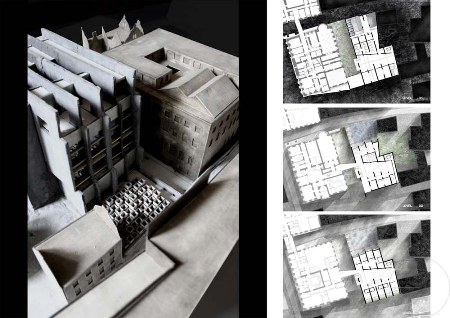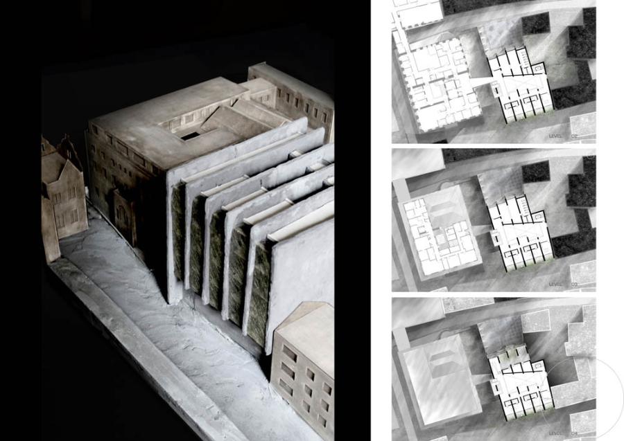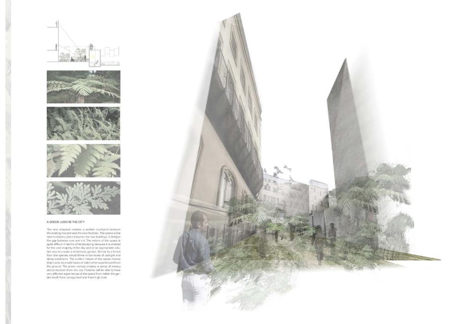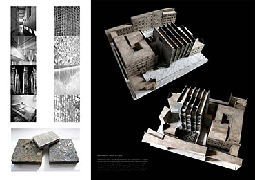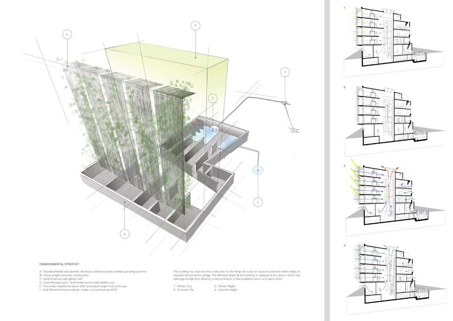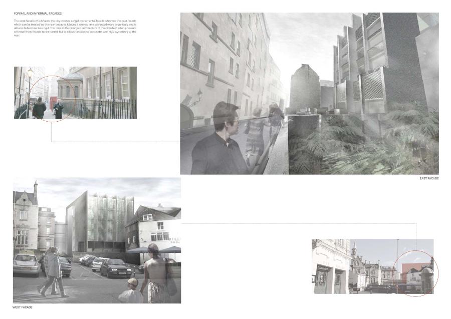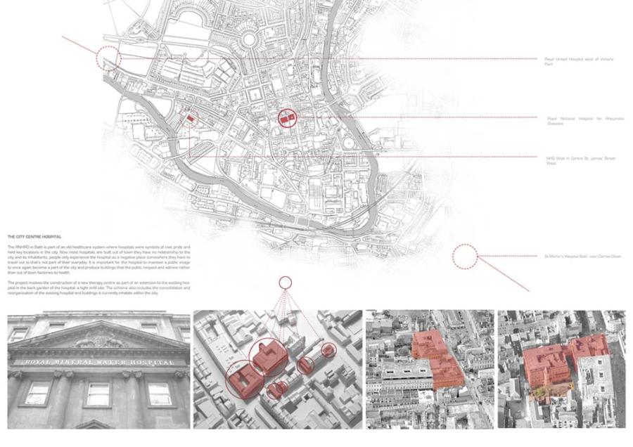 The Royal Min - Therapy Centre Part 1 Project 2008 Bethan Kay University of Bath | UK RECONNECTING TO THE ESSENCE OF BATHSince its foundation Bath has been a centre for healing and wellbeing centred around the hot springs, however in recent years we have lost this fundamental connection to Bath’s raison d’être. Up until 1976, when funds were withdrawn, people regularly bathed in the hot baths - 70% of these bathers were funded by the NHS on prescriptions. Now with the introduction of the new thermae Spa for leisure bathing the time has come for Bath to once again reconnect to its routes.The new therapy centre for the Royal National Hospital for Rheumatic Disease, or as it affectionately known ‘the Royal Min’, acts as an extension to the existing facility within its tight city centre site. The new centre improves upon and consolidates existing therapy facilities and reintroduces the natural hot spring water, using it for medicinal purposes for the first time in over thirty years.The project challenges the preconceptions about contemporary hospital environments and reflects on a time when hospitals were key buildings of civic pride in the city. The building seeks to encapsulate this through a design of substance and timelessness that engages with the public and creates a sanctuary of healing within the chaos of the city. The final undergraduate project at Bath runs for a full semester and affords each student the opportunity to develop their own project brief, consistent with the theme for the Studio. Every student is also responsible for identifying their own site, which must meet certain given criteria, and which lies within a given locale. The theme for this year’s studio dealt with the development of the City of Bath within its existing boundaries. The emphasis was therefore on creating greater density within an existing urban boundary and an historic building environment. Additional themes, common to all final year projects, were the exploration of materiality and integration of sustainability within the final design.Bethan identified Bath’s Mineral Water Hospital as her client for the project. Although part of the NHS, the specialist “Min” hospital has a long history within the City, making use of Bath’s natural spa waters. Her project successfully resolved the organisation of the existing Georgian building and the various problematic urban conditions bounding her site.Bethan’s project combined an acute sensitivity to the individual patient experience and their environment with the ambition to heal part of the city’s damaged urban fabric. Her scheme embraces the idea of urban landscape through the building itself and through the careful and considered use of soft landscaping as a counterpoint to, and as an integral part of, the new building.Bethan fully engaged with the complex relationship between well-being and environment. The project was an ideal vehicle to pursue and embody her response to the challenge of creating an architecture capable of fostering psychological and physical recovery.The project created a rich series of internal and external spaces, the character of which was fully explored and controlled by the student as part of her design process. These spatial studies were carried out together with detailed investigations of material. Bethan resolved all these elements within her detailed design. Throughout the project she demonstrated a sophisticated ability to manipulate materials and light with the technical creativity and knowledge which enabled her to realise her ambitions.