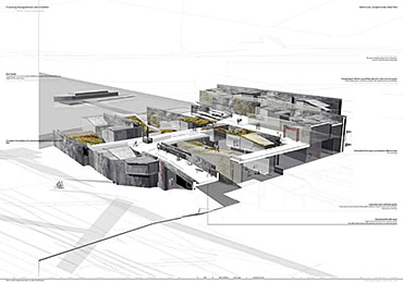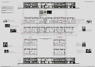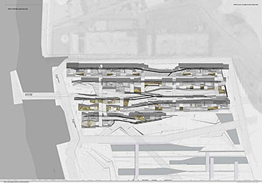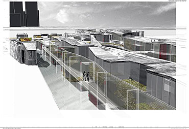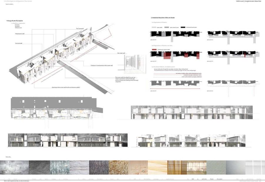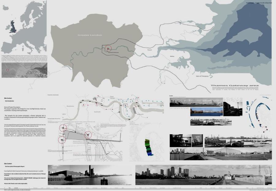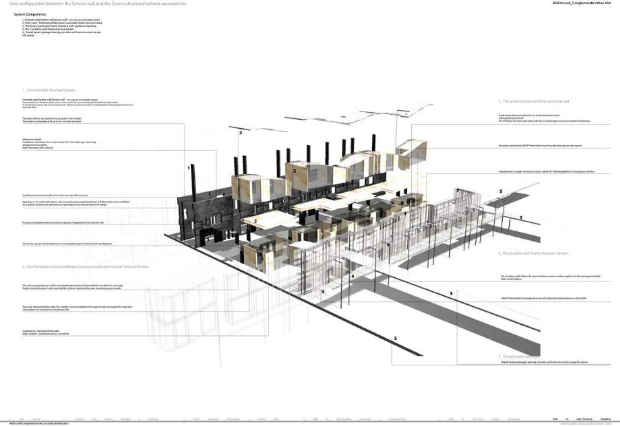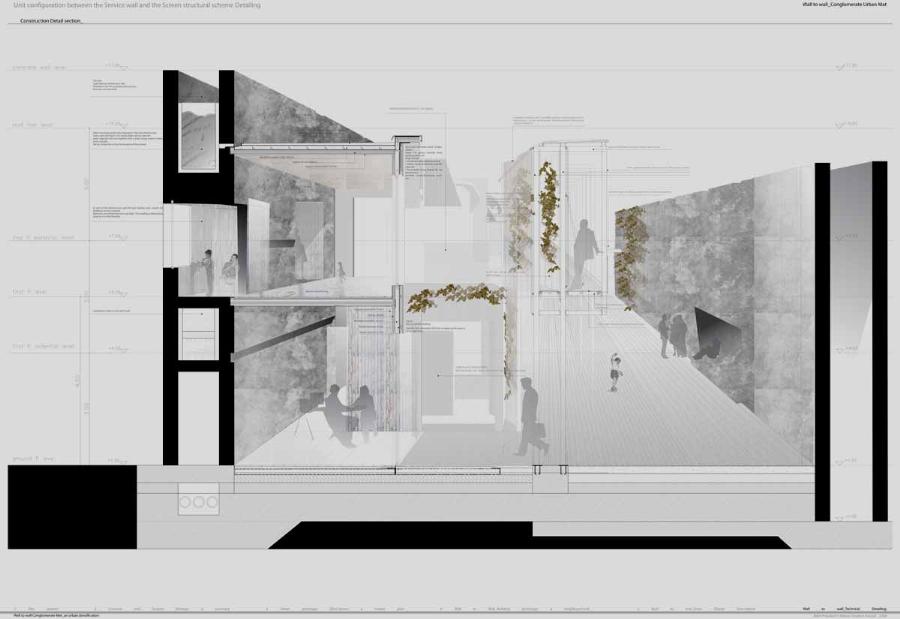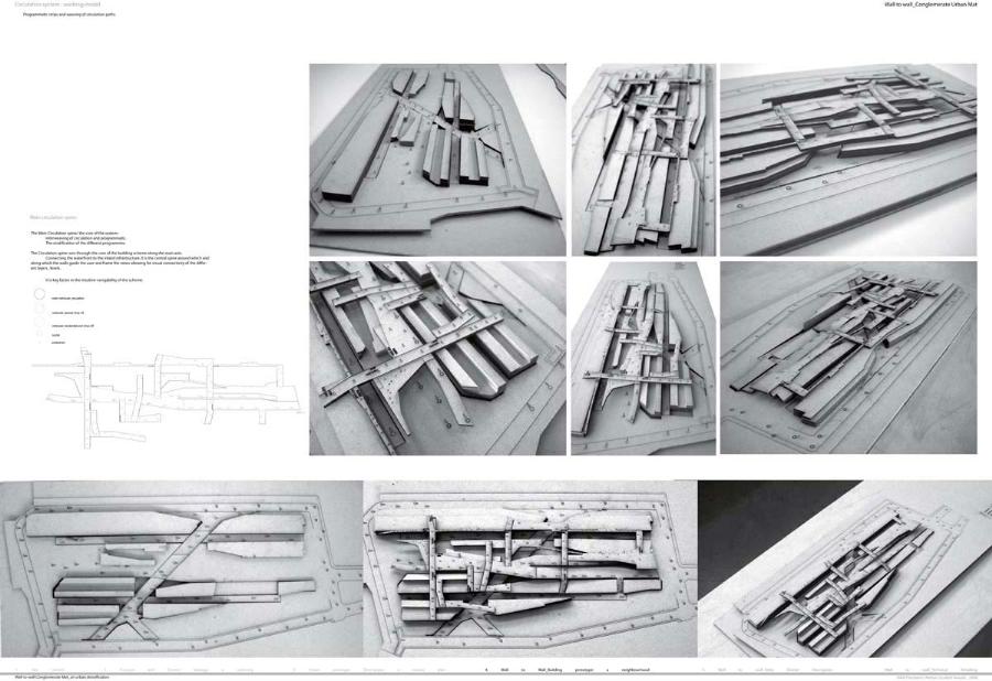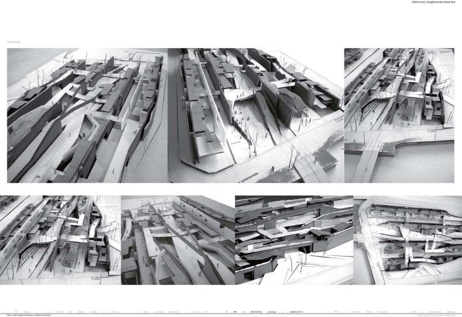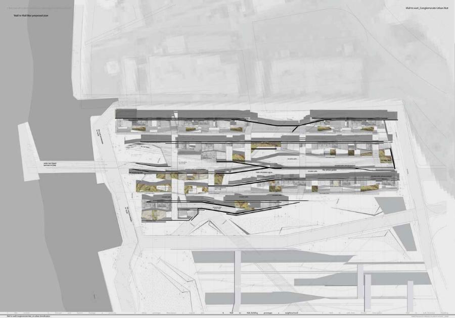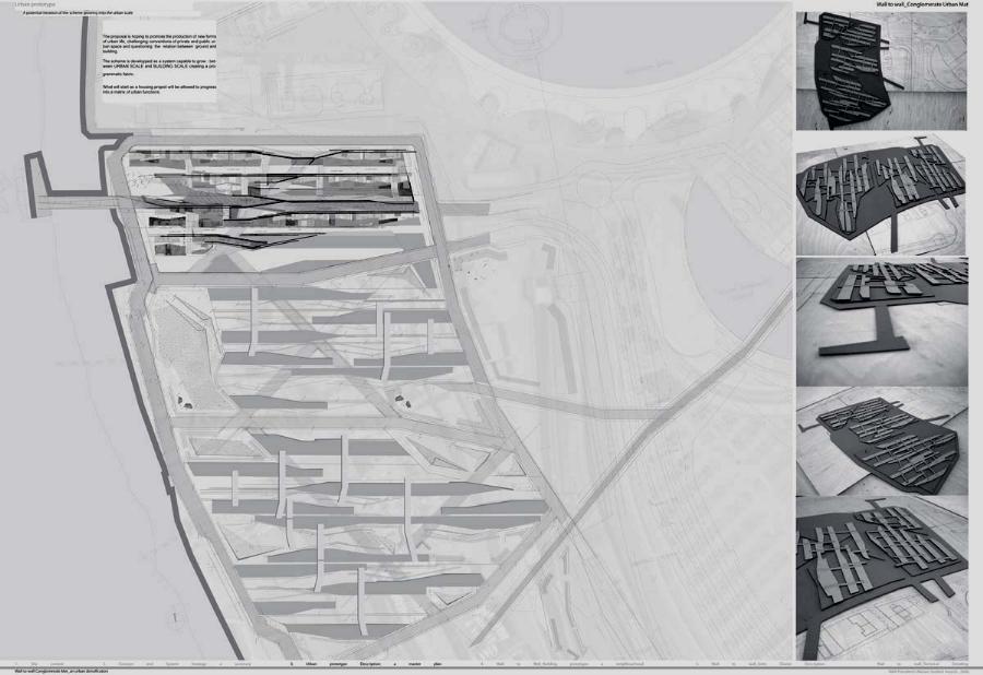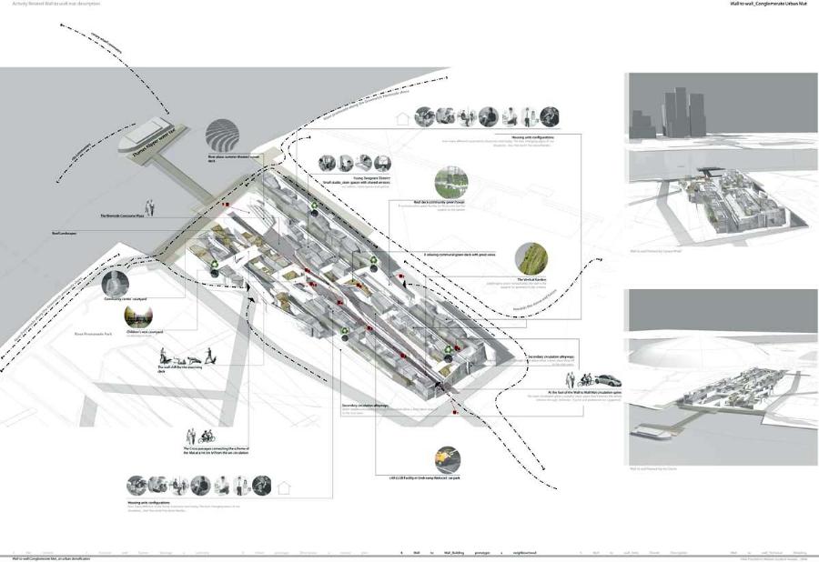 Wall to Wall Conglomerate Urban Mat Part 2 Project 2008 Irene Benjumea University of East London London | UK This project explores the potential of Compactness and Mixed-use scheme Vs uncontrollable sprawl for the creation of new residential urban forms.On a 1ha site in London’s Greenwich Peninsula, the project scrutinizes and tests the typology of the mat-building and the principals of conglomerate ordering: two ideas theorized by Alison and Peter Smithson in the 70’s.As a malleable structure of striated programmatic strips the mat formation has the ability to facilitate the adaptability of different programmatic units over time mainly through densification, subdivision and shrinkage. The elements of the system follow a formal sequence: the Service Wall+ the Housing Units plugged into the wall + Screen Wall adapted to establish different degrees of privacy. Once, London’s urban life gravitated around the embankments of the River Thames. Today that life has mostly disappeared allowing for a landscape of luxury apartment blocks to monopolize the riverfront producing a monoculture of dormitories. Irene’s design of a prototypical urban community proposes a more diverse and sustainable alternative. A new form of Densification.Her proposal argues that these low-rise & high-density structures provide the programmatic mix and a degree of metabolic autonomy that are necessary in the production of a vibrant urban community. Irene’s proposal is projective promoting the production of new forms of urban life, challenging conventions of private and public urban space and contesting the ground versus building dichotomy.