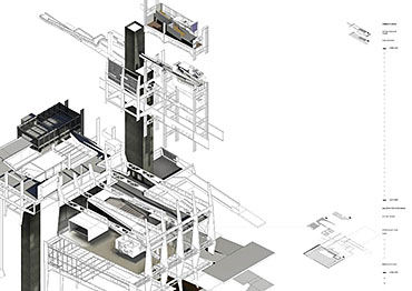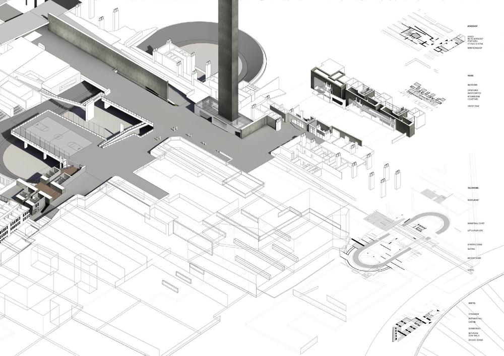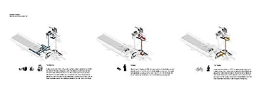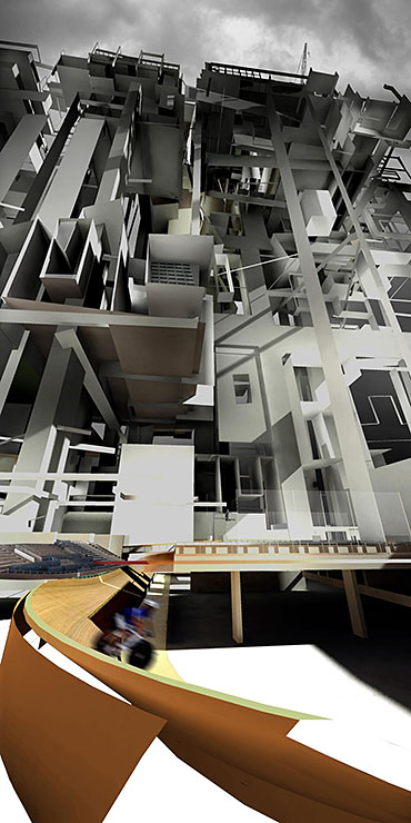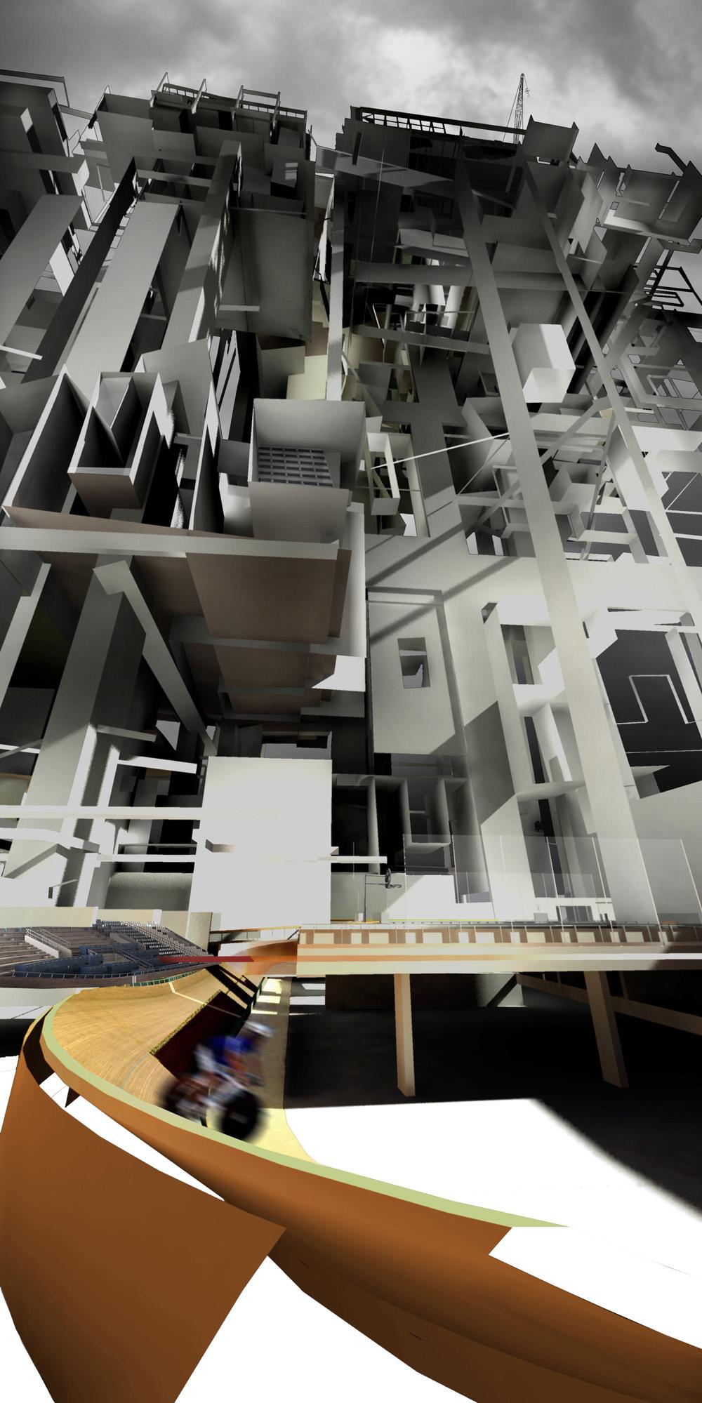 The result is a hyper-dense high-rise structure that challenges the existing typologies of architectural form and organization. Funicular-like lifts and ramping streets act as an extension of urban infrastructure - a three-dimensionally planned part of the (pre)existing city - and allows for the possibility for varied journeys and urban scenarios. The program includes a new velodrome, a community centre, a youth hostel and an exhibition gallery which create focal points in the project’s complex tectonic. Here, every citizen of Warsaw has the right to live in one of the available houses, free of charge, for one year in his or her life.