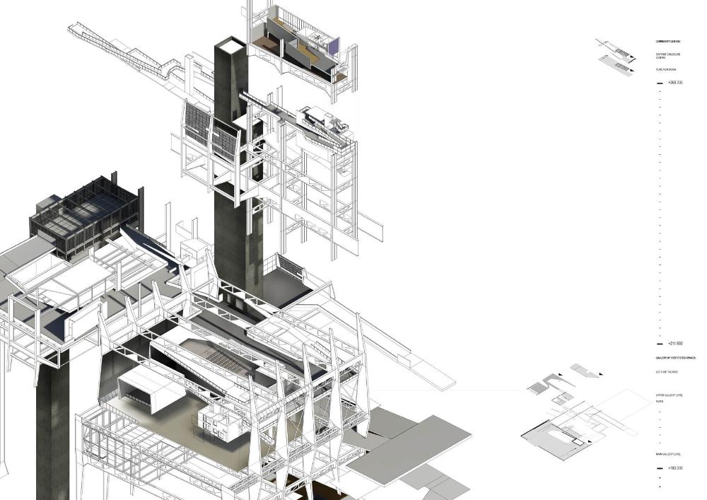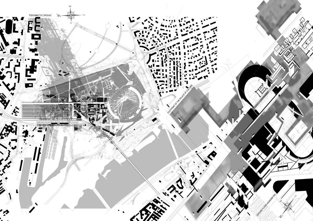 The project explores this question from the other side of the river at the point from which the height of the Palace was defined by its architect. The project’s form was generated through a process of enfolding the Palace with a map-like topography in which the urban fabric that was destroyed to make the Palace returns in a virtual form.