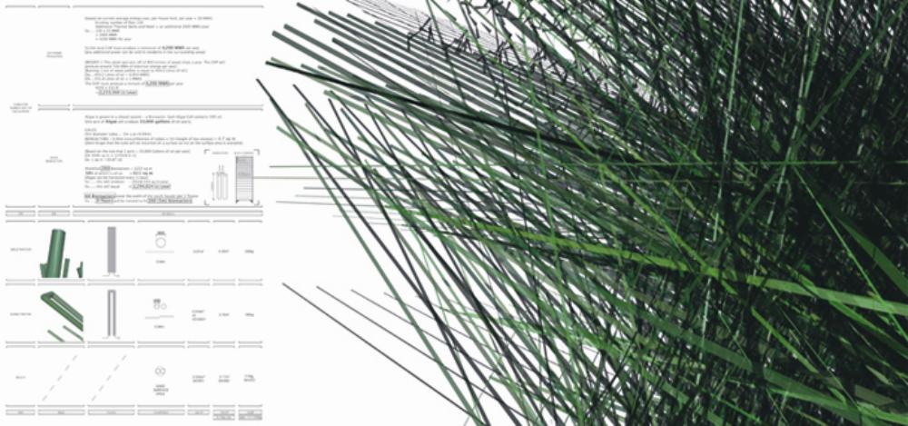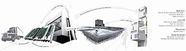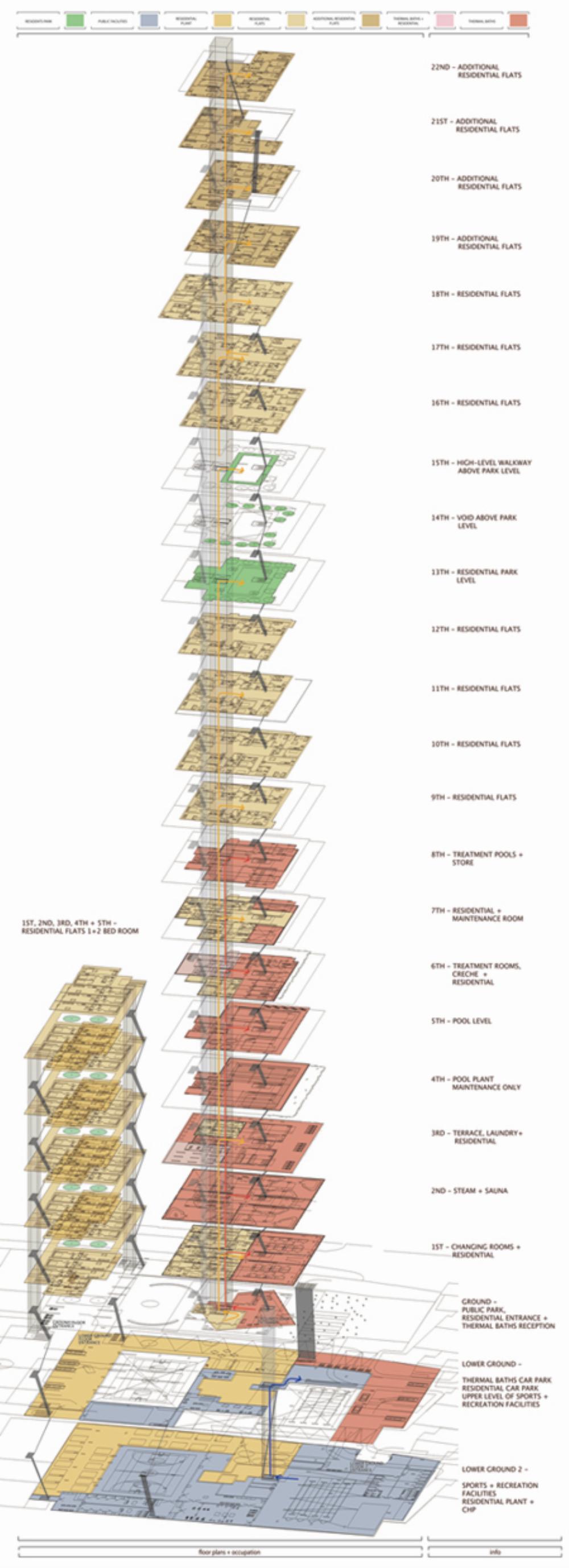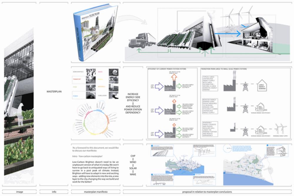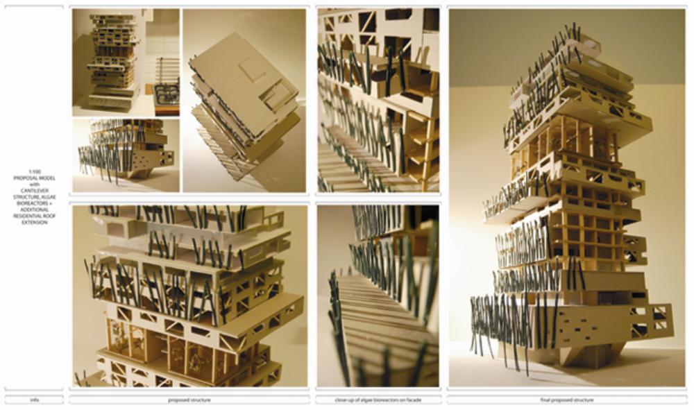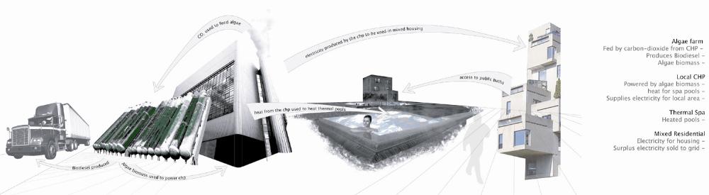 Algae Power Station Part 2 Project 2009 Stuart Paine University of Brighton | UK In a world where the vast majority of the existing housing stock is poorly insulated and therefore energy hungry, it is important to work with existing buildings as well as produce more energy efficient developments. There is increasing concern that current energy, food, water, transportation and waste trends need to be rationalised. Both ‘building’ and ‘community’ need to adapt to a more socially responsible future.The proposal is to retro-fit the existing residential tower and create a new public thermal baths for the residents with the addition of onsite algae + CHP (combined heat and power) power production. The two main areas; thermal baths and residential units will coexist and have shared spaces for both parties to use. The studio produced a low-carbon masterplan for Brighton in which my specific area of study was ‘Power’ (heat and energy). In this chapter I explored the use of algae biomass as an alternative and efficient way of producing fuel. As solar energy capture in the form of photovoltaics has proven to be quite inefficient, I have developed further the concept of harvesting the suns energy in the form of growing algae in bioreactors.The facade of the block will be modified to accommodate algae bioreactors for algae biomass production. The biomass will be used by the CHP to produce heat and electricity for the residential units. A CHP works by burning fuel to producing electricity, during this process hot water is constantly produced, much like the combustion engine. The idea is that as the residents use the electricity the additional hot water that is produced can be used in the thermal baths as a useful ‘heat sink’.As a structural strategy the existing concrete frame building will have select areas of its brick infill façade removed and steel truss cantilevers inserted. This will create new external spaces for residents and terrace areas for the thermal baths. One of the most common problems with large towers is the lack of easily accessible external space. In addition to the terraces a high level park will be created, removing two floor plates will give the height needed for trees. Finally the cantilevers will be clad in timber and have surface mounted algae bioreactors fitted. For the last year our Studio (Unplugged) was focused upon the question of how the existing built environment will respond to and contribute towards a diverse, constructed ecology; a circular metabolism where towns and cities work in harmony with the natural world. The question of what activities (narratives), strategies, programmes, and technologies may need to be introduced to our existing built environments and communities to ensure that they become viable circular metabolisms has occupied Stuart and his ‘Unplugged’ colleagues for the last two years. Therefore Stuart has been charged to work with existing communities and infrastructures. Drawing upon resent undertaken by organisations such as Bioregional, Prof. David McKay and Bill Addis (among others) Stuart and his colleagues developed a comprehensive Sustainability Master Plan for Brighton. Having undertaken this broad study Stuart then focused on a much-derided (by the local community & City Council) in 1960’s tower block in the North Laines area of Brighton. His ambition was to prove that this large lump of unloved accommodation and mass concrete gas-guzzler could be transformed into a mixed-used socially inclusive mini power station and viable community asset.Stuart approached his studies in an extremely ambitious and rigorous manner. His understanding of the real potentials of this typical 1960’s tower has allowed him to propose a project that integrates well with the existing structural and cultural fabric, while at the same time providing additional programme, accommodation and brand new emerging technologies. The problem of how a tower block hits the ground by proposing a park that folds into a community spar and sports facility. Stuart’s ability to develop his thesis through many different media has been particularly impressive and a pleasure to witness. His has also undertaken first-hand research and to applied this to a given reality in an imaginative way. Stuart’s thesis has considered one of the biggest questions that not only our profession, but our society as a whole has to find answers to, that of transforming our fossil fuel dependant societies into low impact ones. Stuart provides an extremely convincing glimpse of what our immediate future may look like. Tutor(s) Duncan Baker-Brown