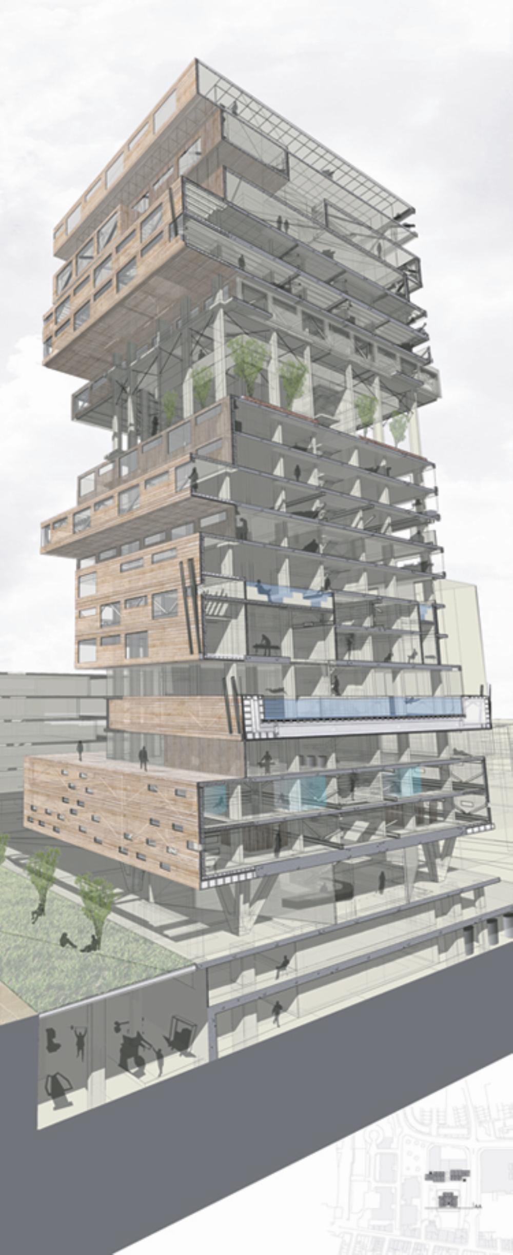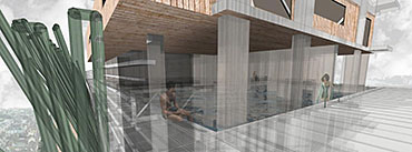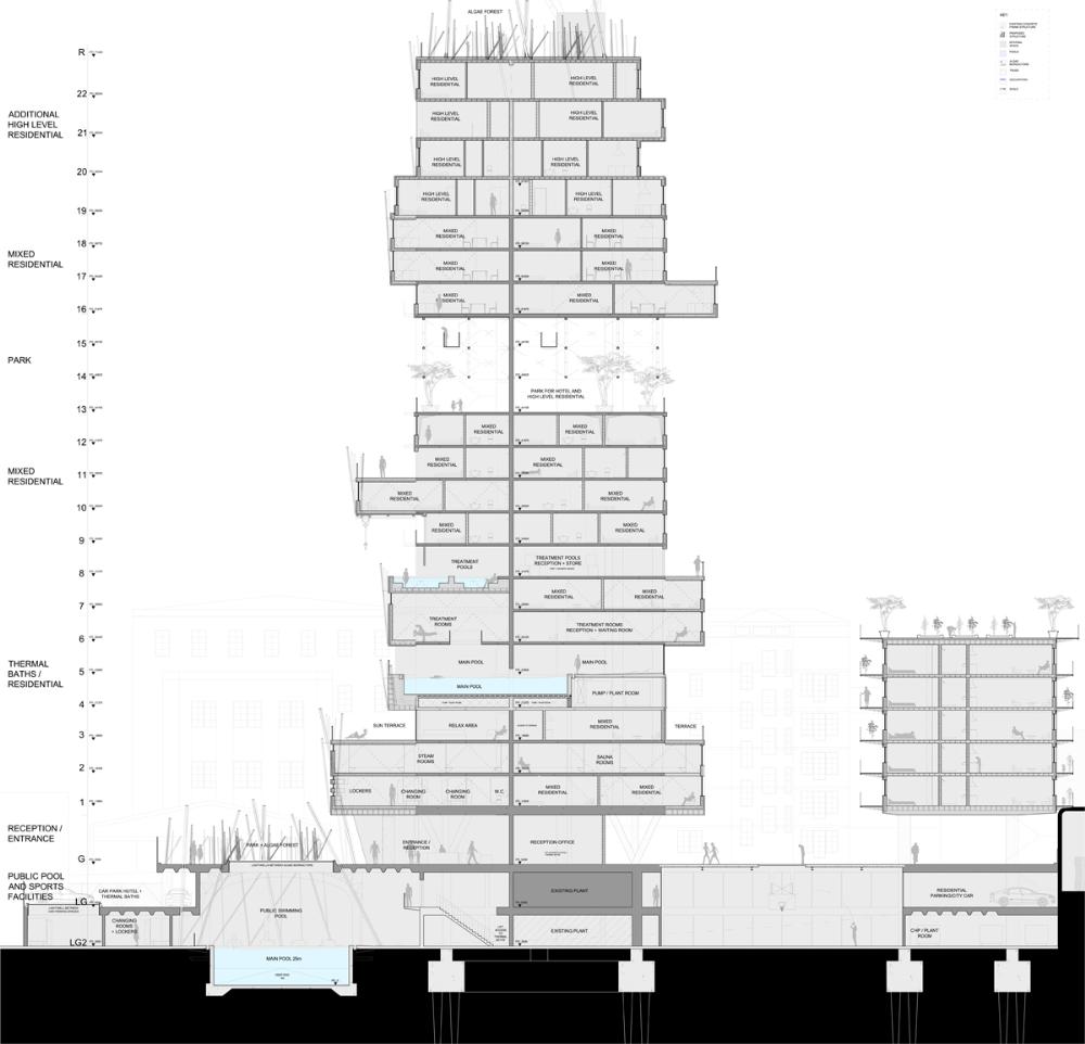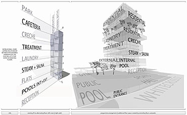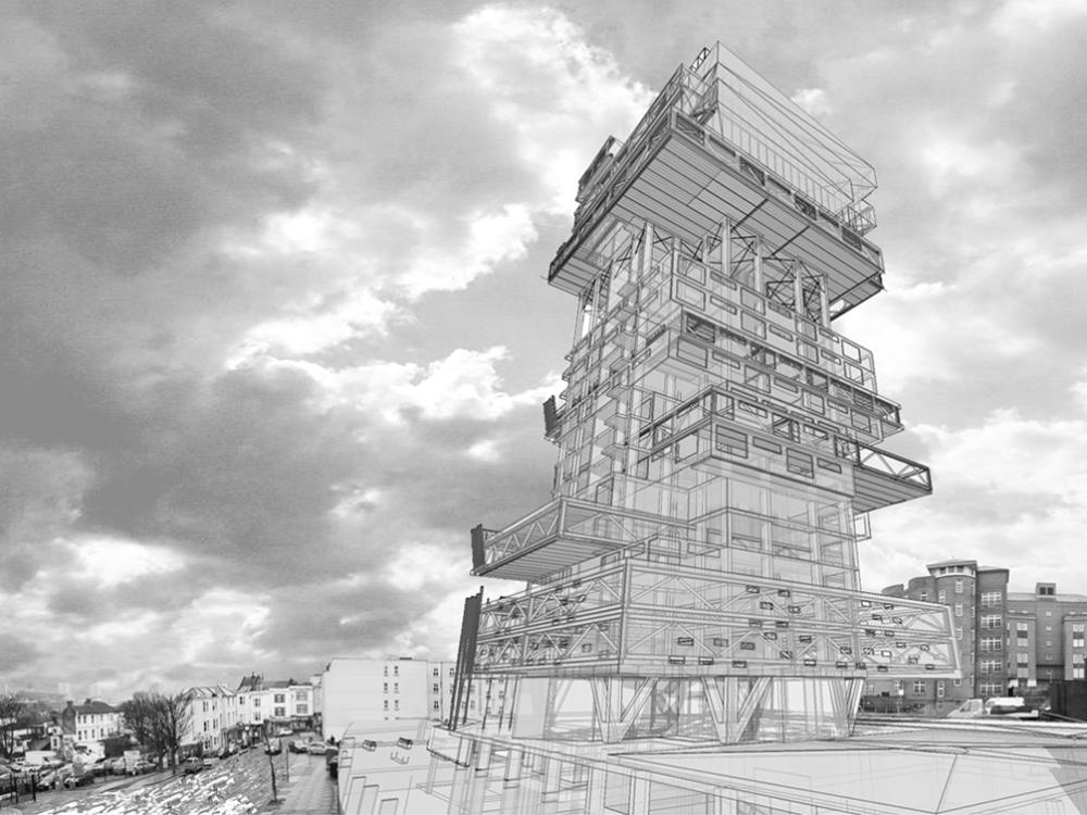 Algae Power Station Part 2 Project 2009 Stuart Paine University of Brighton | UK In a world where the vast majority of the existing housing stock is poorly insulated and therefore energy hungry, it is important to work with existing buildings as well as produce more energy efficient developments. There is increasing concern that current energy, food, water, transportation and waste trends need to be rationalised. Both ‘building’ and ‘community’ need to adapt to a more socially responsible future.The proposal is to retro-fit the existing residential tower and create a new public thermal baths for the residents with the addition of onsite algae + CHP (combined heat and power) power production. The two main areas; thermal baths and residential units will coexist and have shared spaces for both parties to use. The studio produced a low-carbon masterplan for Brighton in which my specific area of study was ‘Power’ (heat and energy). In this chapter I explored the use of algae biomass as an alternative and efficient way of producing fuel. As solar energy capture in the form of photovoltaics has proven to be quite inefficient, I have developed further the concept of harvesting the suns energy in the form of growing algae in bioreactors.The facade of the block will be modified to accommodate algae bioreactors for algae biomass production. The biomass will be used by the CHP to produce heat and electricity for the residential units. A CHP works by burning fuel to producing electricity, during this process hot water is constantly produced, much like the combustion engine. The idea is that as the residents use the electricity the additional hot water that is produced can be used in the thermal baths as a useful ‘heat sink’.As a structural strategy the existing concrete frame building will have select areas of its brick infill façade removed and steel truss cantilevers inserted. This will create new external spaces for residents and terrace areas for the thermal baths. One of the most common problems with large towers is the lack of easily accessible external space. In addition to the terraces a high level park will be created, removing two floor plates will give the height needed for trees. Finally the cantilevers will be clad in timber and have surface mounted algae bioreactors fitted. For the last year our Studio (Unplugged) was focused upon the question of how the existing built environment will respond to and contribute towards a diverse, constructed ecology; a circular metabolism where towns and cities work in harmony with the natural world. The question of what activities (narratives), strategies, programmes, and technologies may need to be introduced to our existing built environments and communities to ensure that they become viable circular metabolisms has occupied Stuart and his ‘Unplugged’ colleagues for the last two years. Therefore Stuart has been charged to work with existing communities and infrastructures. Drawing upon resent undertaken by organisations such as Bioregional, Prof. David McKay and Bill Addis (among others) Stuart and his colleagues developed a comprehensive Sustainability Master Plan for Brighton. Having undertaken this broad study Stuart then focused on a much-derided (by the local community & City Council) in 1960’s tower block in the North Laines area of Brighton. His ambition was to prove that this large lump of unloved accommodation and mass concrete gas-guzzler could be transformed into a mixed-used socially inclusive mini power station and viable community asset.Stuart approached his studies in an extremely ambitious and rigorous manner. His understanding of the real potentials of this typical 1960’s tower has allowed him to propose a project that integrates well with the existing structural and cultural fabric, while at the same time providing additional programme, accommodation and brand new emerging technologies. The problem of how a tower block hits the ground by proposing a park that folds into a community spar and sports facility. Stuart’s ability to develop his thesis through many different media has been particularly impressive and a pleasure to witness. His has also undertaken first-hand research and to applied this to a given reality in an imaginative way. Stuart’s thesis has considered one of the biggest questions that not only our profession, but our society as a whole has to find answers to, that of transforming our fossil fuel dependant societies into low impact ones. Stuart provides an extremely convincing glimpse of what our immediate future may look like. Tutor(s) Duncan Baker-Brown