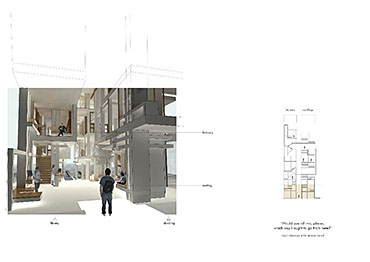 The Depository Part 1 Project 2009 Mariska Schreuder University of Greenwich | UK The Depository‘Things which aren’t books but are often met with in librariesPhotographs in gilded brass frames, small engravings, pen and ink drawings, dried flowers in stemmed glasses, matchbox holders containing, or not, chemical matches (dangerous), lead soldiers, a photograph…, postcards, dolls eyes, tins, packets of salt, pepper and mustard from Lufthansa, letter-scales, picture hooks, marbles, pipe cleaners, scale models of vintage cars, multicoloured pebbles and gravel, ex-votos, springs.’ Georges Perec, ‘Species of Spaces’Less frequently met with in libraries: A comfortable sofa, a three piece suite, snacks and drinks, a dining table set for 4, a kitchen with a well stocked fridge, a living room with a terrace, an ensuite bathroom with your own towels, a bedroom with built in wardrobe, a selection of shoes and overcoats, a birdcage, a smoking terrace equipped with plants and a view of the sea, unfoldable desks, unfoldable bridges, a pool with steps, water seats, high tide, bicycles, prefabricated dwelling units with a choice of exterior and interior finishes, the book you were actually looking for. Having identified these shortcomings in the design of libraries, I have attempted to solve the problem; and design a more satisfactory library. The Depository‘I alone have more memories than all mankind has probably had since the world has been the world’. And again: ‘my dreams are like you peoples waking hours.’ And again, towards dawn: ‘my memory, sir, is like a garbage heap. (Borges, Labyrinths)The pleasure of finding a book in a library comes more from the discovery of an unexpected title than from the efficient find. Mariska starts with the problem of the lost book and how it may migrate through the library classifications, resulting in strange literary encounters. These encounters at the scale of the object are then persued as spatial encounters at the scale of the institution. She imagines a library is discovered in an apartment block, as if it were a lost book. Her ‘Depository’ is not so much a place of order, but a place for unexpected opportunities and pleasures. Her library shifts from public to intimate space and back, as can happen in the chapters of a book or the scenes in a film, but rarely happens so abruptly in buildings. Walls and other physical boundaries normally separating the institution from the domestic realm are replaced with ‘unfoldable bridges’, ‘unfoldable desks’ and walk-in-wardrobes. Narratives keep shifting, beds slide into walls, walls become seats and desks. This is a process of constructive collision played out with architectural rigour. It is a clash of the mundane with the extraordinary, the library and the apartment becoming a sequence of spaces for adventure. Architecturally, constraints are converted into possibilities by allowing a certain level of permeability between programmes. We enjoyed playing Mariskas’ geometrical game where behaviour in a bookshelf is explored in a building: such that the behaviour of spaces and objects intermingle. Tutor(s)Mr Francois Girardin Raoul Kunz