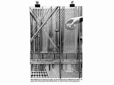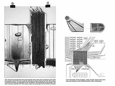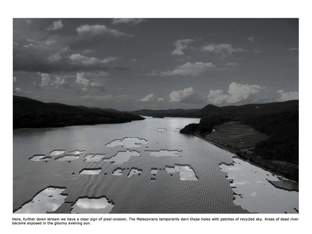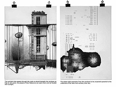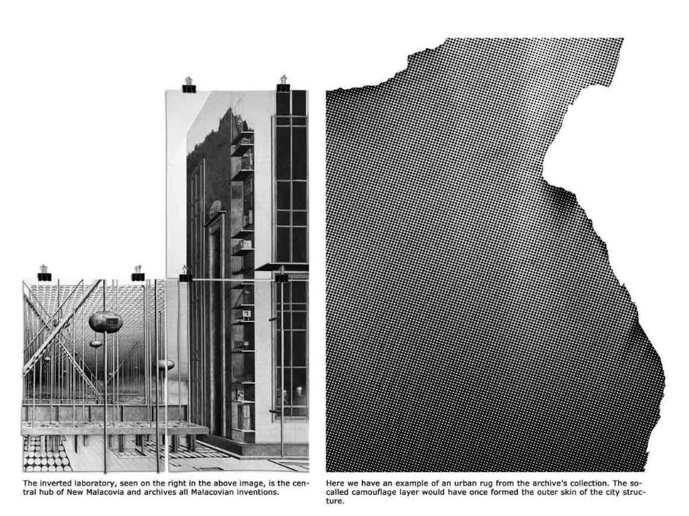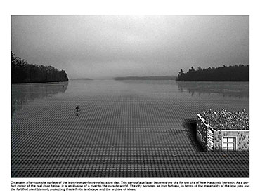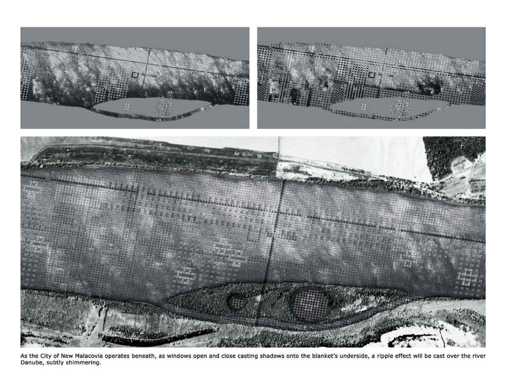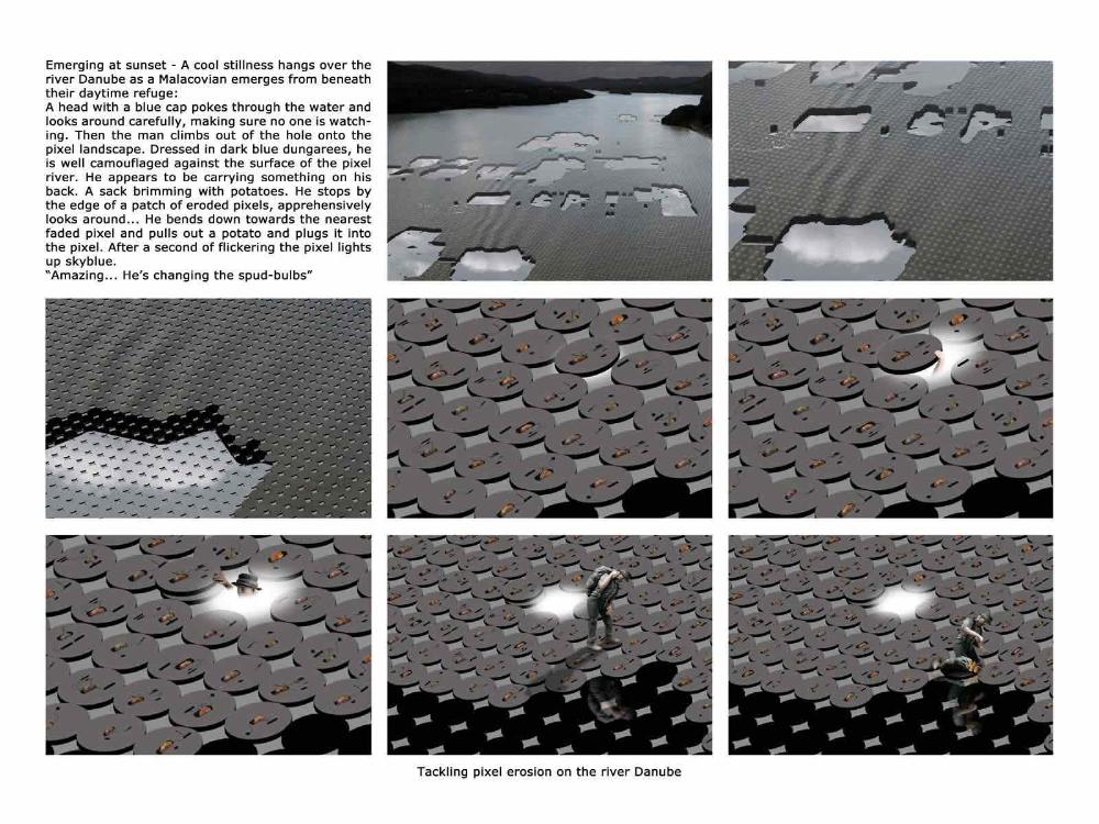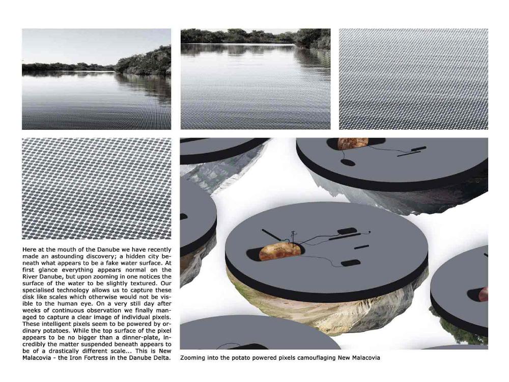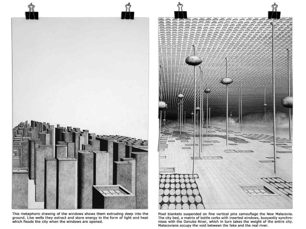 An intelligent recycling process selects appropriate urban and spatial ideas; environmental technologies and construction methodologies collectively evolve into the tectonic character of the city over time. Familiar everyday materials are used to perform unfamiliar architectural and urban tasks. The windows are the custodians of the city’s power, while the humble potatoes are used to harvest renewable energies. Pixel blankets of iron foil suspended on fine vertical sewing pins camouflage the New Malacovia. The city bed, a matrix of bottle corks, buoyantly synchronises with the Danube River, which in turn takes the weight of the entire city. The Malacovian community occupies the void created between the fake pixel-river and the real river.
