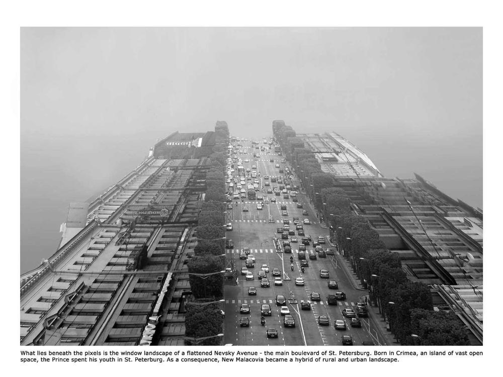 Born in Crimea, an island of rich pastures, the prince spent his youth in St. Petersburg. As a consequence, New Malacovia is a hybrid of rural and urban landscapes, acquiring distinct characteristics from both places. The city of New Malacovia is a vast prairie of windows, which mimic a flattened version of the main boulevard in St. Petersburg. The New Nevsky Avenue stretches to infinity in the river valley.