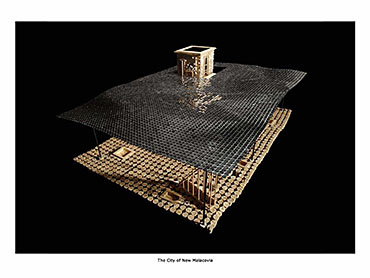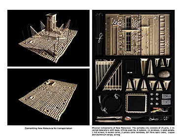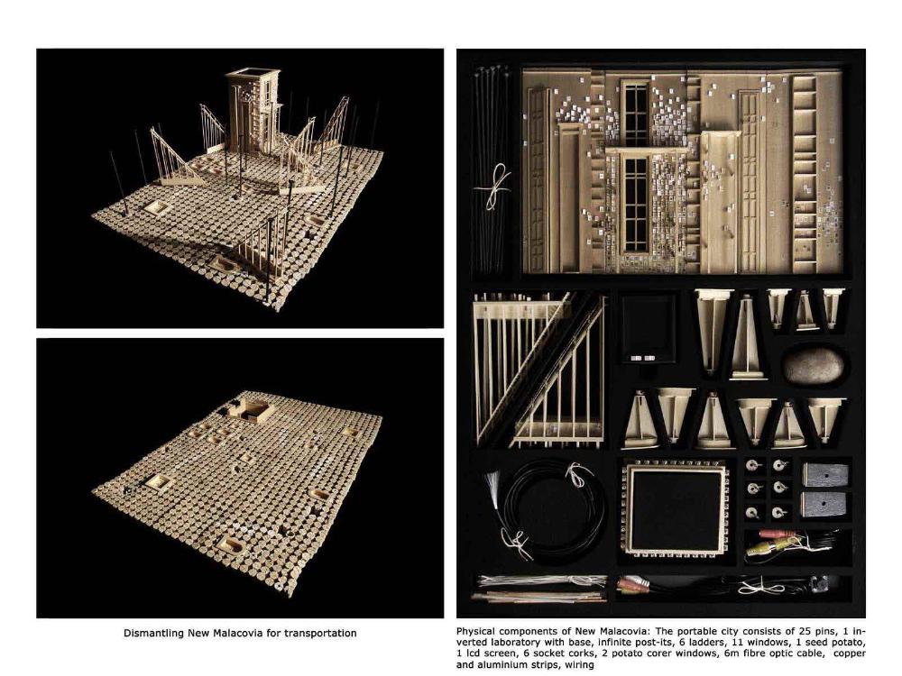 The research introduces a Nogai prince with his compatriots, settling in the Danube Delta, where they would rebuild their lost fatherland – New Malacovia. Malacovian settlements can be found across the world. They make their cities seamlessly invisible within our cities, they power their cities with potatoes, and occasionally a clue to the Malacovians existence is found within our familiar landscapes. The narrative shows us their furniture, the spaces of their cities, their customs and their stylistic concerns. New Malacovia is a vast prairie of windows with lyrical roots carrying heat and renewable energies to infinite pockets within the city. Legislated urban tectonic elements for New Malacovia include bottle corks, sewing pins, potatoes, and blankets of iron foil pixels. “Post-it” notes communicates the community’s ideas for living: planning and design of the city are delivered by all, no longer the exclusive. As the narrative unfolds the last “reveal” we suddenly become aware that the model we are looking at is not a model at all – it is the city.