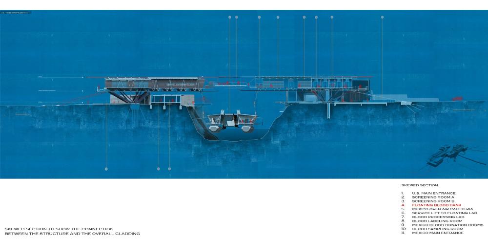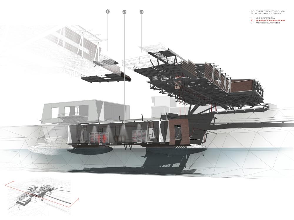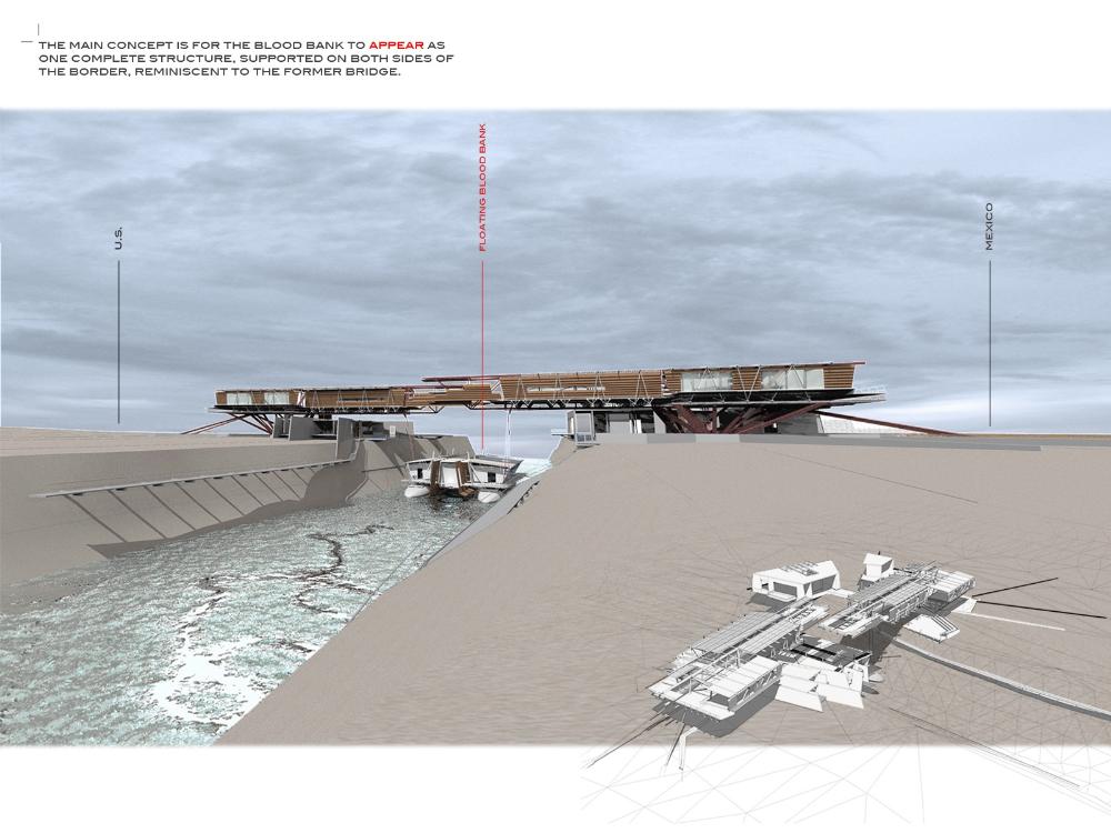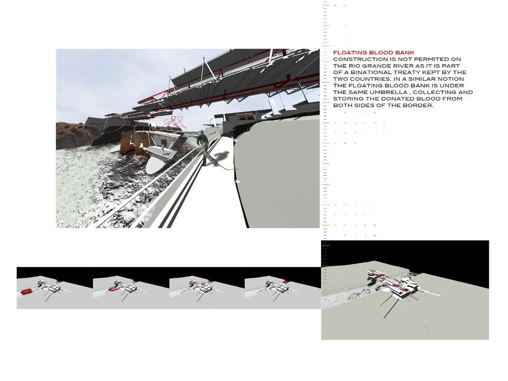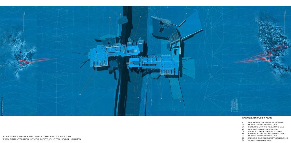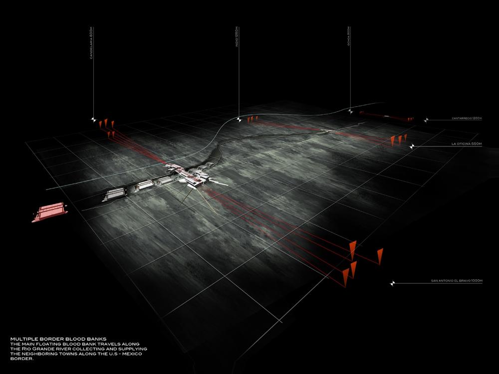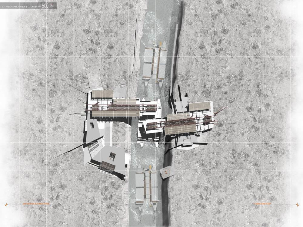 Border Blood Bank Part 1 Project 2009 Victor Hadjikyriacou The Bartlett School of Architecture, UCL | UK " The only way the cities in this region can make it, is to forget that a line and a river exist here.” ( former Ciudad Juarez mayor Gustavo Elizondo) On the boundary of the state of Texas, a small bridge was created by two bordering communities, Candelaria (U.S.) and San Antonio el Bravo (Mexico). It became a symbol of trade, where the two small towns would exchange goods, such as fuel, postal services, medication and education, thus transforming them into one bilateral community. In June 2008 the bridge was taken down by the U.S. Border Patrol, thus breaking the link between these two communities. The aim of the project is to reunite the two communities by providing a blood bank facility which is accessed by both sides. Due to the strict border controls and national planning regulations the program has to be split into two separate buildings. However, the air above the site is not governed by these restrictions and is considered as a “no mans land” without any jurisdiction. This offers the potential to create a structure that cantilevers over the border, above the Rio Grande. Taking this notion and creating a cantilevered building achieves a visual link, reminiscent of the old bridge that used to connect the two neighbouring communities. The proposed Blood Bank provokes a feeling of weightlessness being supported on thin umbrella like foundations, only lightly touching the ground on each side of the border. At ground floor level, on each side, donors register and give samples of blood to see if they are eligible to donate. Approved donors then proceed to the cantilever level where they donate blood in specified blood group donation rooms. From there the blood is labelled, packaged and lowered, via a complex pulley system, down to the floating blood bank, below in “no mans land”. The bank accommodates laboratories for blood processing and a central independent cooling room for storage. This river barge then moves along the Rio Grande to supply other communities with its valuable life saving commodity. Victor Hadjikyriacou’s work probes the topics of international boundary lines and cross-border migration with sensitivity and intelligence. His proposal for a blood bank straddling the Mexico/US Texan border tests delicate socio-political matters and presents an elegant and considered architectural response to current issues of frontier and national identity.Sited on either side of the Rio Grande, the proposal is articulated as two separate facilities that hover above the borderline, reaching towards each other but without touching. His thorough investigation into cantilever technology allows him to resolve the structure as a broken bridge, a clear metaphor for the legal schism between the two communities. A floating storage vessel inhabiting the ‘no man’s land’ of the river bed, overcomes the legal constraints and distribute the precious blood to Mexican and Americans alike, suggesting ‘racial mixing’ as a subversive strategy to blur the territorial demarcation.Addressing primal human needs, but deploying highly engineered solutions, the project is represented to encompass this dichotomy; a combination of orthogonal projection drawings that resemble ‘basic’ architectural blueprints combined with sophisticated rendered axonometric.This is a lyric proposal that raises more questions than it answers. Tutor(s) Julia Backhaus Pedro Font Alba