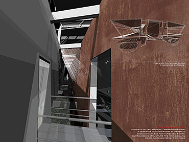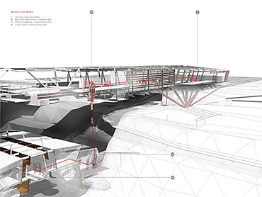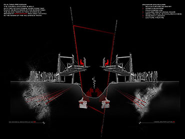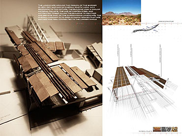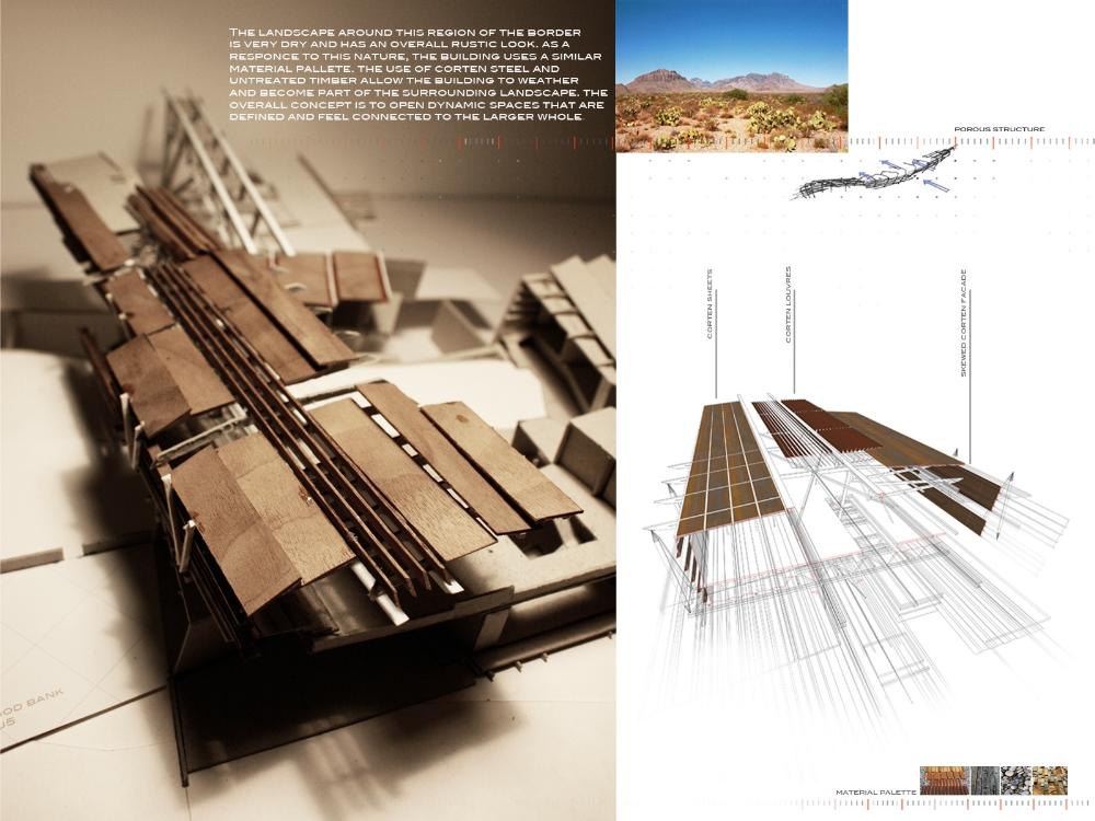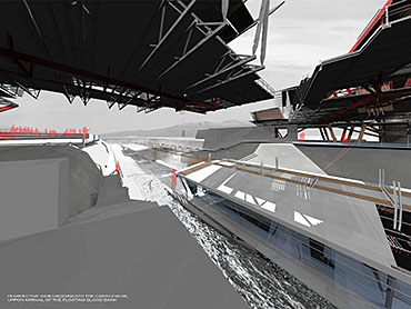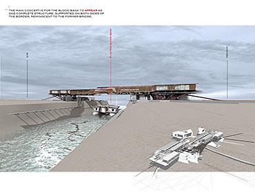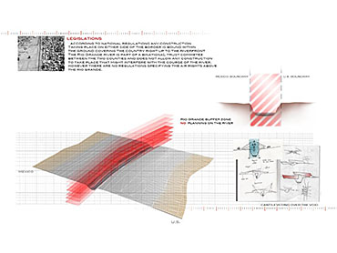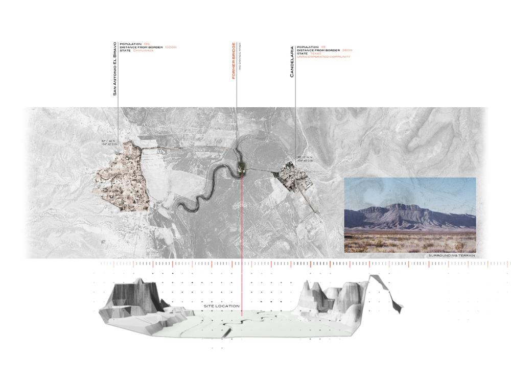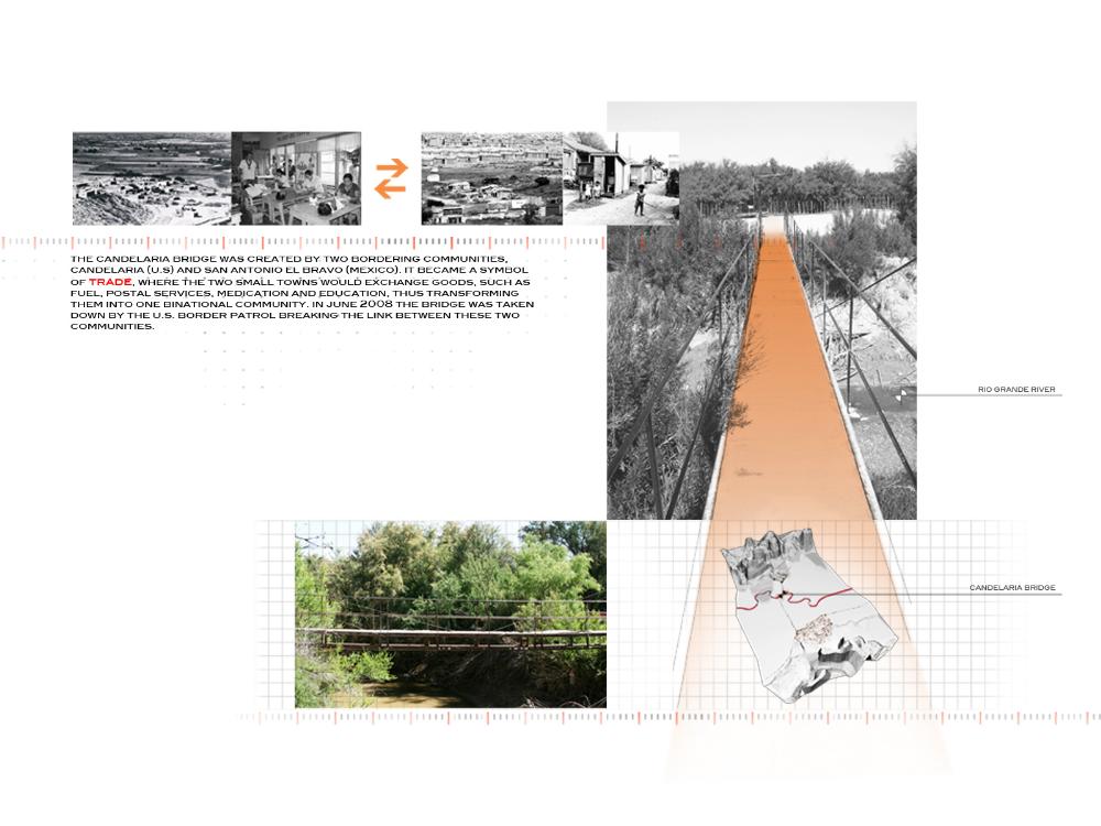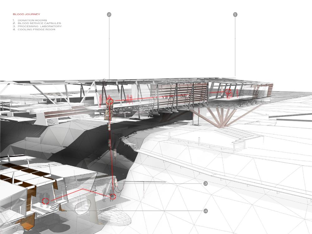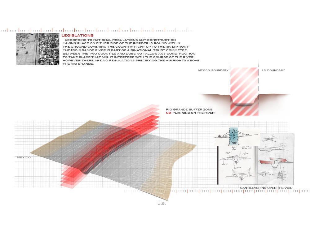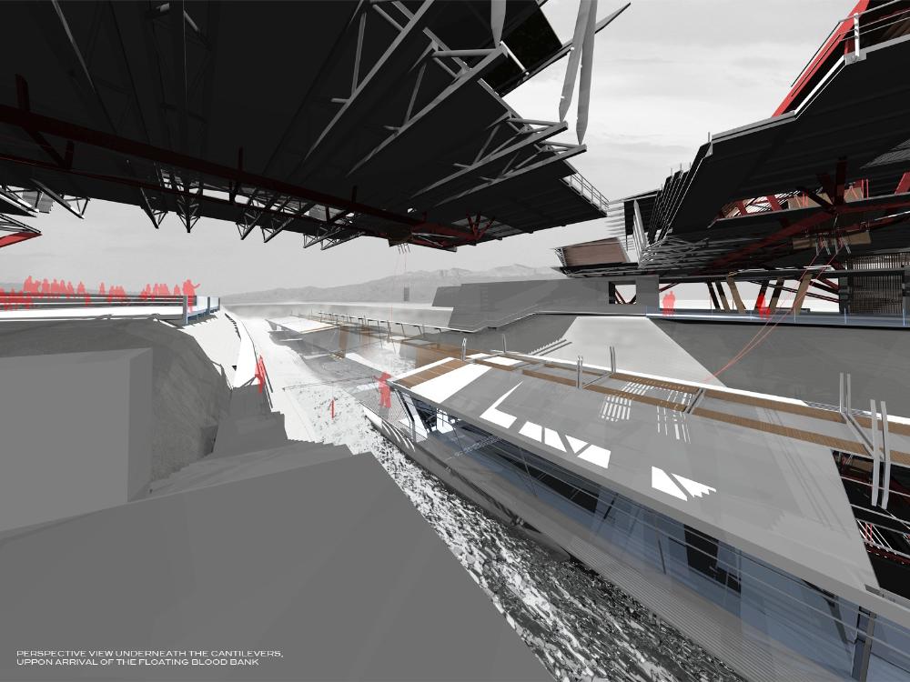 Border Blood Bank Part 1 Project 2009 Victor Hadjikyriacou The Bartlett School of Architecture, UCL | UK " The only way the cities in this region can make it, is to forget that a line and a river exist here.” ( former Ciudad Juarez mayor Gustavo Elizondo) On the boundary of the state of Texas, a small bridge was created by two bordering communities, Candelaria (U.S.) and San Antonio el Bravo (Mexico). It became a symbol of trade, where the two small towns would exchange goods, such as fuel, postal services, medication and education, thus transforming them into one bilateral community. In June 2008 the bridge was taken down by the U.S. Border Patrol, thus breaking the link between these two communities. The aim of the project is to reunite the two communities by providing a blood bank facility which is accessed by both sides. Due to the strict border controls and national planning regulations the program has to be split into two separate buildings. However, the air above the site is not governed by these restrictions and is considered as a “no mans land” without any jurisdiction. This offers the potential to create a structure that cantilevers over the border, above the Rio Grande. Taking this notion and creating a cantilevered building achieves a visual link, reminiscent of the old bridge that used to connect the two neighbouring communities. The proposed Blood Bank provokes a feeling of weightlessness being supported on thin umbrella like foundations, only lightly touching the ground on each side of the border. At ground floor level, on each side, donors register and give samples of blood to see if they are eligible to donate. Approved donors then proceed to the cantilever level where they donate blood in specified blood group donation rooms. From there the blood is labelled, packaged and lowered, via a complex pulley system, down to the floating blood bank, below in “no mans land”. The bank accommodates laboratories for blood processing and a central independent cooling room for storage. This river barge then moves along the Rio Grande to supply other communities with its valuable life saving commodity. Victor Hadjikyriacou’s work probes the topics of international boundary lines and cross-border migration with sensitivity and intelligence. His proposal for a blood bank straddling the Mexico/US Texan border tests delicate socio-political matters and presents an elegant and considered architectural response to current issues of frontier and national identity.Sited on either side of the Rio Grande, the proposal is articulated as two separate facilities that hover above the borderline, reaching towards each other but without touching. His thorough investigation into cantilever technology allows him to resolve the structure as a broken bridge, a clear metaphor for the legal schism between the two communities. A floating storage vessel inhabiting the ‘no man’s land’ of the river bed, overcomes the legal constraints and distribute the precious blood to Mexican and Americans alike, suggesting ‘racial mixing’ as a subversive strategy to blur the territorial demarcation.Addressing primal human needs, but deploying highly engineered solutions, the project is represented to encompass this dichotomy; a combination of orthogonal projection drawings that resemble ‘basic’ architectural blueprints combined with sophisticated rendered axonometric.This is a lyric proposal that raises more questions than it answers. Tutor(s) Julia Backhaus Pedro Font Alba