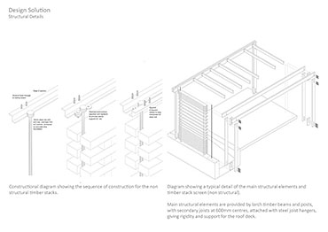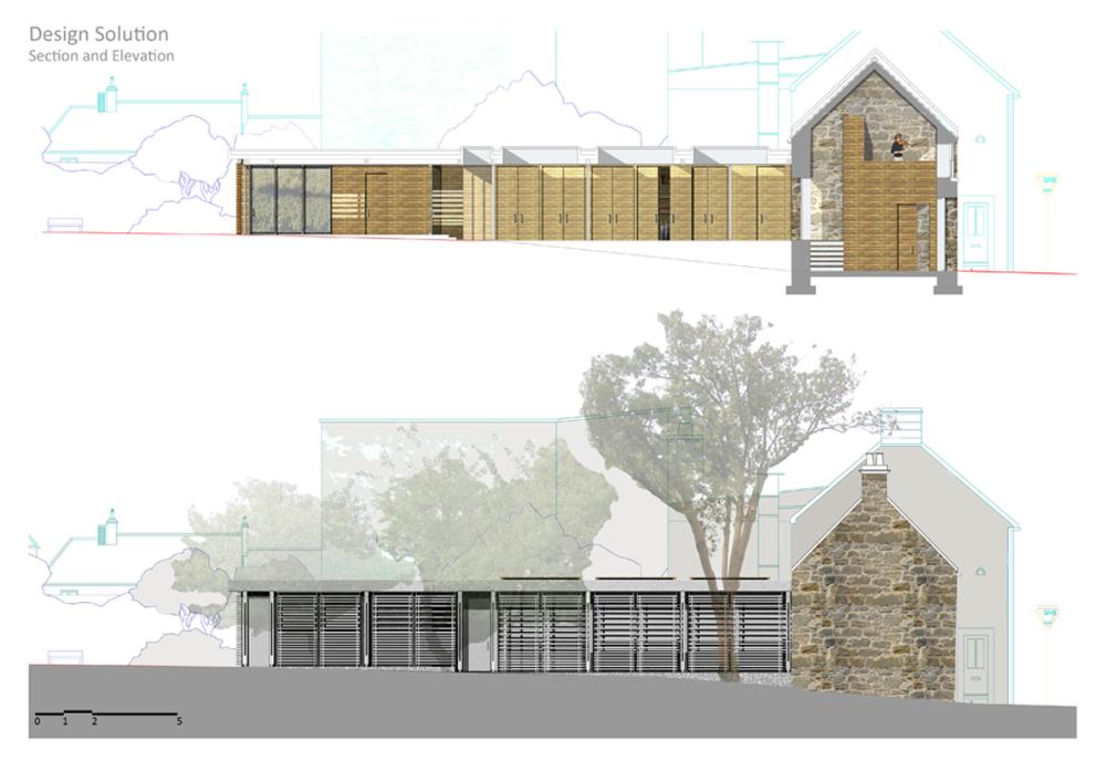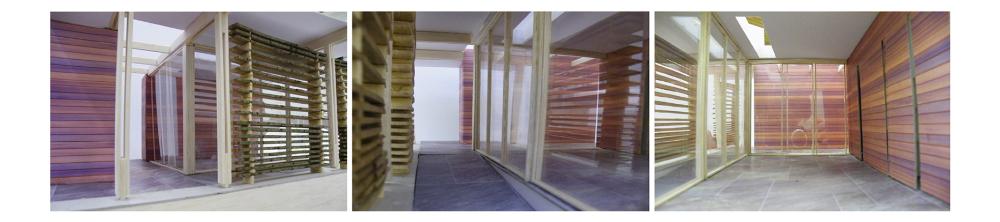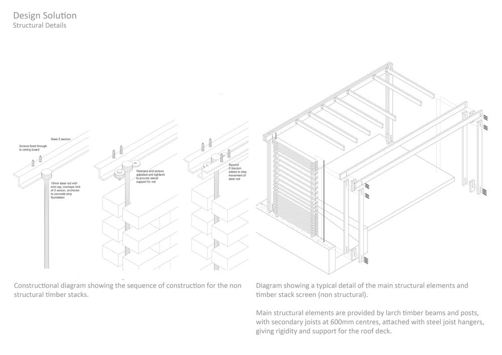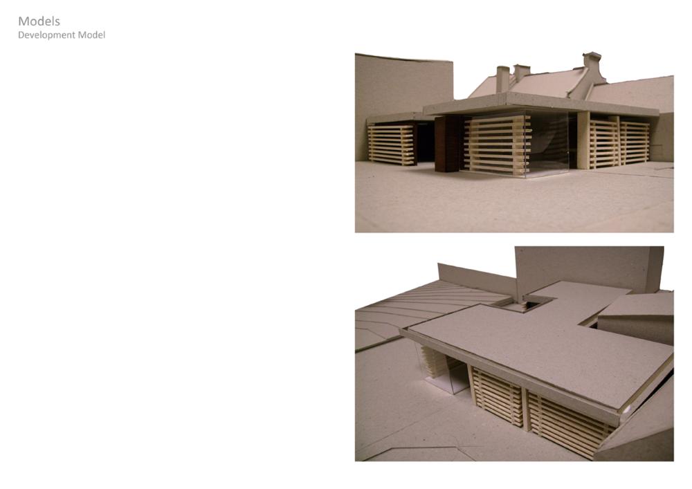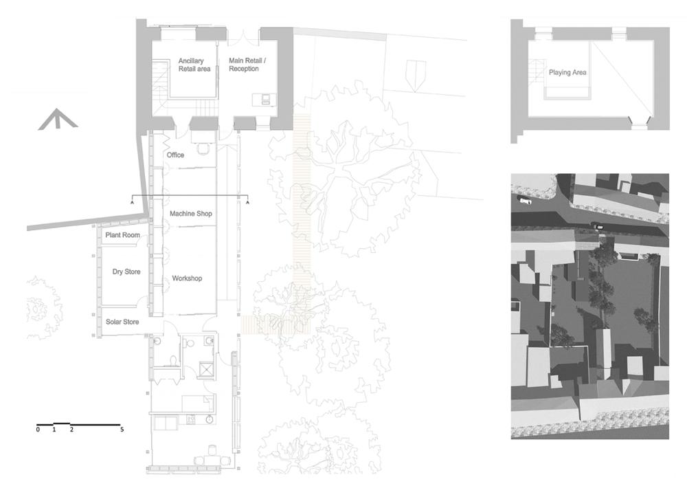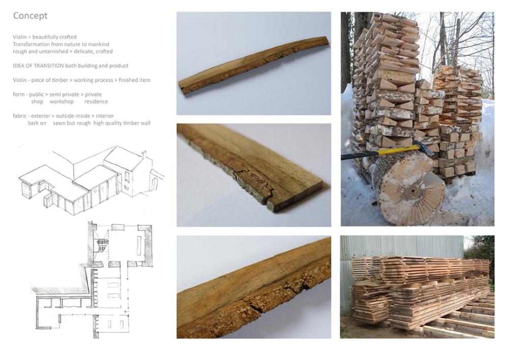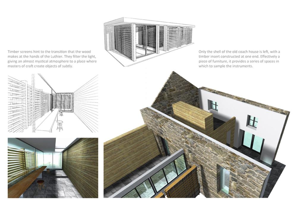 Luthiers Workshop Part 1 Project 2009 Jonathan Mennie Robert Gordon University | UK The skill of the luthier is one of careful precision, delicate touch and a mastery of understanding the material. The manipulation of the wood, from rough sawn wedges through to the highly finished violins and cellos, can take a lifetime to perfect and is a craft to be respected.This project involved creating a work and retail space for a 3 person collaboration of violin makers from a Grade III listed sandstone coach house and back garden in St Andrews, Fife. The inner floors and walls are stripped to leave a double height space and exposed rafters into which a timber insert is placed to provide an upper minstrels gallery and retail space beneath. One wall is left unplastered, revealing the exposed inner sandstone wall. Leading from the retail space is an external corridor, leading to work and living quarters, that passes behind a screen of stacked through-and-through cut timber held in place by wires suspended from a roof overhang.Inspiration for the extension is a direct response to the manipulation of wood and the making of violins, whereby wedges of timber are glued together and carved out. Through-cut sections are stacked on top of one another to form “screens” between workshop and garden. The exterior face of the timber is left rough, retaining the bark and moss that existed when the timber was cut, giving the facade a raw exterior presence. The interior face is sawn, and the treatment of these stacks hint to the transition the timber makes at the hands of the luthier. The spaces created between the stacks work together with roof lights to provide a delicate illuminance to the workspace behind. Wood stores and a small residence face onto an intimate private courtyard and continue the idea of the timber stacks.The building as a whole is sensitive to the surroundings and its scale, portraying an almost untreated natural facade to counteract the visual impact of a new build. Year 3 Scott Sutherland School of Architecture + Built Environment Year 3 at the Scott Sutherland School of Architecture encourages the students to think in an integrative manner about design and technology, bringing it together as the ‘Art of Building’. The academic year is divided into two semesters and two distinct projects. The first introduces the student to working with existing building fabric. They are asked to adopt a craft sensibility, an intimate reflection on anthropometrics and the interpretation of a complex brief, this year, a Luthier’s workshop and residence in St.Andrews / Scotland. Tutor(s) Samuel PennMr Iain Ramsay