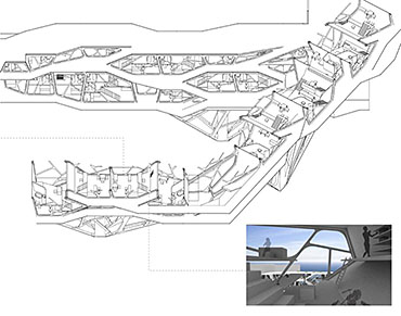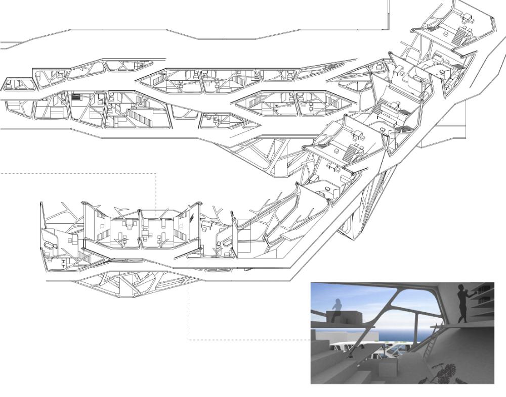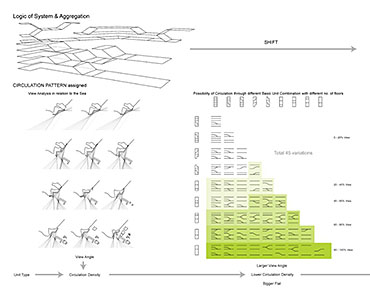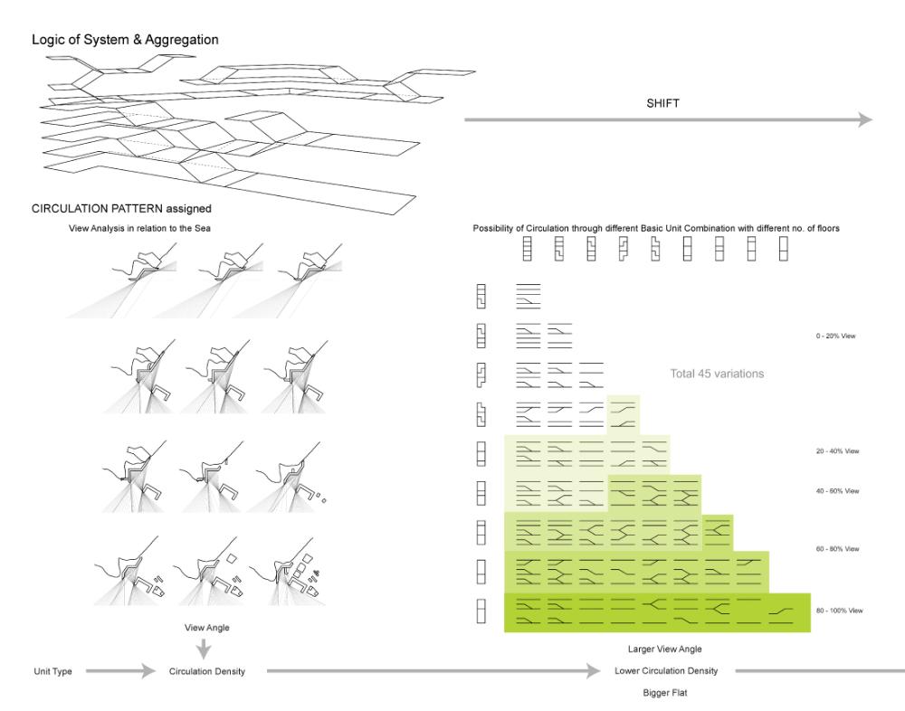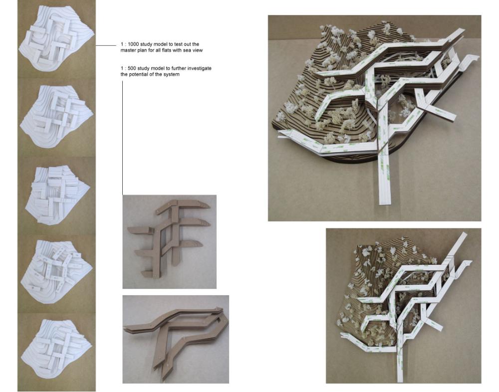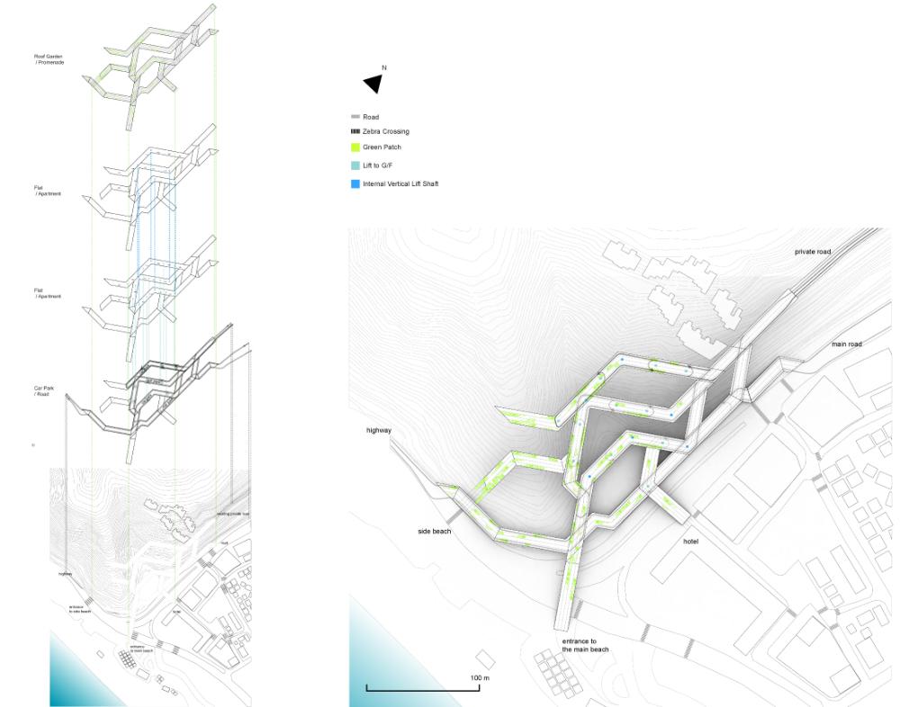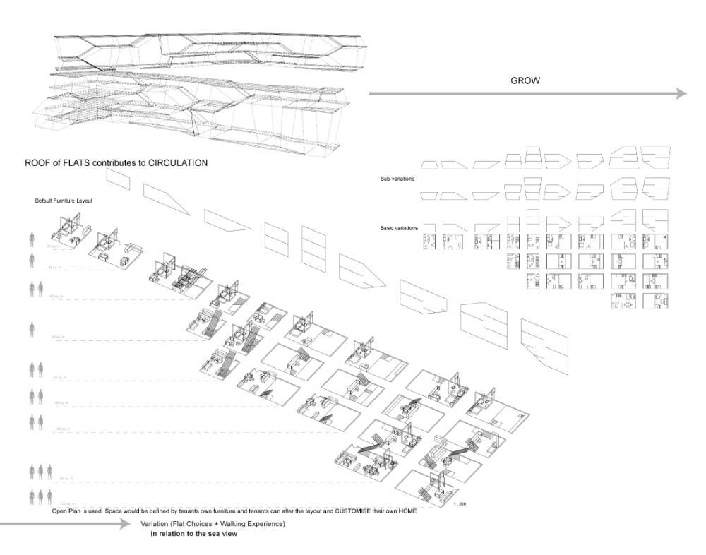 The goal is to formulate a system that has the flexibility to accomodate a variety of life-styles and living requirements with unique roaming experience that responds to the the ocean view. Furthermore, rather than creating a separate, alien living ecology, mutualism is proposed between the housing system and the city i.e. the city provides the housing with supporting programs (eateries, shops, entertainments etc.) while the housing serves as a new piece of recreational ground and a complementary linkage within the city.