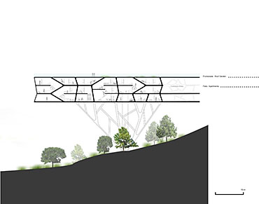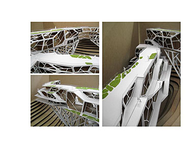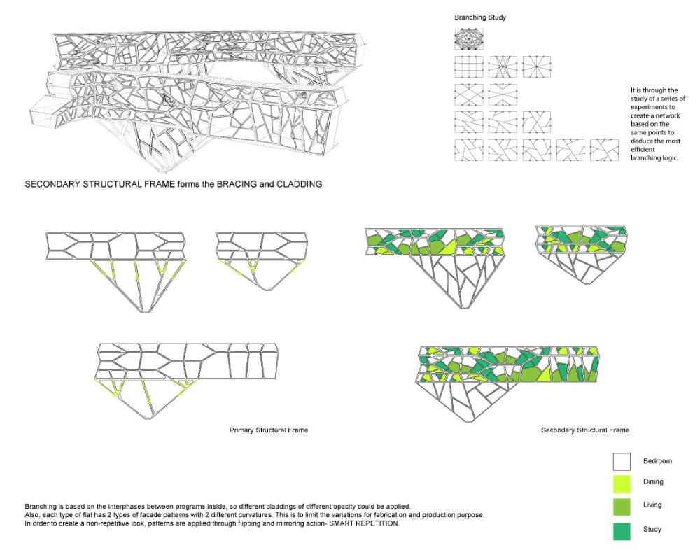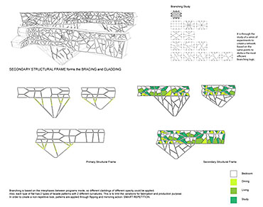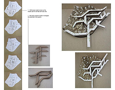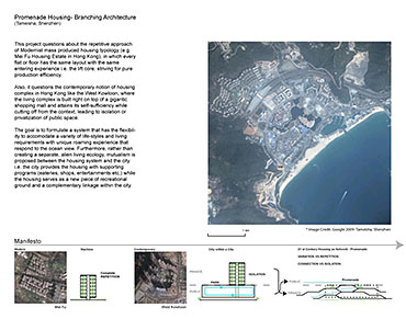 The project entitled “Promenade Housing” and submitted by Wesley Ho Hung Lai represents a very sophisticated piece of architectural work. Challenging repetitive, homogenous and profit-driven approaches in conventional housing developments it proposes a new experimental prototype for twenty-first century living based on the concept of Mass Customised Housing. The site for this project is situated on a challenging hill in Dameisha Beach, Shenzhen, China. The scheme is based on a bifurcating branching system that serves as the governing principle on multiple levels of the architectural design. Through the utilization of this diagram the project achieves an exceptional integration of structural, organisational, formal and circulatory principles. The meandering formation highly integrates into the topographical site gradient and provides a great level of interaction with the environment. The design is delicately investigated through drawings and experimental study models and represents an excellent understanding and utilization of contemporary computational design tools and CAD-CAM fabrication techniques.