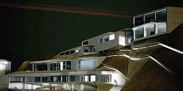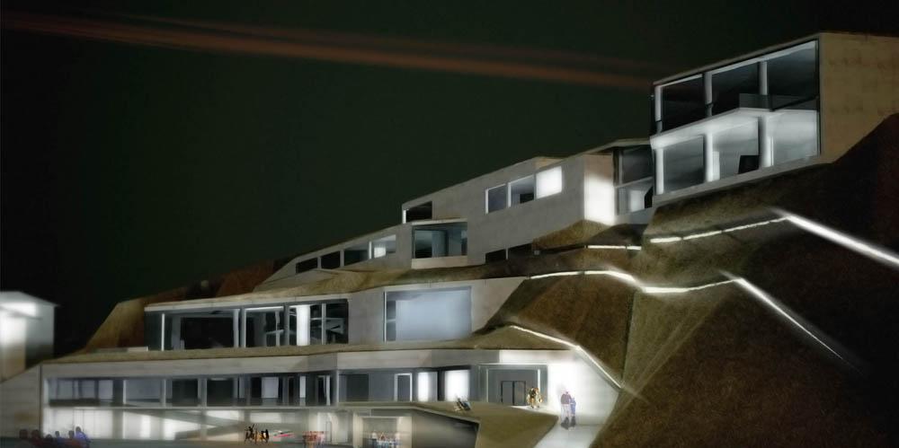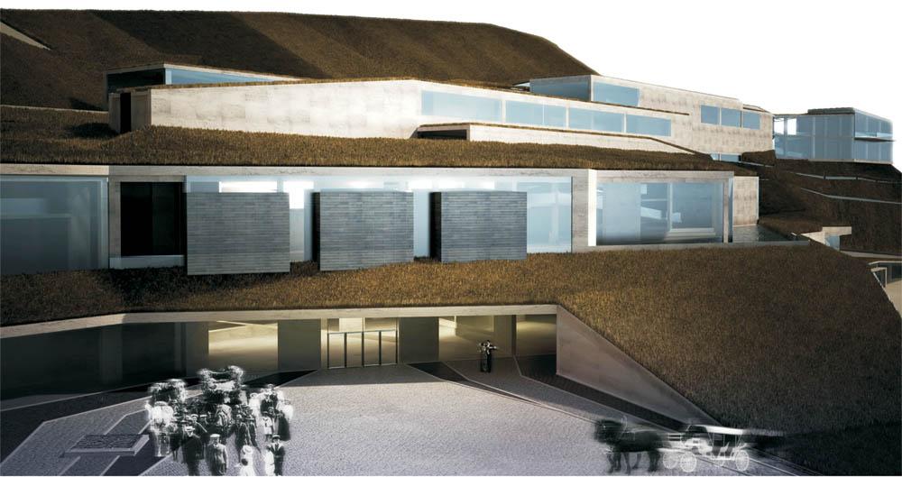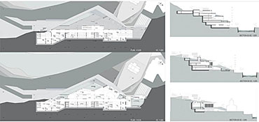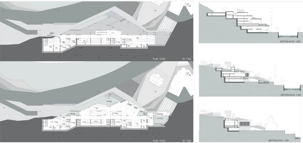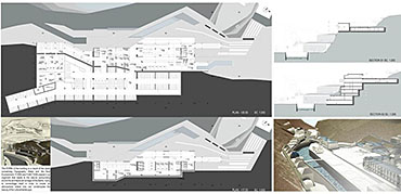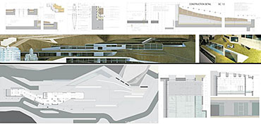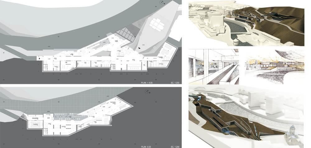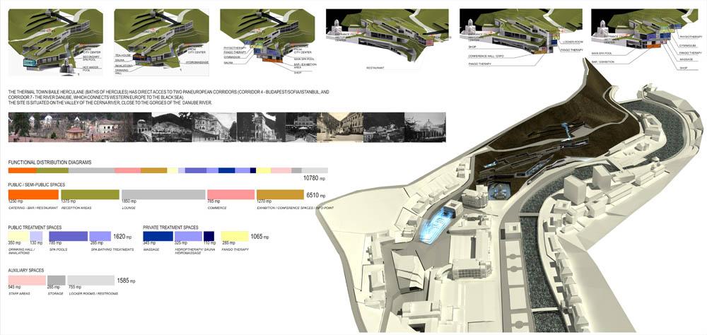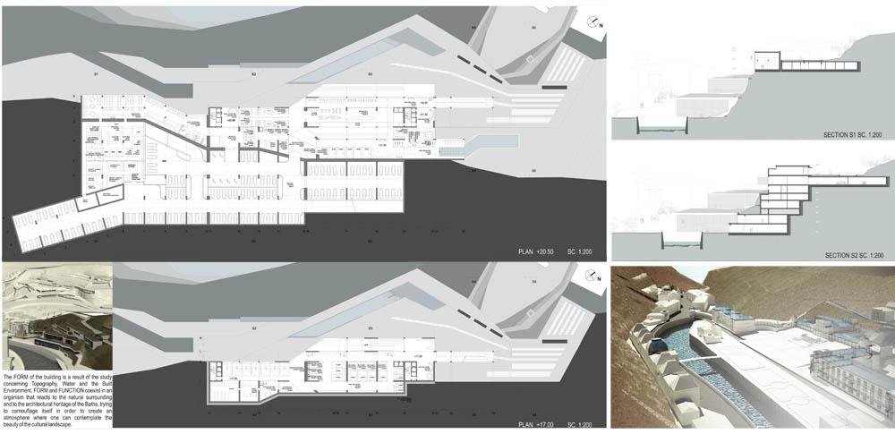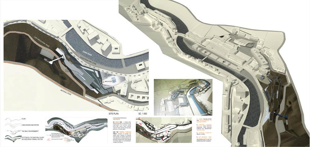 Thermal Baths, Baile Herculane Part 2 Project 2010 Iulia Maria Delcea Ion Mincu University of Architecture and Urbanism | Romania The site is situated in the valley of the Cerna River, close to the gorges of the Danube. The thermal town Baile Herculane (Baths of Hercules) has direct access to the Pan-European corridors: 4 (Budapest/Sofia/Istanbul) and 7 – the Danube River.The healing qualities of the water were first discovered by the Romans, who founded the town and built the first bathhouse, which can still be visited nowadays. After the retreat of the Roman legions, the baths were abandoned, but the town flourished again centuries later, when the region became part of the Austrian-Hungarian Empire. Its heyday was the late 19th century, during the reign of Emperor Franz Joseph, when the current historical center was defined. During the communist regime, this great heritage was disregarded and a new large-scale urban center was built, gradually transforming the historical area into a forgotten place. Today, because of the bad management, the whole city is in need of a strategic intervention.The envisioned program contains two dimensions: - An urban one: a step-by-step intervention meant to reactivate and complement the existing urban structure. A public-private partnership sustains the development steps: (1) rehabilitation and reconversion of the Casino into a cultural center; (2) new thermal complex + hotel, (3) theater + exhibition halls and artist housing generating a cultural pole; (4) city museum + new outdoor public pool; (5) housing.- The scale of the thermal complex itself, designed to extend the urban fabric towards the modern town center, to create a new plaza that enhances the space around the church, and to encompass the whole variety of contemporary thermal treatments.The design is the result of the need to find a dialogue between pre-existing and new, topography and the built environment. Its form is generated by the water flow, the tectonics, natural slope and vistas towards the historical center.The object is mostly underground, has one façade that opens towards the waterfront and the urban landscape, and, in terms of sustainability, produces low costs of construction and maintenance.In order to create a special atmosphere, local stone is used, along with scenographic skylights. The key feature of this diploma project is the respect towards both natural and anthropic environment. The great heritage of the town and of the cultural landscape demanded a very subtle intervention, in order to preserve the existing synergy of both architecture and nature. The merit of the design lies in a careful and sensitive approach towards the context, a well studied, balanced negotiation of the site’s characteristics, resulting in an outstanding project.The student’s preoccupation towards the historical context and the tradition of thermal baths has been well appreciated, as it generated a documented and keen approach, a thorough design that takes into account all the features of contemporary spa treatments. The minimal, but complex design of the interior spaces proves a sensitive attitude towards the programme.Moreover, one very important aspect is the global implication of the project, the fact that it is directly connected to the main European networks and the fact that it uses an important natural water course as a catalyst, an essential feature of many contemporary urban developments across Europe.The project is very effective in terms of sustainability, as it has a low impact on the natural terrain and the urban landscape. At the same time, it embraces a full range of activities that will guarantee its efficiency on the urban scale.I strongly recommend the project as a very good urban strategy towards the rehabilitation and reactivation of an abandoned, historical town, and also for its beautiful architectural design. Tutor(s) Professor Phd. Arch. Stef Scafa Udriste