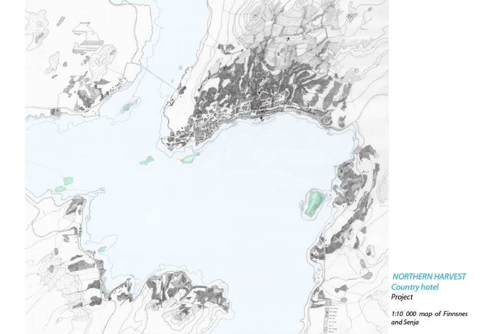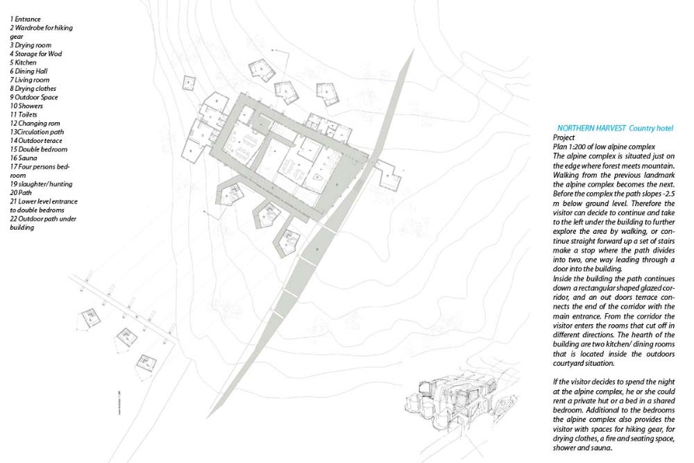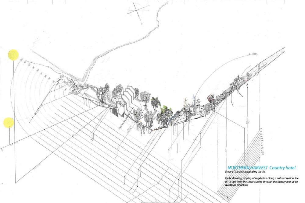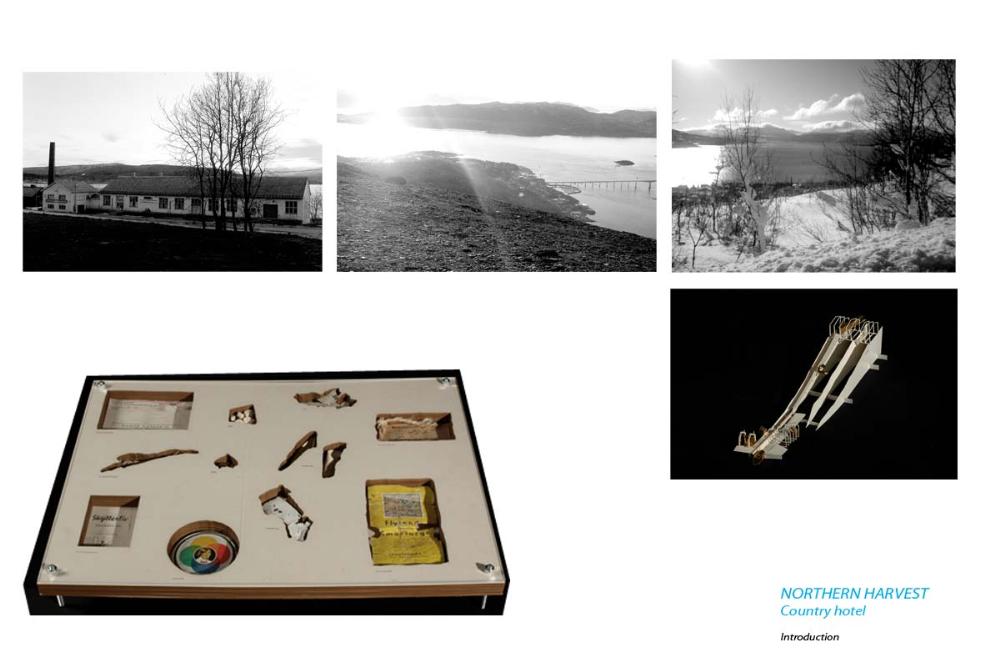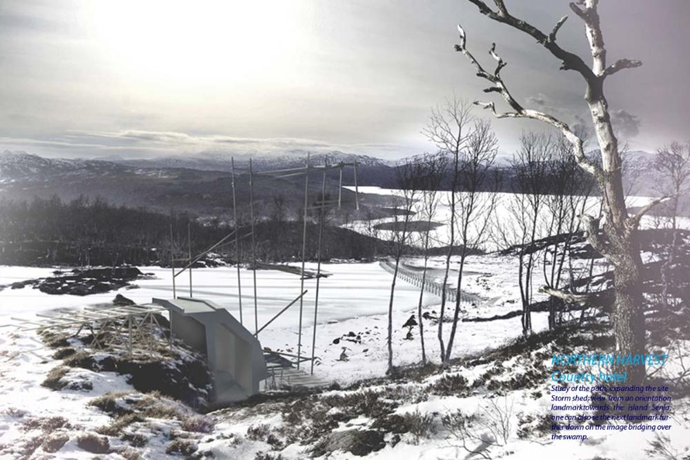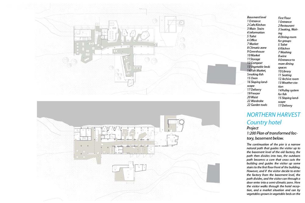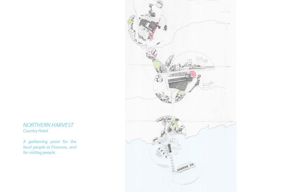 Northern Harvest Part 2 Project 2010 Ingvild Johanne Hanevold Oslo School of Architecture and Design Oslo | Norway Northern Harvest is a revised Country Hotel situated at Finnsnes, a small village an hour south of Tromsø in the very north of Norway. The project is centred round the wild Northern landscape, the local nature, and the transformation of a run-down 1950’s dairy factory. My grandmother lived at Finnsnes, and during many visits to this place I have with an increasing interest explored the local wilderness, and taken notice of specific details such as the old weathered factory. The building has been abandoned for almost 20 years, and therefore, one could say, lost its “social” influence on the local context. What remains, however, is the factory reacting with nature.In this area there is a very special relationship between habitation and the extreme nature, and this reciprocal relationship has been an important starting point for the understanding of the transformation of the factory. The idea is that by opening up the building to the surroundings (a natural section of 1.5km from shore to mountain), and to the cyclic nature, the aim is to “re-contextualise” the building with the local situation. Method: Establishing a new program for the factory; firstly collecting data from the place researching historical, social, tectonic and archaeological aspects from the place, collecting various objects and conversations with local people. Furthermore investigating the existing site, both subjective and analytical, drawn analysis in relation to the broader local landscape, and expanding the site from shore to mountain. The new program for the dairy factory will be a seasonal based self sustaining Country Hotel, where the factory work as a generator and connector between the other programs spread out along a natural section line/ path of 1.5 km from shore to mountain, it will also work as a gathering point for the local people. The Country hotel reacts to local cycles by the way the habitation is positioned, orientated and programmed; hoe the habitation almost becomes a stage for the natural scene to take place. An inovativ, sustainable, transformation of a run-down traditional Norwegian dairy from the 50’s, located in Finnsnes, a little town south of Tromsø in Norway.The project is a fresh blend between a hotel and a hang out for local fishermen, hunters and mushrom pickers. Through detailed sketching and an urge to find natural cyclic ancoring to the site and nature, the student has developed a beautifull new way of looking into the near past.By reprograming the abandoned building, a revised Country Hotel apeares as a connector between sea and mountain/present and past.The student has through drawing, by valuing the sketch as a tool for representation, and as a tool to enable a project to develop; discovered surpisingly bold architectural qualities on the spesific site and in the existing building. Tutor(s) Magne Magler Wiggen Jonas Høgli Major Joakim Skajaa