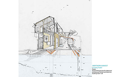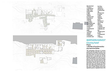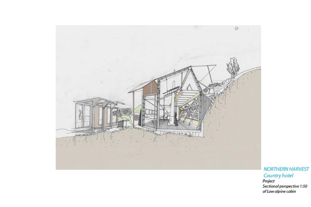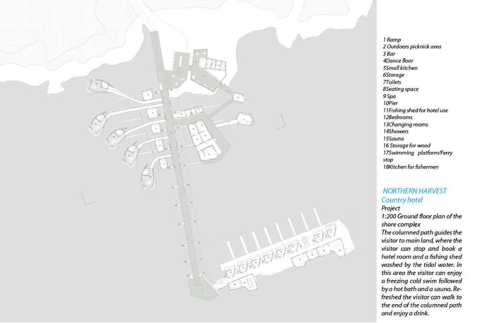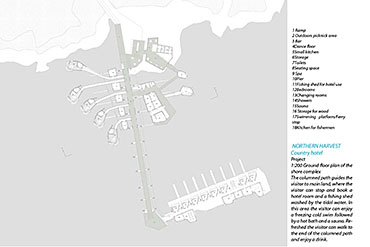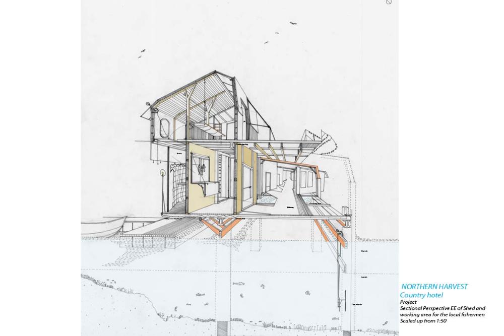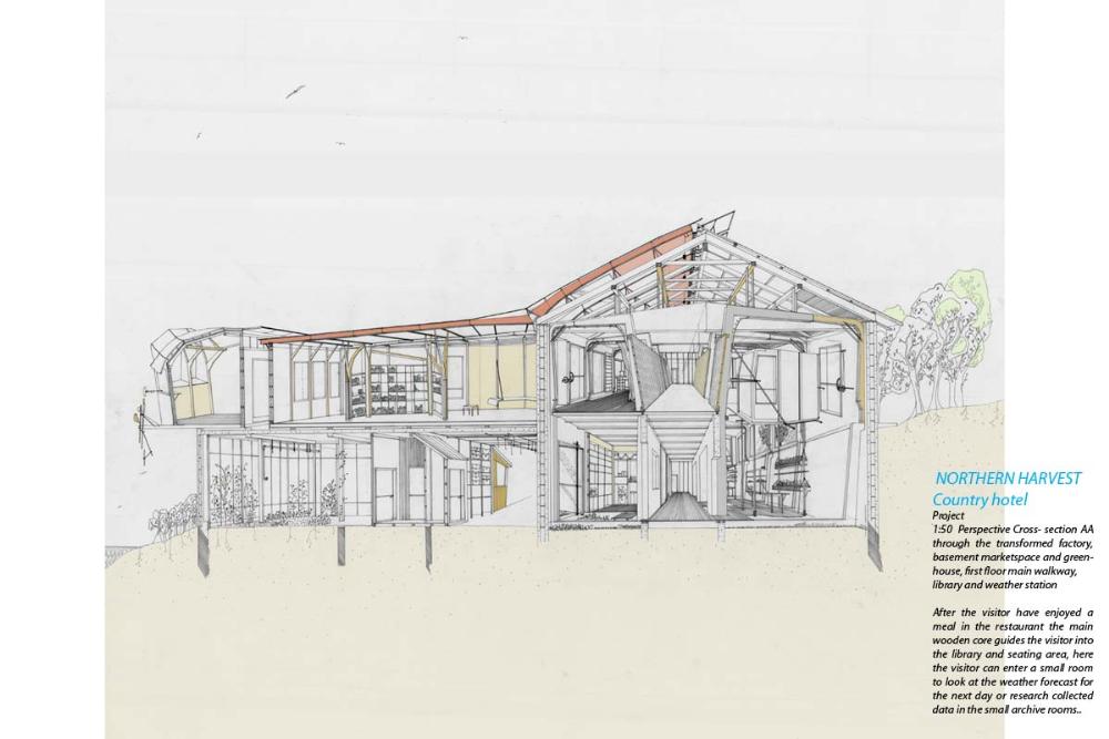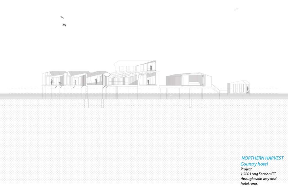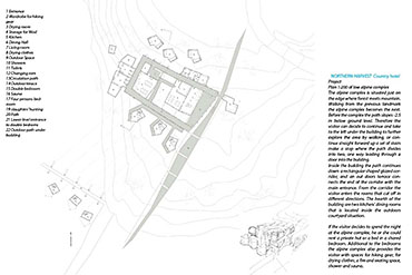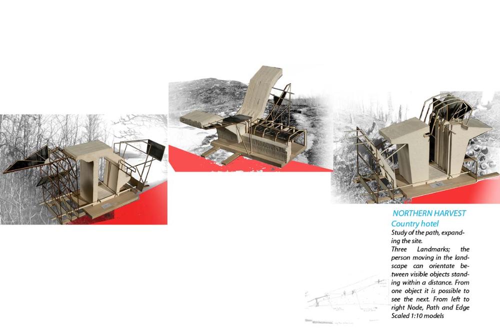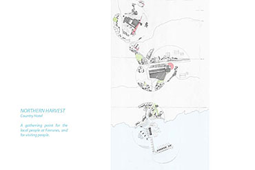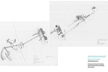 Northern Harvest Part 2 Project 2010 Ingvild Johanne Hanevold Oslo School of Architecture and Design Oslo | Norway Northern Harvest is a revised Country Hotel situated at Finnsnes, a small village an hour south of Tromsø in the very north of Norway. The project is centred round the wild Northern landscape, the local nature, and the transformation of a run-down 1950’s dairy factory. My grandmother lived at Finnsnes, and during many visits to this place I have with an increasing interest explored the local wilderness, and taken notice of specific details such as the old weathered factory. The building has been abandoned for almost 20 years, and therefore, one could say, lost its “social” influence on the local context. What remains, however, is the factory reacting with nature.In this area there is a very special relationship between habitation and the extreme nature, and this reciprocal relationship has been an important starting point for the understanding of the transformation of the factory. The idea is that by opening up the building to the surroundings (a natural section of 1.5km from shore to mountain), and to the cyclic nature, the aim is to “re-contextualise” the building with the local situation. Method: Establishing a new program for the factory; firstly collecting data from the place researching historical, social, tectonic and archaeological aspects from the place, collecting various objects and conversations with local people. Furthermore investigating the existing site, both subjective and analytical, drawn analysis in relation to the broader local landscape, and expanding the site from shore to mountain. The new program for the dairy factory will be a seasonal based self sustaining Country Hotel, where the factory work as a generator and connector between the other programs spread out along a natural section line/ path of 1.5 km from shore to mountain, it will also work as a gathering point for the local people. The Country hotel reacts to local cycles by the way the habitation is positioned, orientated and programmed; hoe the habitation almost becomes a stage for the natural scene to take place. An inovativ, sustainable, transformation of a run-down traditional Norwegian dairy from the 50’s, located in Finnsnes, a little town south of Tromsø in Norway.The project is a fresh blend between a hotel and a hang out for local fishermen, hunters and mushrom pickers. Through detailed sketching and an urge to find natural cyclic ancoring to the site and nature, the student has developed a beautifull new way of looking into the near past.By reprograming the abandoned building, a revised Country Hotel apeares as a connector between sea and mountain/present and past.The student has through drawing, by valuing the sketch as a tool for representation, and as a tool to enable a project to develop; discovered surpisingly bold architectural qualities on the spesific site and in the existing building. Tutor(s) Magne Magler Wiggen Jonas Høgli Major Joakim Skajaa