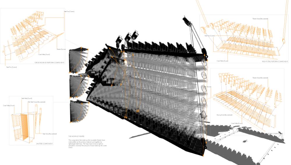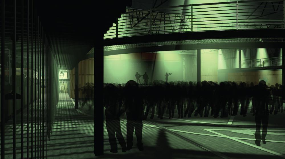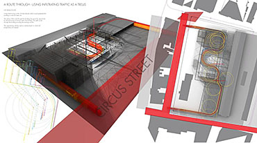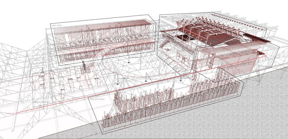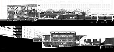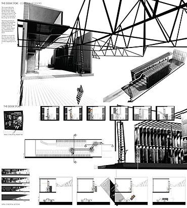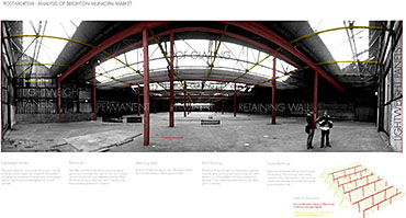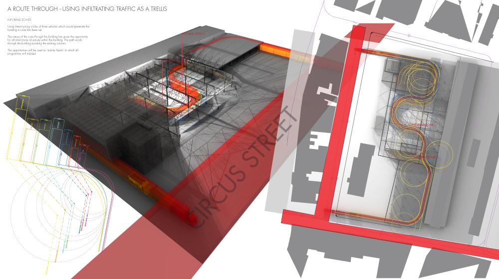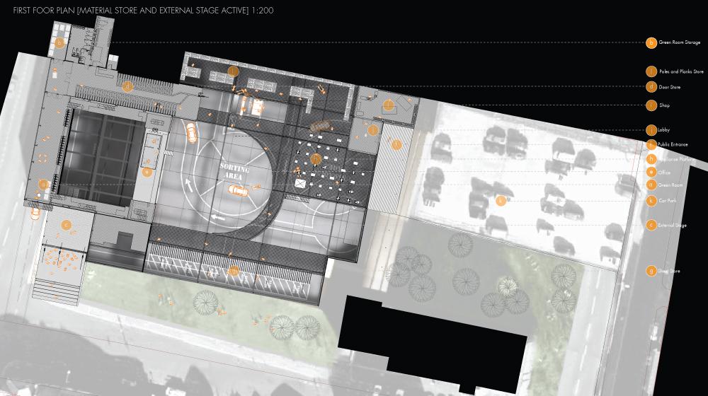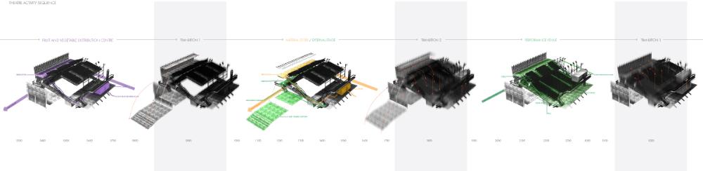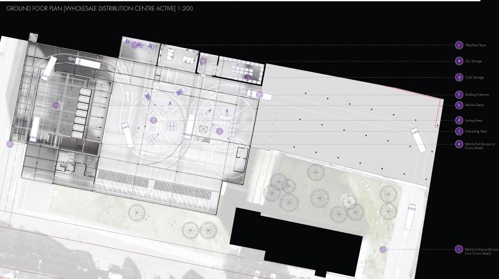 The programmes occupied by the building work on an overlapping 24 hour cycle; the Fruit and Vegetable Distribution Centre [Historical], The Material Reuse Store [Existing] and a dynamic theatre [New]. The constant occupation provides a social hub in a currently unoccupied and dilapidated area of Brighton.