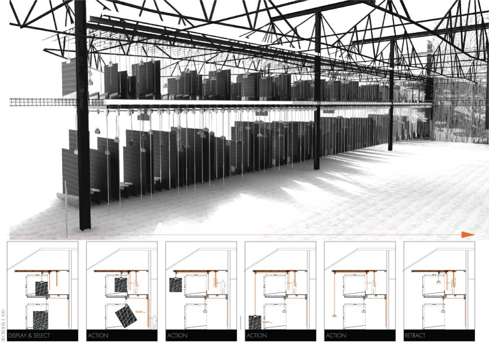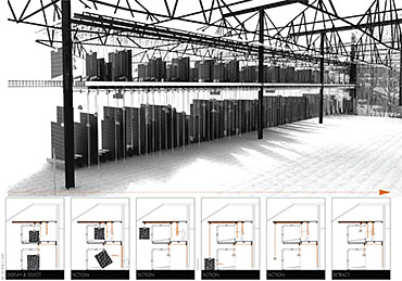 Complex component-based storage systems occupy the internal space, facilitating the collection and reuse of recyclable material of the city. The material is not treated as second-hand but rather the systems promote the qualities, uniqueness and texture of each individual piece. This, in turn, removes the negative stigma usually attached to reused material, making it more likely to be seen for what it could be used for, rather than what it once was.