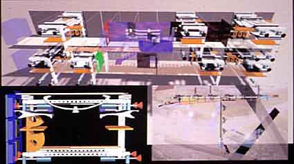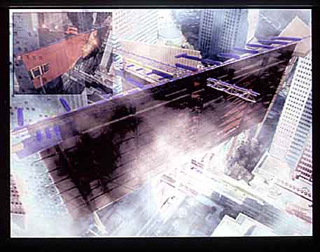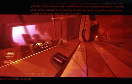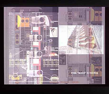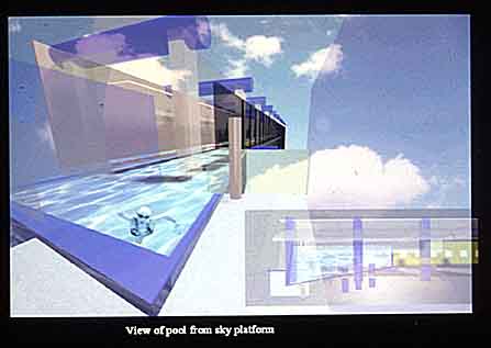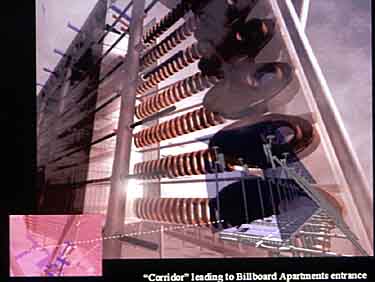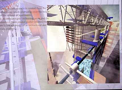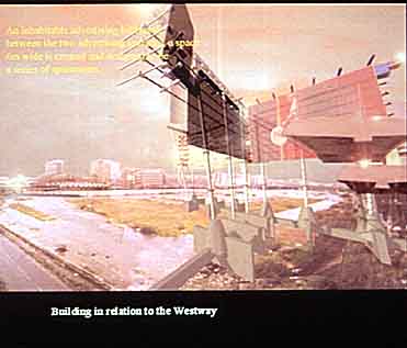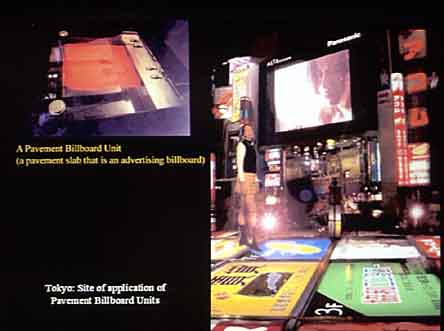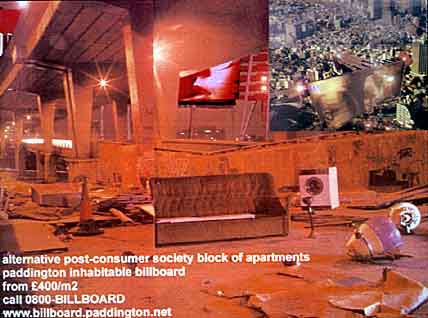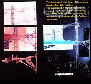 BILLBOARD APARTMENTS, PADDINGTON Part 2 Project 1999 Mimis Koumantanos Oxford Brookes University Oxford | UK BILLBOARD APARTMENTS, PADDINGTON: DOUBLE-FUNCTION URBAN ITEMSCreating an urban horizontal advertising unit with the aim of developing a global product;Capitalising on the profitability of the unit's double-function as pavement slab and billboard;Stating that architectural design is increasingly becoming linked with cash-flow figures and feasibility charts;Declaring that buildings can be designed to meet the financial needs of the city without being forced to do so; Designing an advertising billboard that could also become a set of apartments;Capitalising on double-function once again, this time that of billboard structure and housing superblock;Exploring the design opportunities of structural modules to create the aesthetic environment of a hybrid building type;Applying the principle of double-function to the structure, making the beam unit also operate as a viewing platform;Finding and testing the technologies to execute ideas;Working with prototypes and material samples;Specifying materials as a creative process;Presenting visions of space that will appeal to a distinct tribe of city-zens;Simulating the possibilities of lighting patterns and volumetric relationships;Exploring the implications of the advertising slab and billboard apartments for the modern cityscape;Demonstrating the interaction of design ideas from simple object to city scale. BILLBOARD APARTMENTS, PADDINGTONThe scheme devised by Mimis Koumantanos offers a realistic but visionary response to the notion of high-density urban life. He began with a fascination for images of Japanese cities, especially the way in which every available surface seems to be used for advertising or signage. As Mimis studied the photographs of Tokyo, he came to the conclusion that the only surface which was left to claim was the horizontal: the pavement.So he started by designing a pavement billboard module. The idea is that local authorities subsidise their street repairs by leasing space on the pavements to private individuals. These citizens can then use the units to present images of themselves, memorials to loved ones, lonely-heart appeals, or whatever. Just imagine a vivid night-time street full of intense private images; Mimis explored this notion by designing and making actual pavement units, then manipulating photographs of these using computer simulations.Mimis then went on to take the idea to a larger scale. In a 1960s, Archigram-kind-of-way he imagined a whole apartment block which functions as a giant advertising sign. What the inhabitants do is to effectively sell off their exterior wall spaces, and what they get in return is free power and lighting, plus subsidised rents, along with an ever-modulating sequence of light effects in their homes. But the idea is not just for big corporations; at times the projection wall is to be used by artists or community groups to set out their own messages.Mimis designed such a block on the tough Paddington Basin site next to the A40(M) Westway flyover. The apartment block is configured to take advantage of the thousands of passing motorists, soaking up their attention and their headlight beams at night. The design is for a dramatic high-rise building that is fully adapted to urban conditions, and yet is counterposed by also containing two high-level swimming pools which project out over the motorway. From the pools, the residents can survey the brilliant night lights of London. Inside their flats they also experience a stylish, vibrantly illuminated glimpse of city life.Then, in a final twist, Mimis proposed that such super blocks should be returned to already dense and highly-illuminated cities such as Tokyo. In a series of stunning CAD simulations, he created visions of sublime and memorable urban forms which stretch across the modern cityscape.