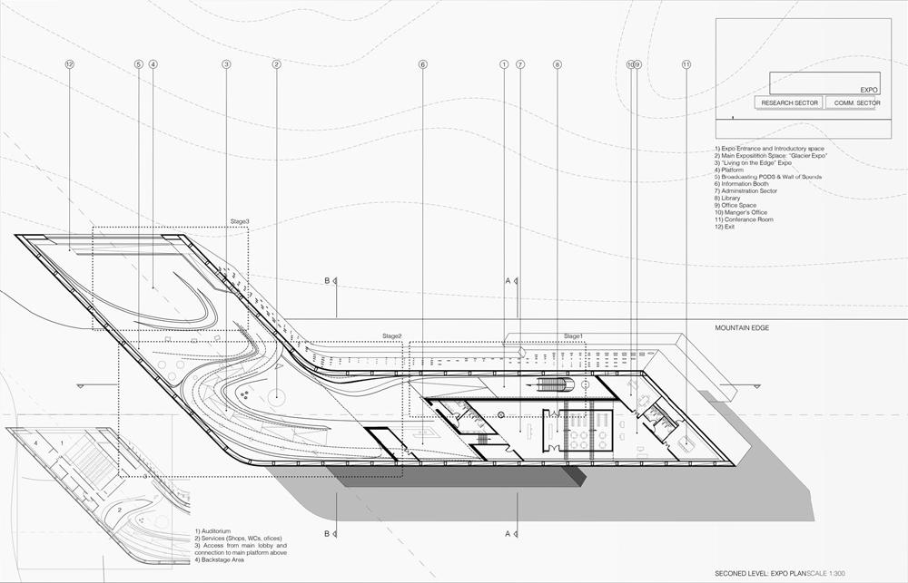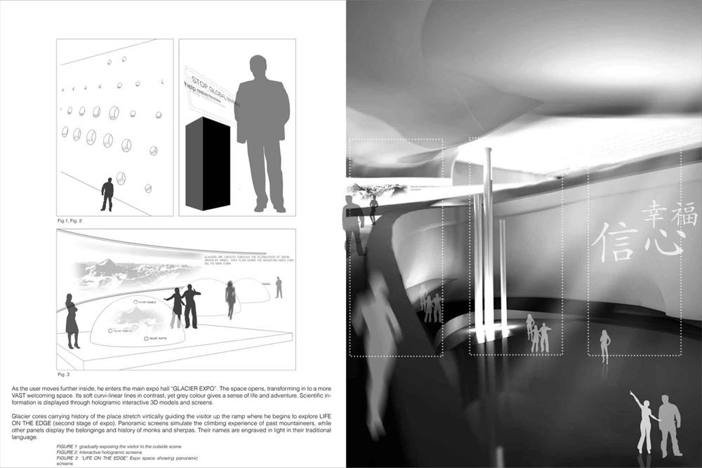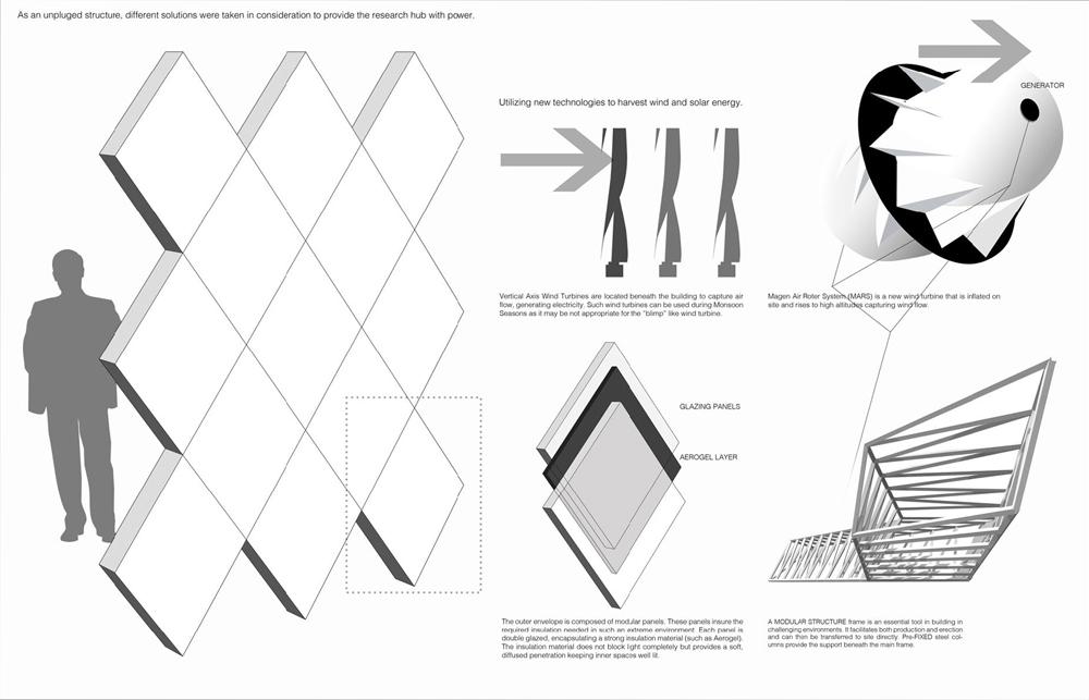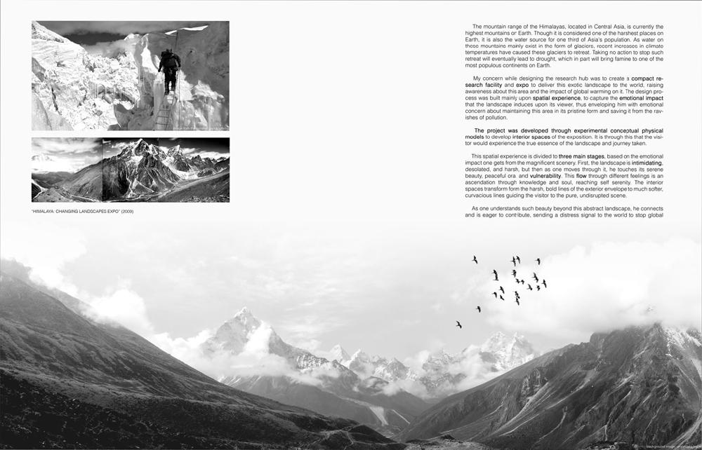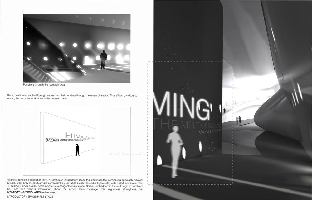My concern while designing the research hub was to create a compact research facility and expo that would deliver this exotic landscape to the world, raising awareness about this area and the impact of global warming on it. The design process was built mainly upon spatial experience, to capture the emotional impact that the landscape induces upon its viewer, thus enveloping him with emotional concern about maintaining this area in its pristine form and saving it from the ravishes of pollution.