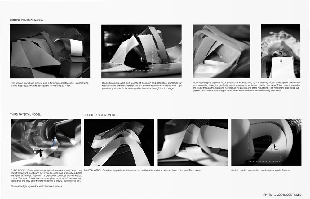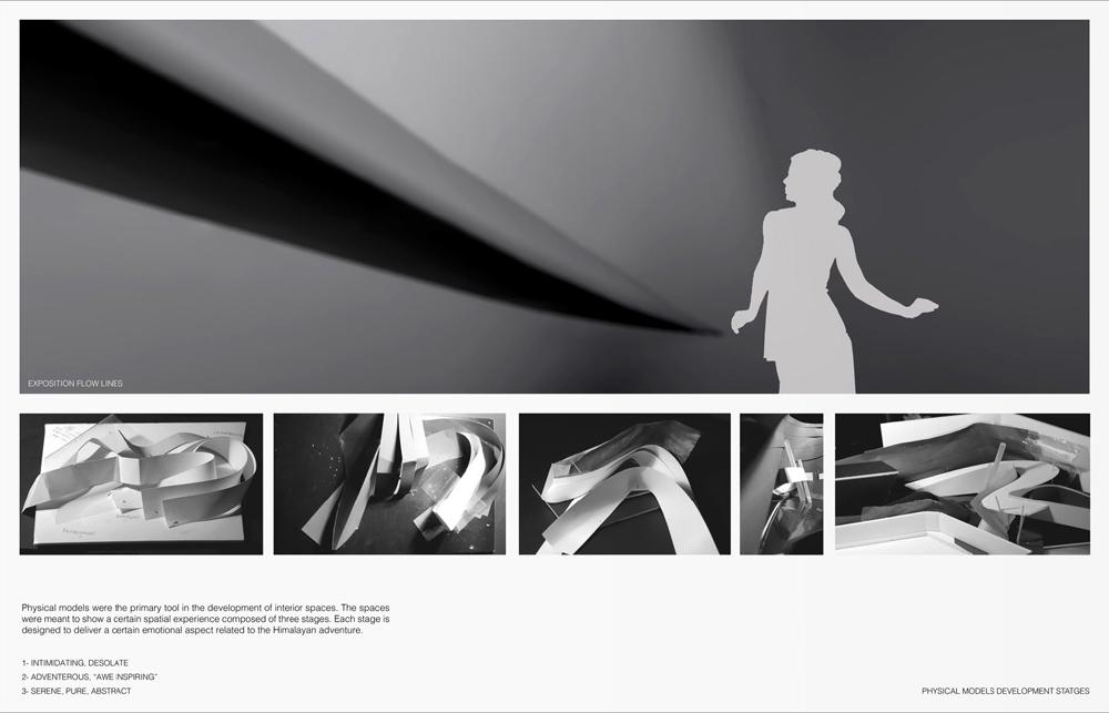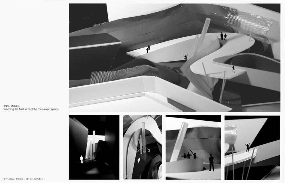 The project was developed through experimental conceptual models to develop interior spaces of the exposition. It is through this that the visitor would experience the true essence of the landscape and journey taken.