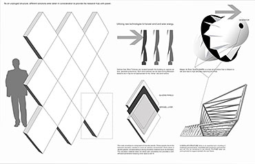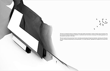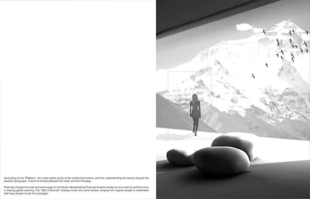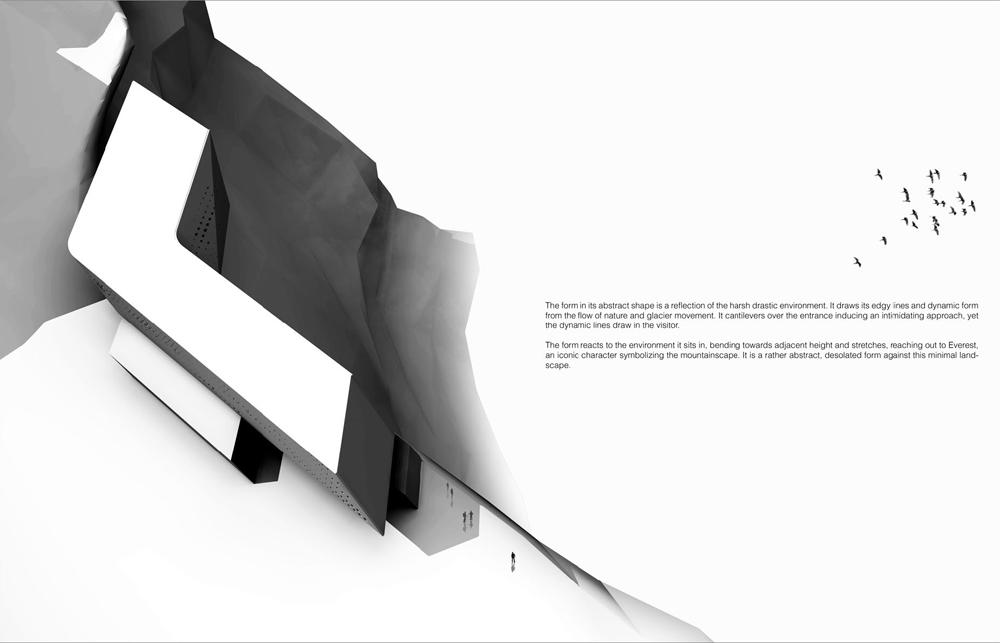 Karim Anwar chooses the mountain range of the Himalayas. He confirmed deep understanding of the unsullied, extreme environmental context. Through building a series of experimental physical models and using photomontage technique, his ability to accurately design every area of the project in relation to the other, whilst ensuring all spaces possessed what were needed for their intended purpose was exceptional. I consider his project a prototype for an inside-out design approach. Karim’s project also reflects development of new problem solving techniques and first-rate presentation capabilities, which reflect the purity and spirit of nature.