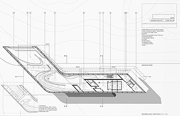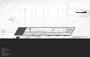 This spatial experience is divided into three main stages, based on the emotional impact one gets from the magnificent scenery. At first the landscape is intimidating, desolated and harsh, but then as one moves through it, he touches its serene beauty, peaceful aura, and vulnerability. This flow through different feelings is a journey through knowledge of past, present and future, plus soul reaching self-serenity. The interior spaces transform from the harsh, bold lines of the exterior envelope, giving to much softer, curvaceous lines guiding the visitor to the pure, undisrupted landscape.