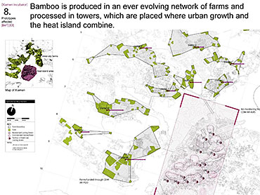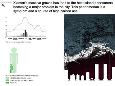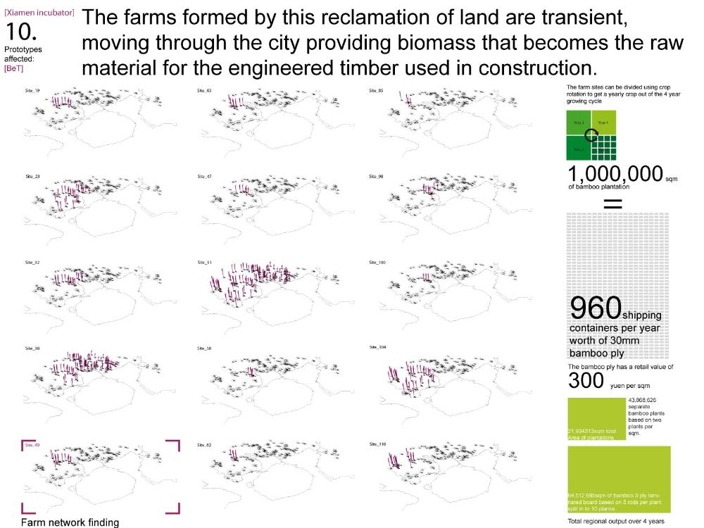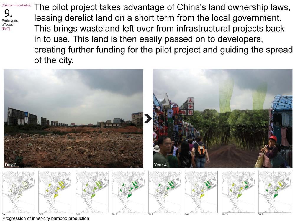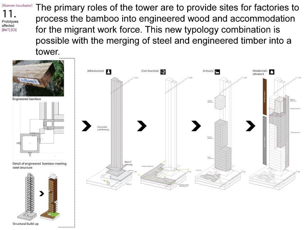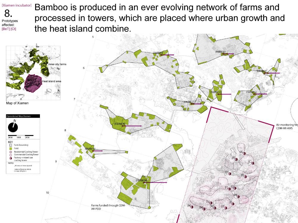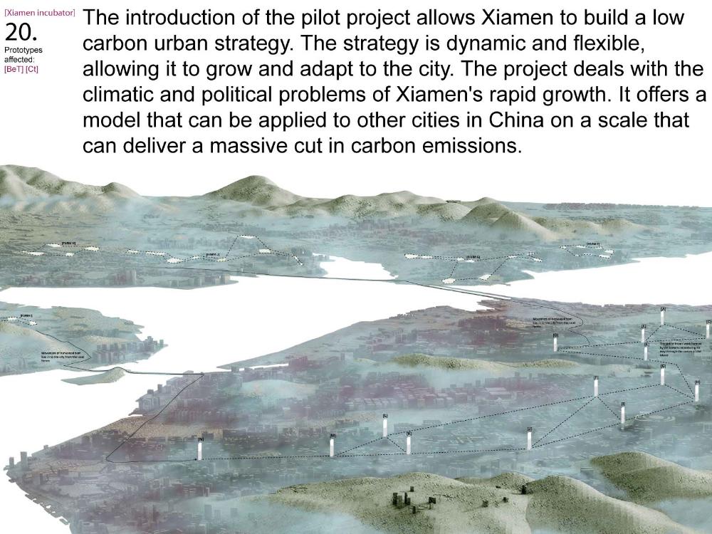 Xiamen Urban incubator Part 2 Project 2010 Benjamin Walton London Metropolitan University | UK The project is based in the city of Xiamen on the main land China side of the Taiwan Strait. The city is currently developing a low-carbon master plan exploiting the possibility of trading carbon credits and working towards becoming China’s first low-carbon city. My project deals with the rapid growth in population and built environment of Xiamen. To do this, it operates on a range of scales from a city-wide strategy to smaller scale architectural interventions. The project proposes a system for building on a large scale using locally grown renewable materials in the form of engineered bamboo. This system is combined with pieces of infrastructure designed to mitigate the effects of the heat island phenomenon; a problem which results from the dense urban fabric and the high carbon use of cities like Xiamen. To do this it makes use of UN funding through the CDM mechanism. The project is designed to be a pilot that can be applied to cities through out china with the aim of cutting carbon emissions. urban planning, architecture and the global carbon marketClimate Change is a serious threat to humanity. Manmade carbon emissions are increasing the natural carbon content in the atmosphere and are causing global warming and a general increase in the instability of the weather. This will not only lead to problems with the environment, but also to an increase in the gap between poverty and wealth and in conflicts related to energy and water. The majority of people now live in cities, relying mainly on carbon emitting energy sources. The means of mitigating and adapting to climate change are directly linked to the populations living in cities and to their way of coexisting in a dense social, cultural, economic and political environment. Architects and urban planners have to meet this challenge in any way possible. Academic institutions will have to take the lead in the experimentation and innovation needed to bring the profession up to date with the complexity of the challenge. The unit research and the project of Benjamin Walton link the growth in carbon emissions in China to the global carbon trading market. This market, a controversial mechanism, emerges through the compliance buying of carbon credits by companies linked to targets set by governments. Under the Kyoto agreement a UN regulated process (CDM, or Clean Development Mechanism) was created to channel money through the carbon market to low carbon projects in countries such as China. The unit project in Xiamen applies CDM on a city-wide scale, turning it into the financial driver of a new urban planning method. This method enables the design of complex projects with a wide range of socio-economic effects, and results in the lowering of expected carbon emissions. Ben’s project proposes two prototypes: 1. a method of urban agriculture generating bamboo as main ingredient for the low carbon construction of highrises and 2. an example of such a highrise as new typology for combined industry and housing, as well as being a device to mitigate the heat island phenomenon, both an effect and further cause of Climate Change.Raoul BunschotenDiploma Unit 8London Metropolitan University Tutor(s) Raoul Bunschoten
