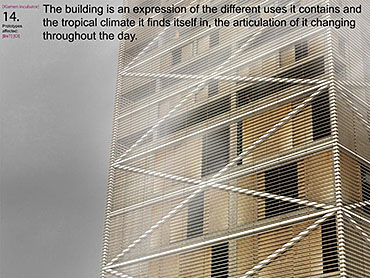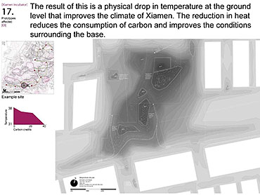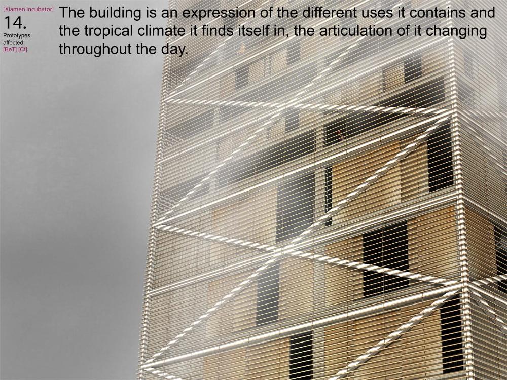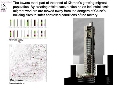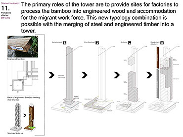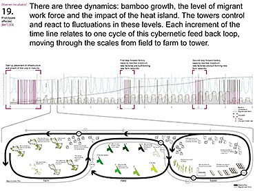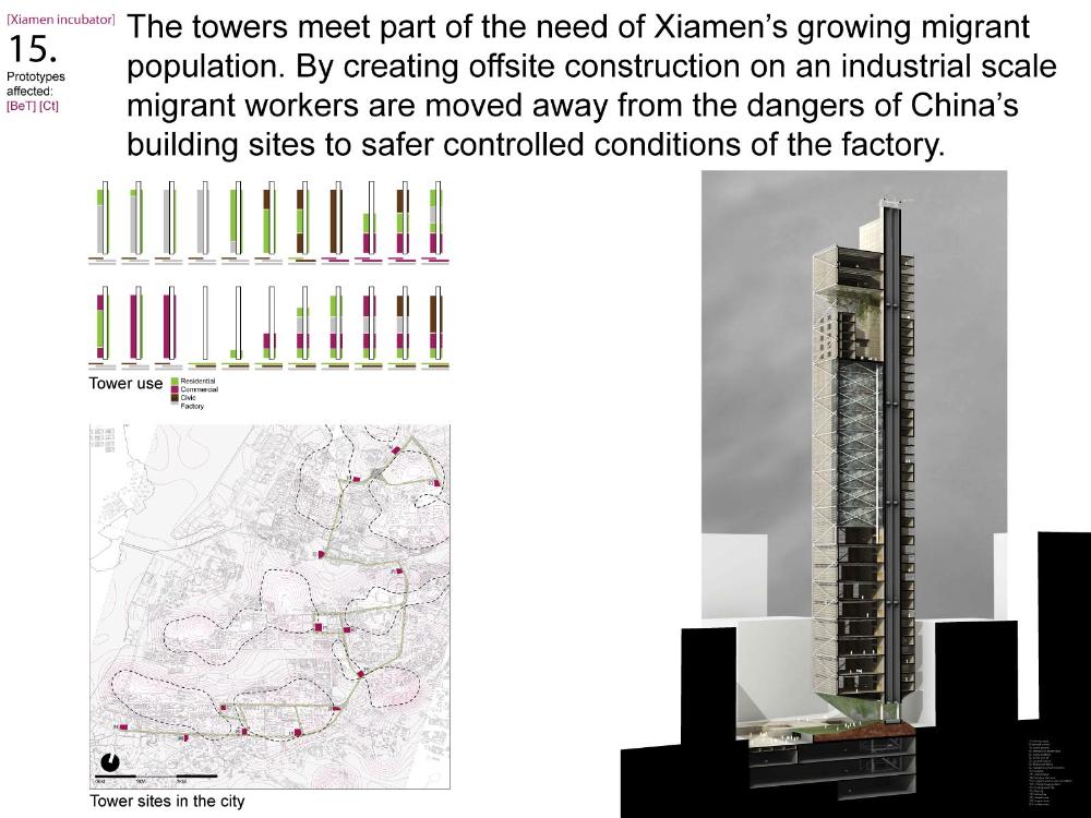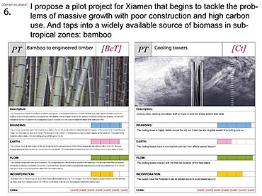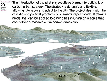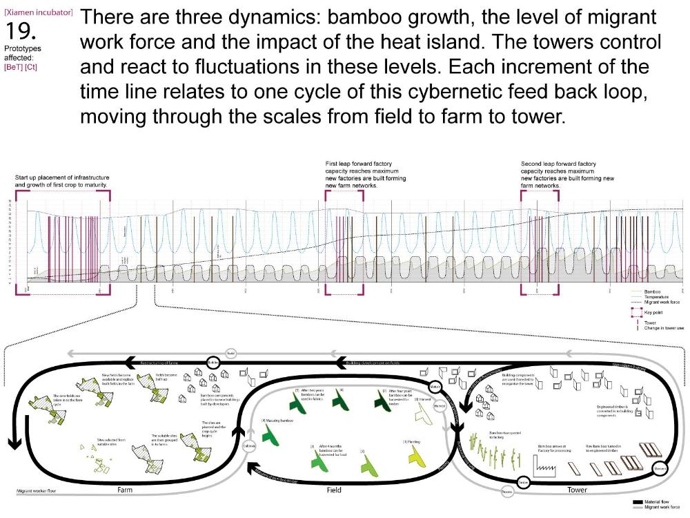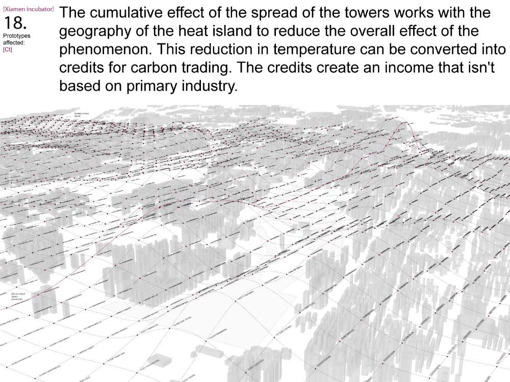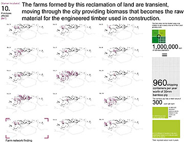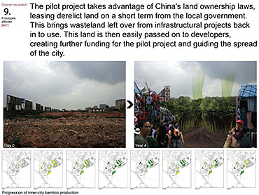 Xiamen Urban incubator Part 2 Project 2010 Benjamin Walton London Metropolitan University | UK The project is based in the city of Xiamen on the main land China side of the Taiwan Strait. The city is currently developing a low-carbon master plan exploiting the possibility of trading carbon credits and working towards becoming China’s first low-carbon city. My project deals with the rapid growth in population and built environment of Xiamen. To do this, it operates on a range of scales from a city-wide strategy to smaller scale architectural interventions. The project proposes a system for building on a large scale using locally grown renewable materials in the form of engineered bamboo. This system is combined with pieces of infrastructure designed to mitigate the effects of the heat island phenomenon; a problem which results from the dense urban fabric and the high carbon use of cities like Xiamen. To do this it makes use of UN funding through the CDM mechanism. The project is designed to be a pilot that can be applied to cities through out china with the aim of cutting carbon emissions. urban planning, architecture and the global carbon marketClimate Change is a serious threat to humanity. Manmade carbon emissions are increasing the natural carbon content in the atmosphere and are causing global warming and a general increase in the instability of the weather. This will not only lead to problems with the environment, but also to an increase in the gap between poverty and wealth and in conflicts related to energy and water. The majority of people now live in cities, relying mainly on carbon emitting energy sources. The means of mitigating and adapting to climate change are directly linked to the populations living in cities and to their way of coexisting in a dense social, cultural, economic and political environment. Architects and urban planners have to meet this challenge in any way possible. Academic institutions will have to take the lead in the experimentation and innovation needed to bring the profession up to date with the complexity of the challenge. The unit research and the project of Benjamin Walton link the growth in carbon emissions in China to the global carbon trading market. This market, a controversial mechanism, emerges through the compliance buying of carbon credits by companies linked to targets set by governments. Under the Kyoto agreement a UN regulated process (CDM, or Clean Development Mechanism) was created to channel money through the carbon market to low carbon projects in countries such as China. The unit project in Xiamen applies CDM on a city-wide scale, turning it into the financial driver of a new urban planning method. This method enables the design of complex projects with a wide range of socio-economic effects, and results in the lowering of expected carbon emissions. Ben’s project proposes two prototypes: 1. a method of urban agriculture generating bamboo as main ingredient for the low carbon construction of highrises and 2. an example of such a highrise as new typology for combined industry and housing, as well as being a device to mitigate the heat island phenomenon, both an effect and further cause of Climate Change.Raoul BunschotenDiploma Unit 8London Metropolitan University Tutor(s) Raoul Bunschoten