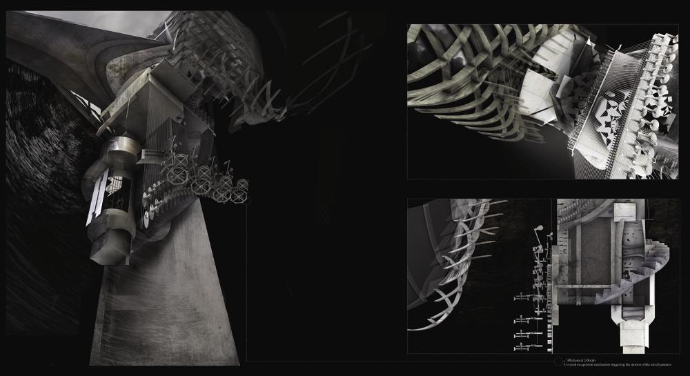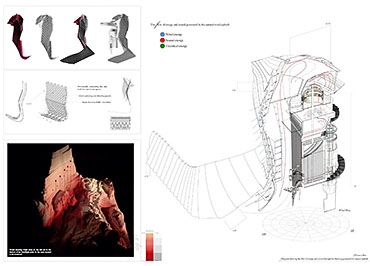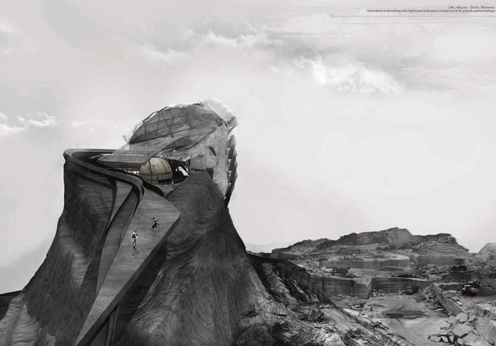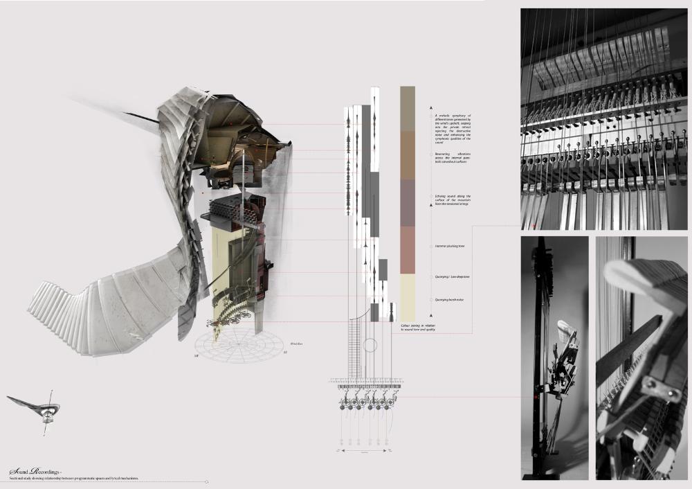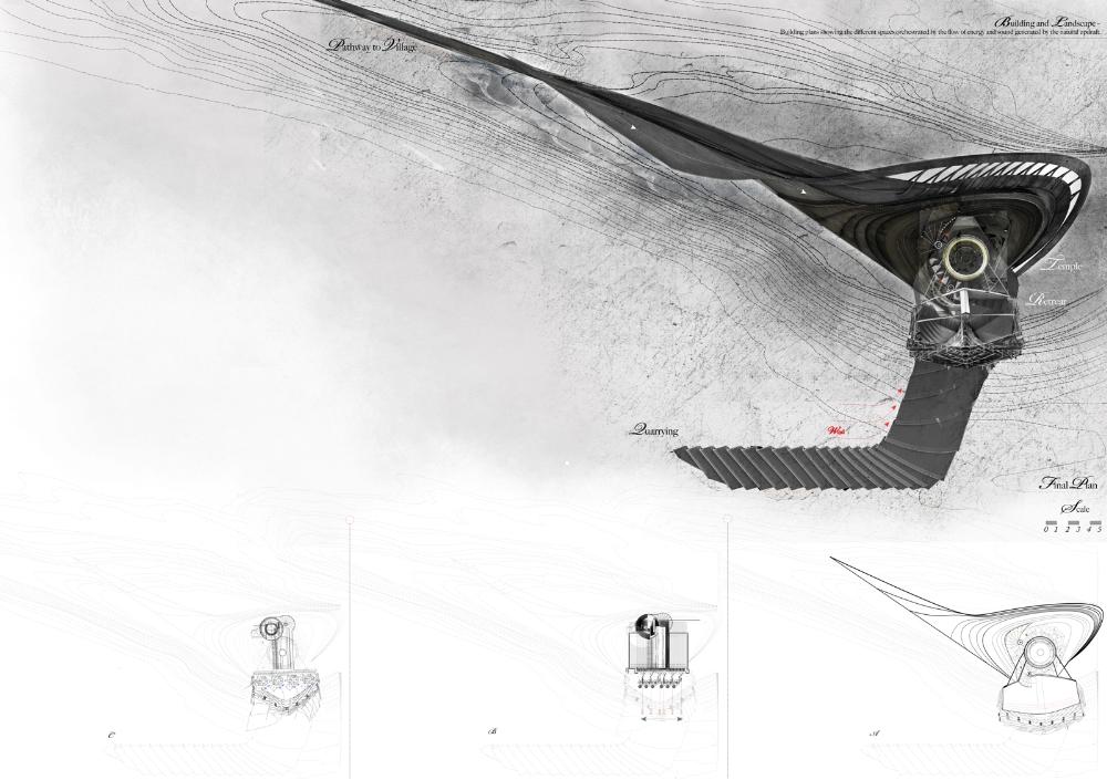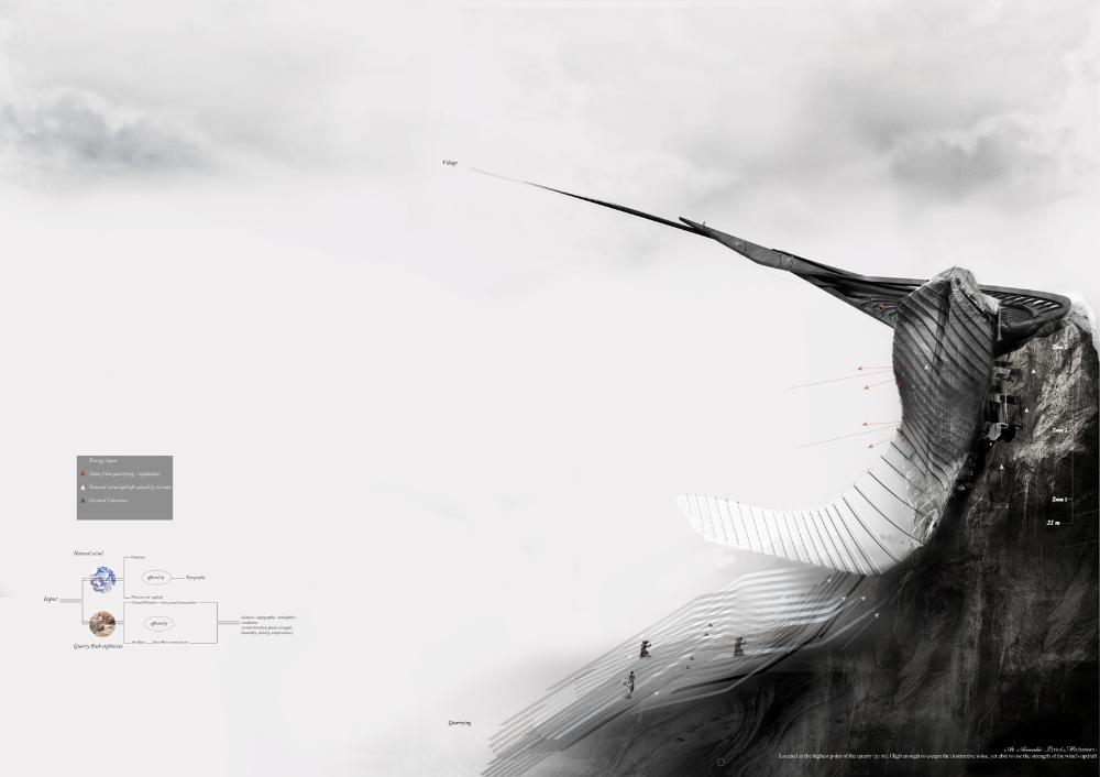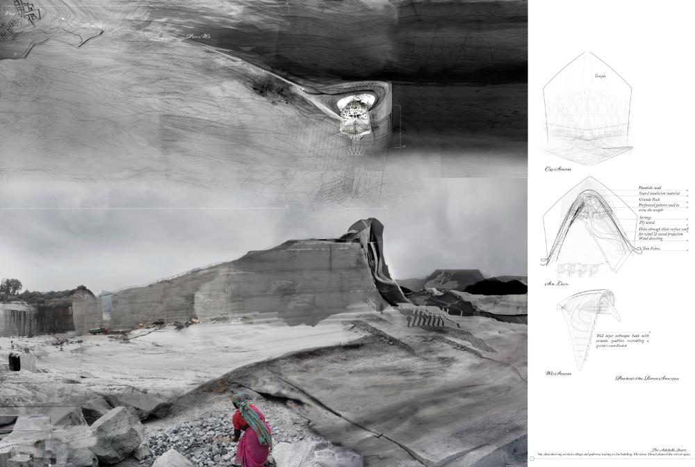 An Acoustic Lyrical Mechanism Part 1 Project 2011 Basmah Kaki Architectural Association London | UK An Acoustic Lyrical MechanismThis project speculates on sound energy and ambient space within the extreme setting of an active granite quarry. Located on the outskirts of the high-tech city Bangalore, the Silicon Valley of India, the mine employees a migrating cast – among them women and children – whose hearing is progressively damaged by the noise pollution endemic to their working conditions. An Acoustic Lyrical Mechanism creates a long-term strategy where sound and religious spaces offer relief, treatment and hope for the community of workers.Inspired by local religious traditions, the design is built around an existing sacred temple located within a thin, excavated area of the quarry. Largely placed inside the rock face, to protect against the mine’s constant hammering sounds and blast vibrations, this temple offers an entry point that then channels into a retreat space situated 30m above the quarry’s floor, high enough to escape the destructive noises and yet embedded enough to listen to the sounds generated by a layered adaptive skin mechanism attached to the cliff rock. This skin responds to a range of complex, and often competing, physical and environmental conditions. The design was structured, firstly, around several prototypes, built to investigate Aeolian wind-belt harp concepts, and the conversion of kinetic energy into electrical and sound energy. Secondly, topographic models helped to analyse wind and natural updraft on steep surfaces and control the air/sound flow within the building. Following a series of environmental studies, it was decided to position wind catchers in order to amplify the prevailing wind, redirecting the updraft to play the building’s instrumental spaces.Operating as a sensorial extension of the existing temple, the building engages its users in educational programmes via lyrical mechanisms, tuning tools and sonic workshops. Crafted with the detail typically afforded to the manufacture of musical instruments, its internal spaces sit in contrast to its rough external setting. Like an Aeolian harp, the building is played by the wind, acoustically transforming the abrasive sounds of quarrying. Part documentary, part speculation, the project reflects on sites and people lost in the rush of technological progress, but at the same time celebrating the cultivation of hope through acoustic lyrical mechanisms. Tutor(s) Ricardo De Ostos Nannette Jackowski