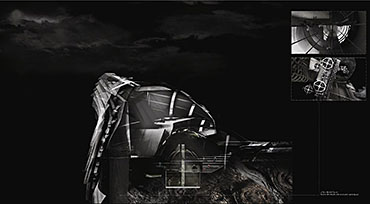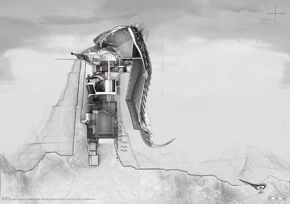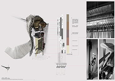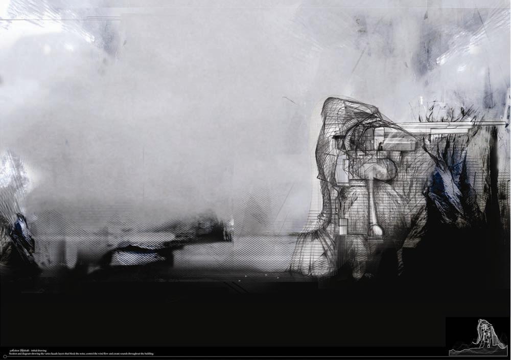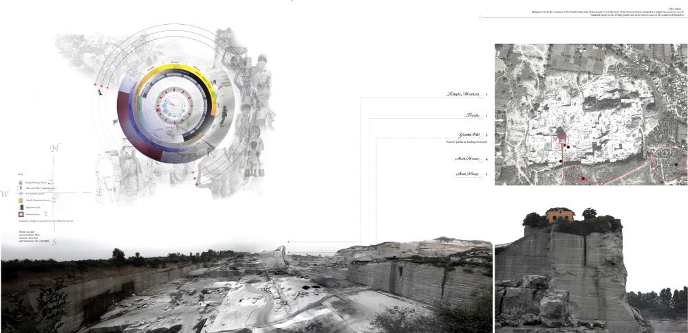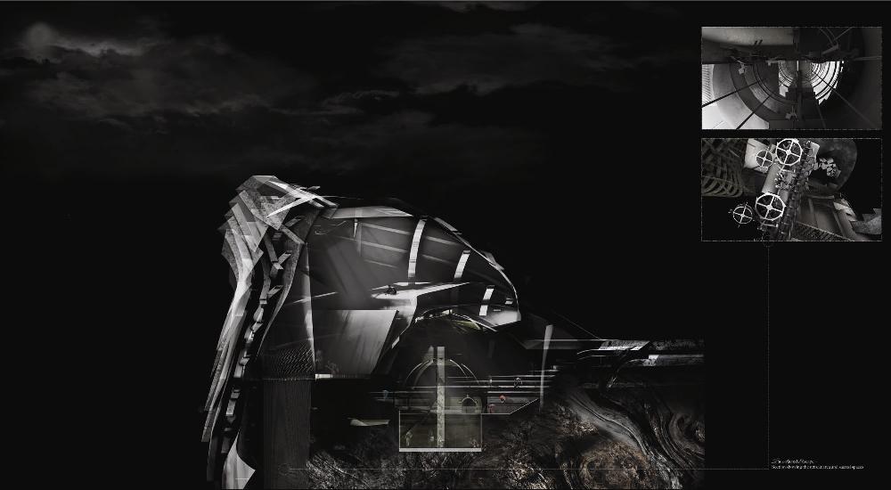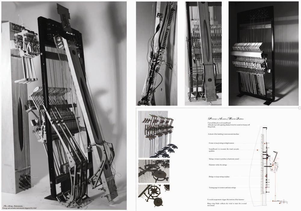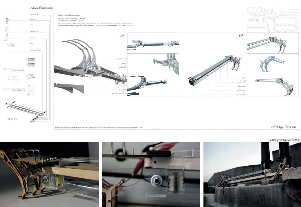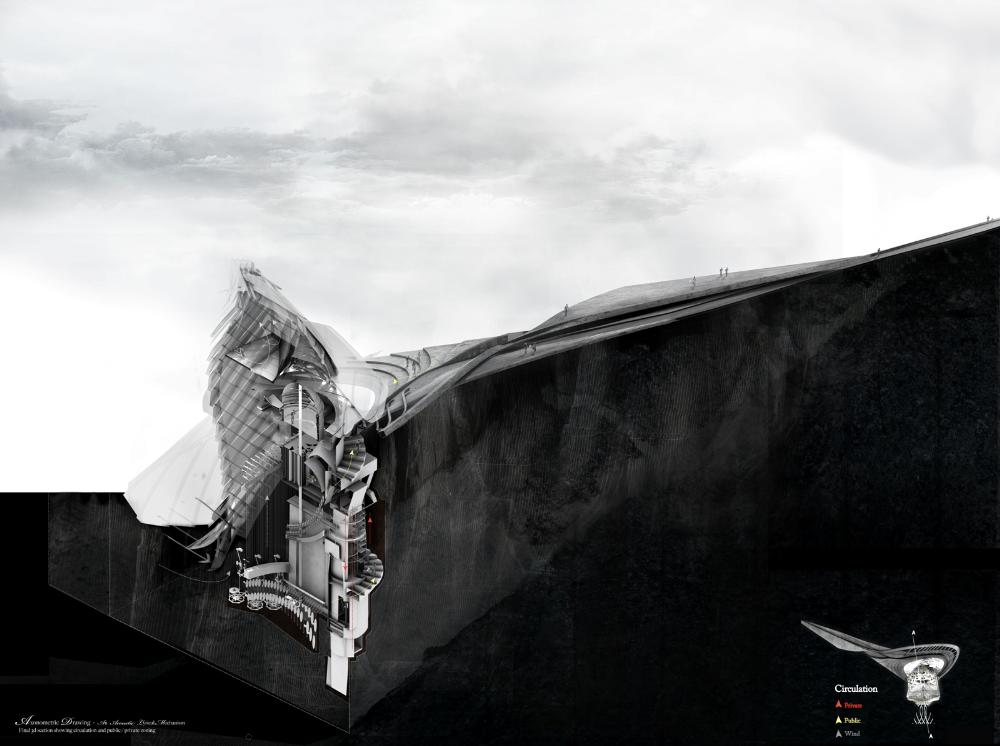 An Acoustic Lyrical Mechanism Part 1 Project 2011 Basmah Kaki Architectural Association London | UK An Acoustic Lyrical MechanismThis project speculates on sound energy and ambient space within the extreme setting of an active granite quarry. Located on the outskirts of the high-tech city Bangalore, the Silicon Valley of India, the mine employees a migrating cast – among them women and children – whose hearing is progressively damaged by the noise pollution endemic to their working conditions. An Acoustic Lyrical Mechanism creates a long-term strategy where sound and religious spaces offer relief, treatment and hope for the community of workers.Inspired by local religious traditions, the design is built around an existing sacred temple located within a thin, excavated area of the quarry. Largely placed inside the rock face, to protect against the mine’s constant hammering sounds and blast vibrations, this temple offers an entry point that then channels into a retreat space situated 30m above the quarry’s floor, high enough to escape the destructive noises and yet embedded enough to listen to the sounds generated by a layered adaptive skin mechanism attached to the cliff rock. This skin responds to a range of complex, and often competing, physical and environmental conditions. The design was structured, firstly, around several prototypes, built to investigate Aeolian wind-belt harp concepts, and the conversion of kinetic energy into electrical and sound energy. Secondly, topographic models helped to analyse wind and natural updraft on steep surfaces and control the air/sound flow within the building. Following a series of environmental studies, it was decided to position wind catchers in order to amplify the prevailing wind, redirecting the updraft to play the building’s instrumental spaces.Operating as a sensorial extension of the existing temple, the building engages its users in educational programmes via lyrical mechanisms, tuning tools and sonic workshops. Crafted with the detail typically afforded to the manufacture of musical instruments, its internal spaces sit in contrast to its rough external setting. Like an Aeolian harp, the building is played by the wind, acoustically transforming the abrasive sounds of quarrying. Part documentary, part speculation, the project reflects on sites and people lost in the rush of technological progress, but at the same time celebrating the cultivation of hope through acoustic lyrical mechanisms. Tutor(s) Ricardo De Ostos Nannette Jackowski
