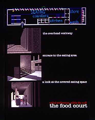 untitled Part 2 Project 1999 Jude Fernando Anna University Madras | India Is architecture's worth, measured by its affiliations to a history, style or school of thought? Can a building exclude itself from external influences and stylistic references? If so, does this exclusion culminate in a new style? These contradictions formed the basis of our proposal.The French (in 1674) acquired a pocket of land in Pondicherry, an Indian coastal city. They faced away from the Indian quarter and constructed a canal between the disparate halves. This canal is today, an open drain, flanked by 1-km long roads on each side. This anonymous stretch, was a boundary between contrasting cultures separated by the visual interpretation of lifestyle, fuelled by social necessity. Today, 47 years, since the secession of power to India, these differences remain. How should design in this stretch, react to this context of neutrality and conflict?Walls-The monuments of Rome's past greatness are, predominantly, within theAurelian WallThe Wailing Wall, is an original part of Herod's Temple in Jerusalem.Pyramus and Thisbe, two lovers in Babylonia, held conversations through acrack in the wall separating their houses.Romulus built a wall, over which Remus, scornfully leaped- to his ownfuneral.Walls have been the settings for history, myth and a canvas for man'screativity.The wall recognises the….. Place and importance of each typology in its historical context. ..Present age of blurred boundaries and cultural dilution.It achieves this by creating a contradiction in scale, form andAesthetics, justifying its right to individuality. Our design solution isA wall between the two sides. It transforms itself and adaptscontinuously, incorporating varied activity within its confines. Architecture is deeply embedded in culture and many a times it is a political act. It sits on a landmine when it is located in a context that makes contesting political and cultural claims. Debates around identity and political affiliation sometime flare up and brings in sharp focus the frivolous and benign attitude to visual appropriateness of architecture. This was one of the important objectives of the design project attempted by Jude Fernando. The site is located in between the affluent and erstwhile French quarter and the poor native Tamil quarter. The French have gone, but the architecture, class and culture of the inhabitants is still elitist and exclusive. The tourism and identity of Pondicherry continues to be woven around the white quarter. While the Tamil quarter remains neglected. The social divide is reiterated by a physical division - a water canal. There is now a proposal by the town authorities to develop this canal either by filling it or by retaining it. Jude and his class worked on this site and came with different proposals. Jude is a sensitive person and he found that class divide cannot be obliterated by benign looking architecture. He found issues of visual appropriateness is only a passive gesture that spoke for status quo. The design sates that the real estate is well entrenched and it would be only a utopian wish to erase the differences. The Design primarily worked around the intention to make the division recognisable and exhibitive . While the divide insists on separation, the activities try and bring both sides together. May the design was being politically correct and at the same time subversive.What I appreciate the most in this design is the unambiguous nature of the statement it makes. At the same time, it is also sees the design act as an opportunity to make a public space. The design enmeshes the physical, activity and the contextual to produce a place that is on its own and does not lean on crutches of false historicity