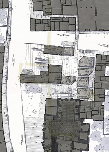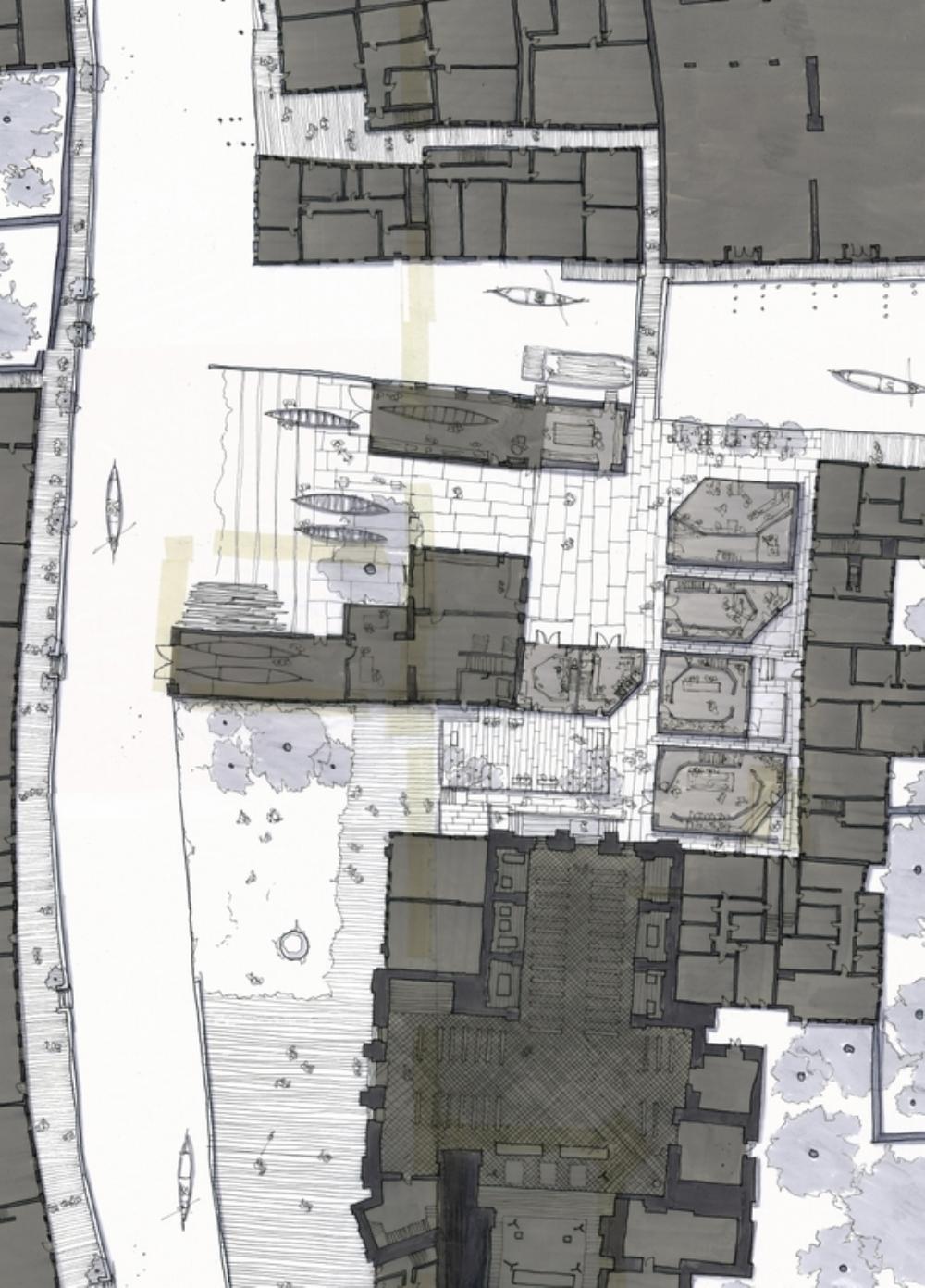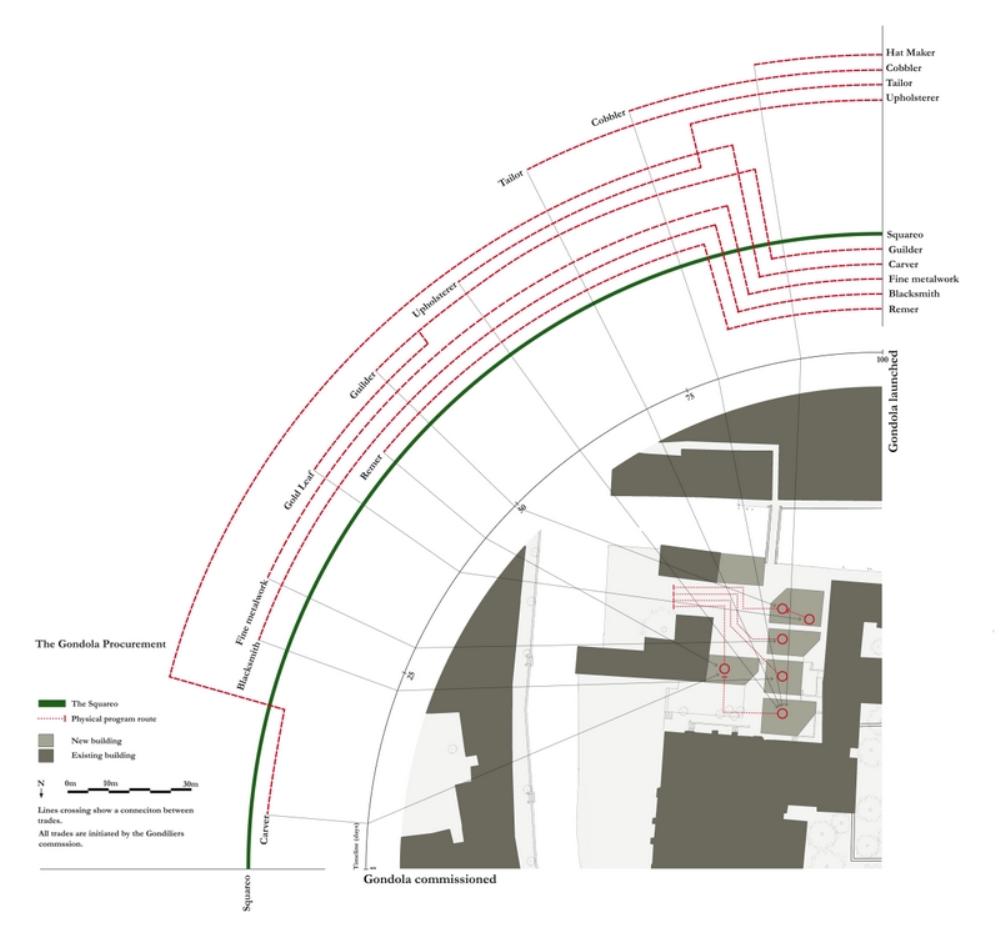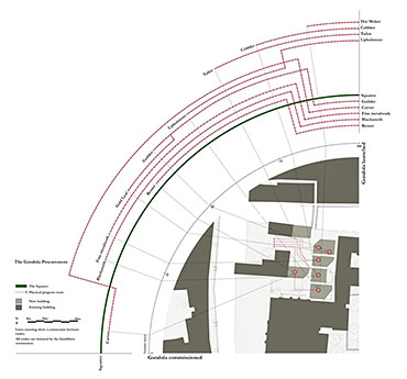 The project brings these workshops to San Trovaso. The amalgamation on a single site opens the doors. It engages the crafts with the public again, a public searching for a richer experience of the city. A dialogue with the craftsmen forms an understanding of the strict rules of the Gondola’s formation. The construction process lays out the workshops on the site the spaces between house each craftsmen’s engagement with the city. A meandering route through these public spaces offers visitors views of the process.