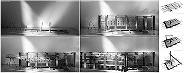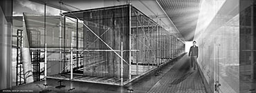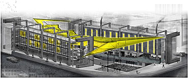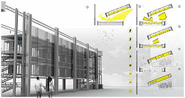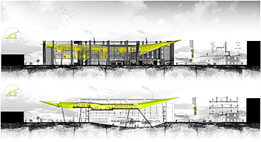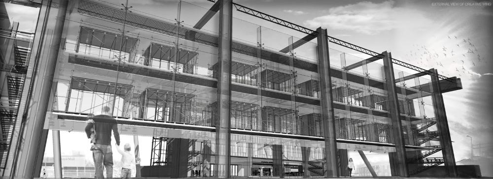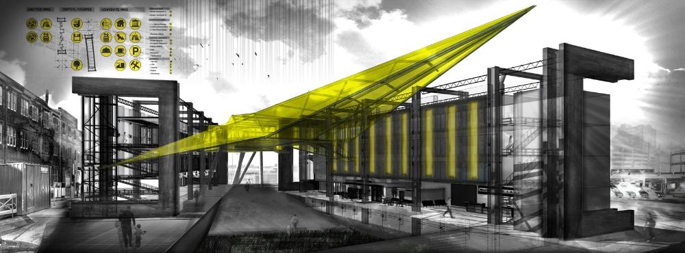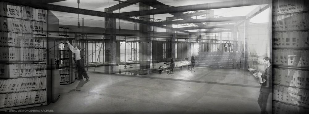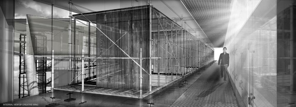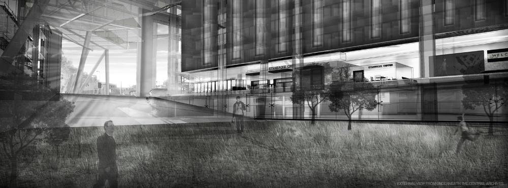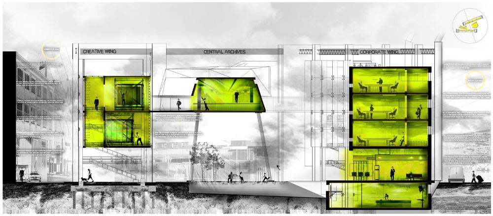 The project is composed of dynamic studio frames and refined office units. The opposing worlds are dissected by a central archive of communal use, which defines the celebration of social collision. The architectural language of each opposing wing aims to reflect the nature of those who inhabit the space it frames. The creative wing is comprised of a permeable, dynamic and raw aesthetic, which is able to adapt to the preference of the occupants. In comparison, the corporate wing is comprised of an enclosed, conservative and refined design, encouraging the organised and controlled activity of the corporate inhabitants. The central archives act as the binding centrepiece of the project and houses the relocated contents of public records, freely available to all occupants within the structure as well as the passing public. Beneath these three components is the public realm in which the general public are able to witness and engage with the surrounding activity.