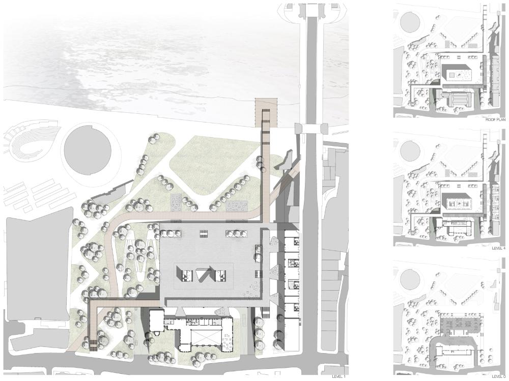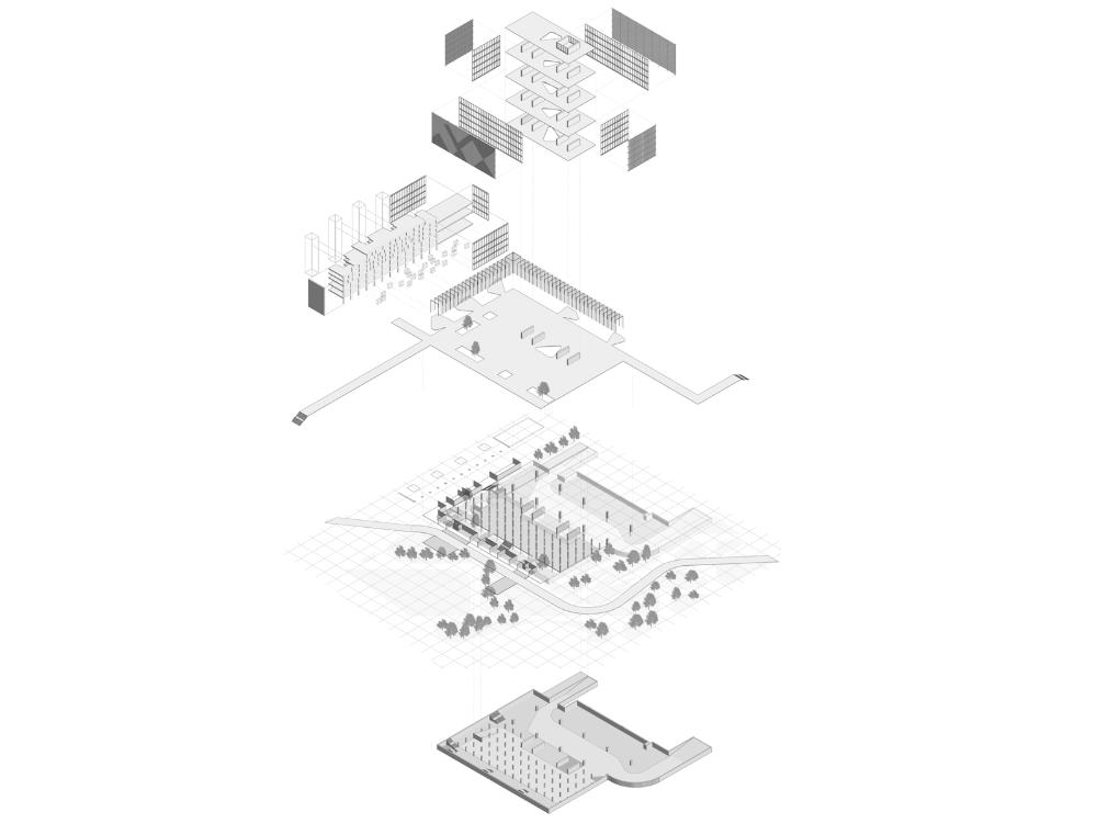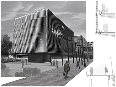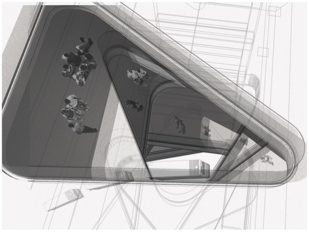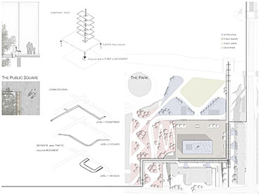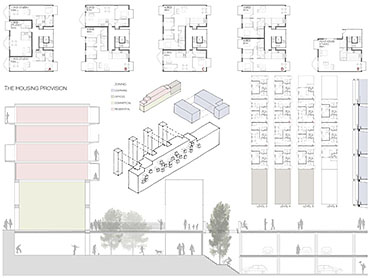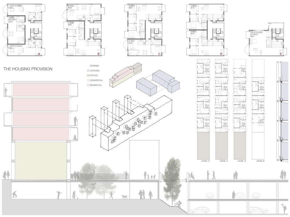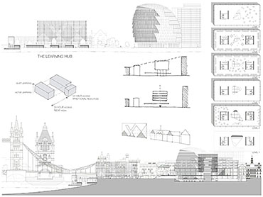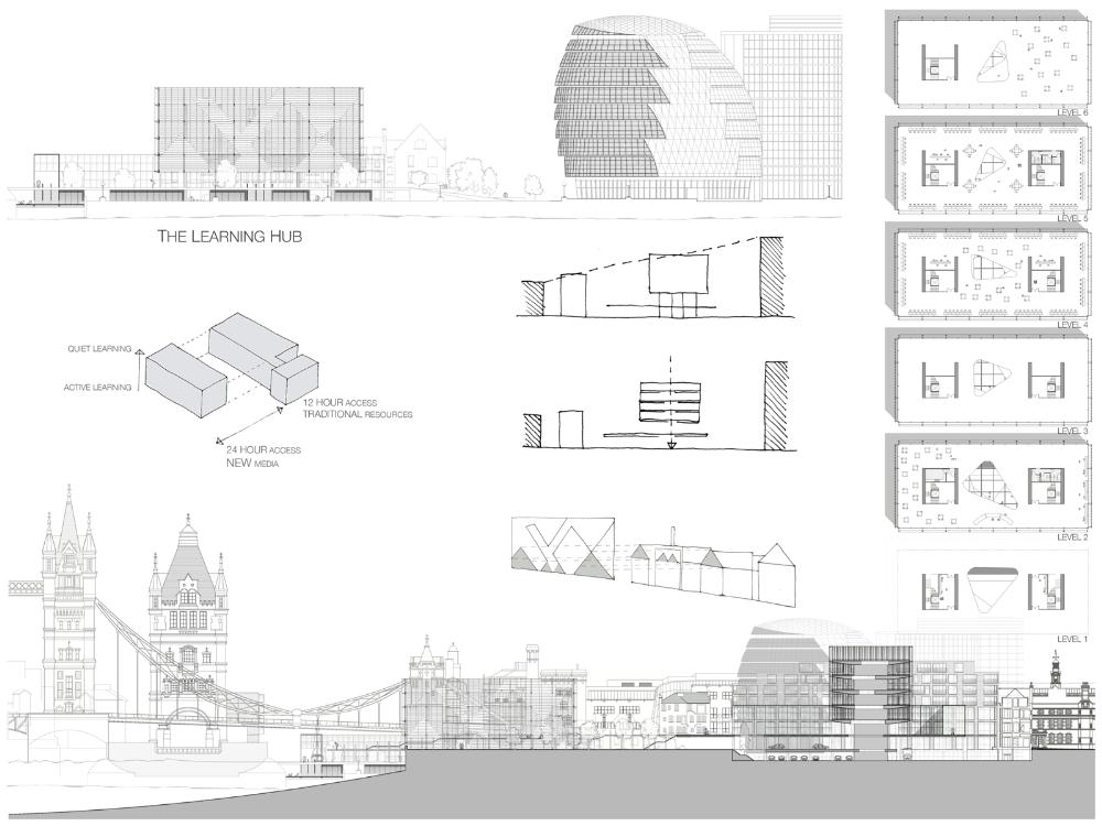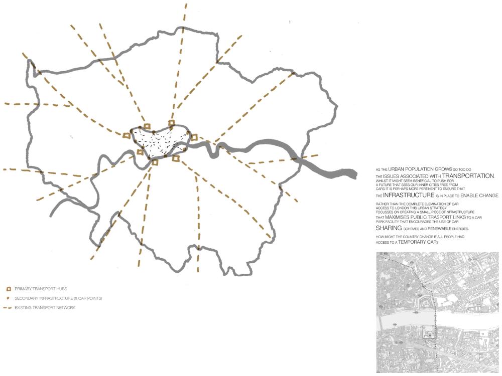 Metropolitan Living and Learning Part 1 Project 2011 Shaun Huddleston University of Portsmouth | UK As the urban population grows so too do the issues associated with transportation. Whilst it might seem beneficial to push for a future that sees our cities free from cars, it is perhaps more pertinent to ensure that the infrastructure is in place to enable a positive change in habit – who can seriously envisage a future without man’s four-wheeled best friend? With a brief that engaged with urban theory, challenged with a tough schedule of accommodation and offered one of the most interesting sites in London, Potters Field, the bigger picture could have been missed. However, site analysis revealed an opportunity to ‘reconcile’ a series of opposing forces and I envisaged an architecture that focused on facilitating movement.A parti emerged to separate the urban traffic in section and focus movement in plan. The ‘Learning Hub’ (one component stipulated but undefined by the brief) became the heart of the architecture. Its upper levels with their central atria voids gave views down onto the main public space and beyond into the public car park and bus terminal. The modes and routes of the commuter became the arteries of the complex: Cyclists were given the ground to navigate from north to south. Busses arrived and departed beneath the ground with the car park levels. The humble pedestrian was elevated via a series of walkways that connected Tower Bridge with a public square and steps to Tooley Street and out to the Thames.Fascination with the concept of London’s ‘Congestion Zone’ sparked an idea that the edge could be scattered with similar ‘transport infrastructure’. Rather than eliminate car access to London, this urban strategy suggests pieces of infrastructure could maximise transport links to car park facilities that encourage car sharing and green technologies – prepaid electric ‘Boris Cars’. Why put ‘just’ a park, offices, shops, learning hub and apartments here when you can help the city to breath a little more? Perhaps all developments around this zone should consider these issues – how might the country change if all people had access to a temporary car? Tutor(s) Dominic Gaunt