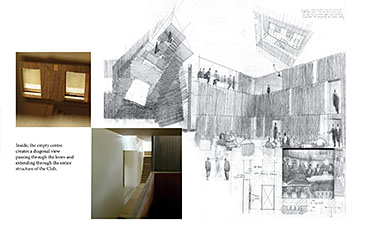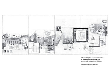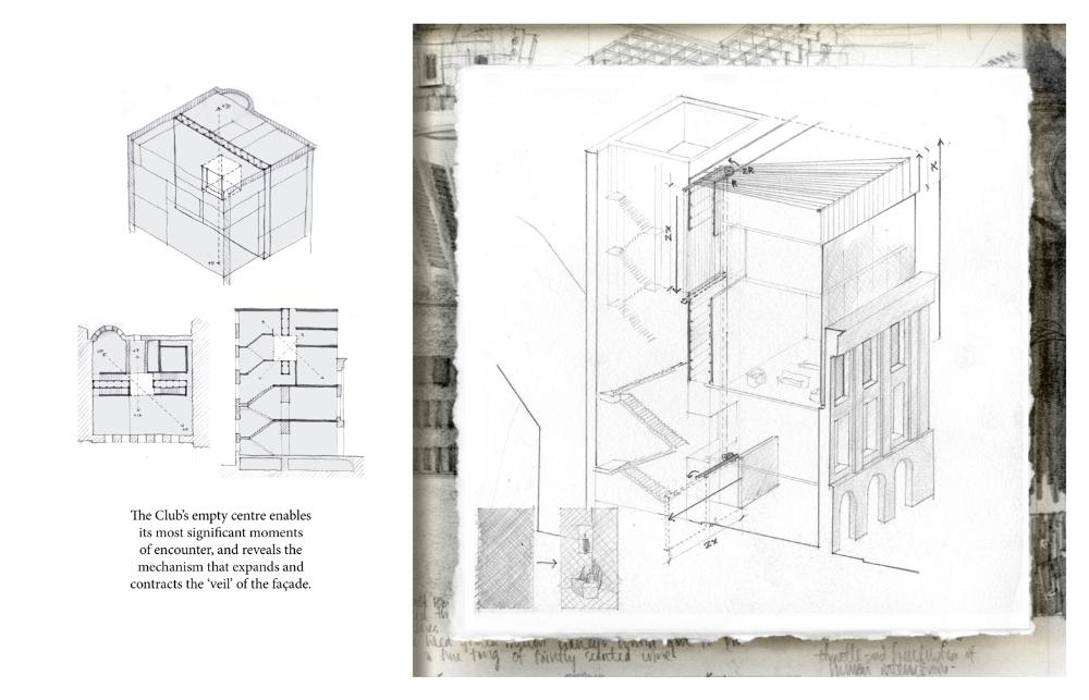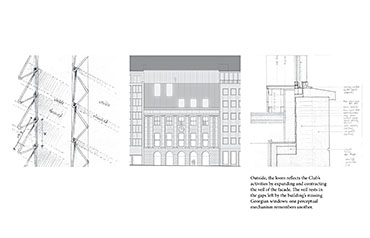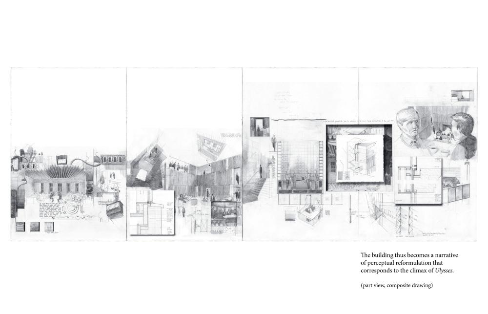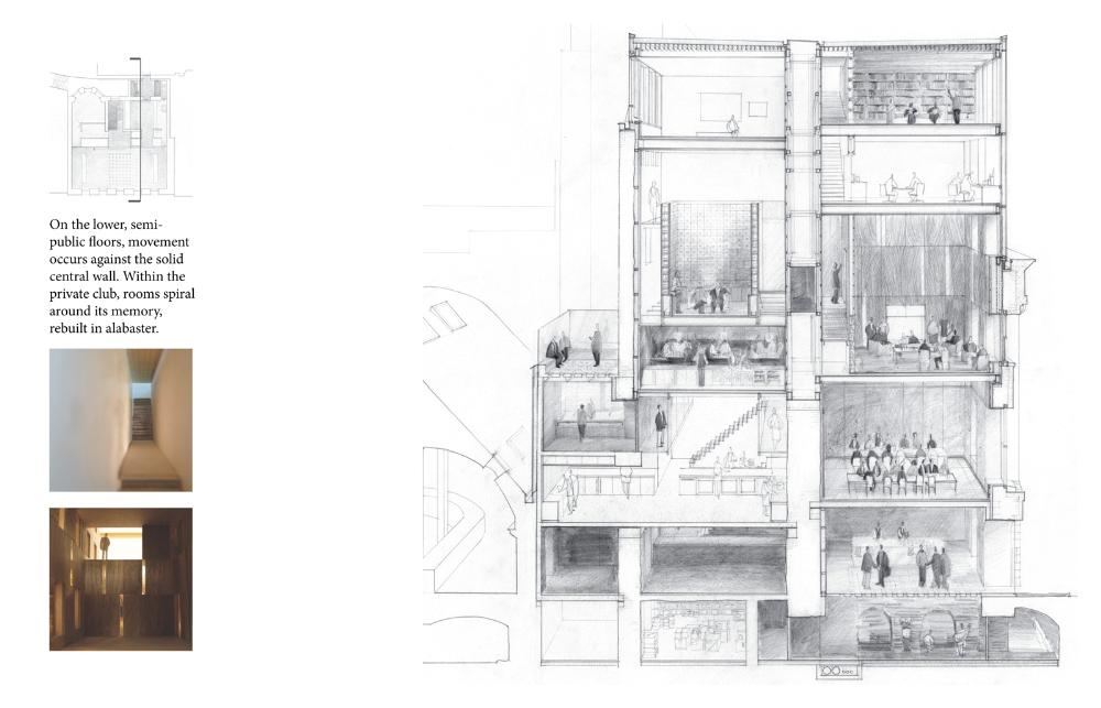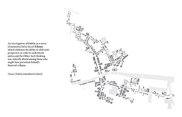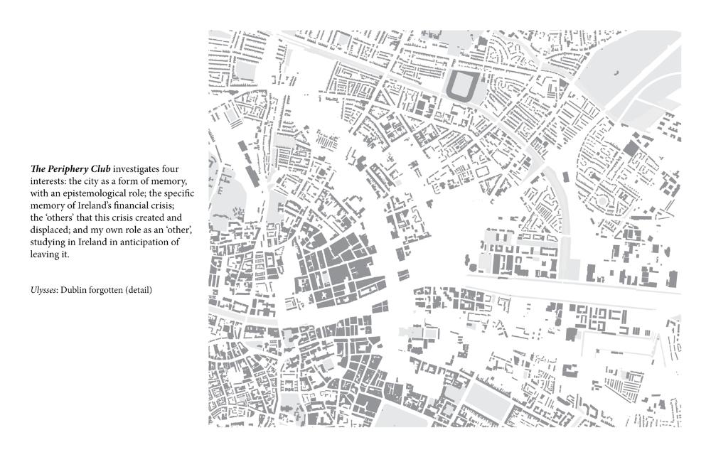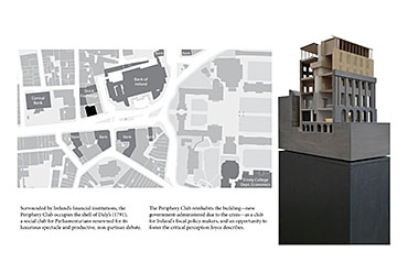 The Periphery Club: Making Knowledge in the City of Collective Memory Part 2 Project 2011 Jonathan Loewen Dublin Institute of Technology | Ireland This proposal investigates four interests: an understanding of the city as a form of memory, and the epistemological implications thereof; the specific memory of Ireland’s recent financial crisis; the ‘others’ that this crisis created and displaced; and my own role as an ‘other’ studying in Ireland, who arrived in anticipation of leaving. Work began with an investigation of Dublin as a series of memories, placing particular emphasis on Joyce’s Ulysses. In what may be the best-known ‘memory’ of Dublin, Joyce argues that modernity is the ability to consciously shift one’s own perspective, in order to apprehend and accept the Other. Such thinking was conspicuously and critically absent among those who might have prevented Ireland’s financial collapse.—Located on Dublin’s College Green, the Periphery Club occupies the shell of what was Patrick Daly’s Club (1791), a social club for Parliamentarians. Daly’s was renowned as both a luxurious spectacle and a place for productive, non-partisan debate, shaped by the host himself. The Periphery Club adapts this memory, reinhabiting the building—now administered by Ireland’s National Asset Management Agency—as a club for Ireland’s fiscal policy makers, and an opportunity to foster the critical perception Joyce describes.The club accommodates four groups: the host, an expert-in-residence; the public, invited for special events; the members, the object of the club’s perceptual reformulations; and the staff, who operate interstitially between other rooms and functions. Each group occupies a separate (Other) realm, with fissures and crossovers creating moments of mutual apprehension. Materiality and detailing are conceived as a field of symbolic fragments: as in Ulysses, meaning accrues through sequence and memory. The narrative sequence of club rooms, adapted from Ulysses’ climax of perceptual reformulation, is interrupted by moments of strategic emptiness. At the club’s centre, a cubic excision enables the building’s most significant moment of encounter, and exposes the mechanism the controls the façade: a shroud of bronze mesh that tightens or unravels to reflect the club’s varying accessibility. This loom and veil thus extend the building’s conceptual parallax from the private realm of the club into the public realm of the city. Tutor(s) Donal Hickey