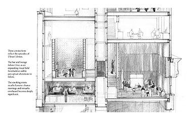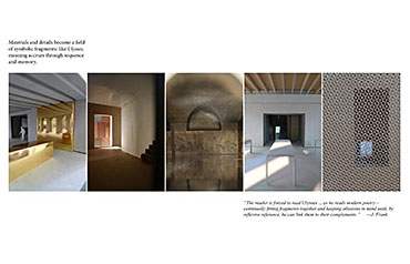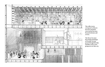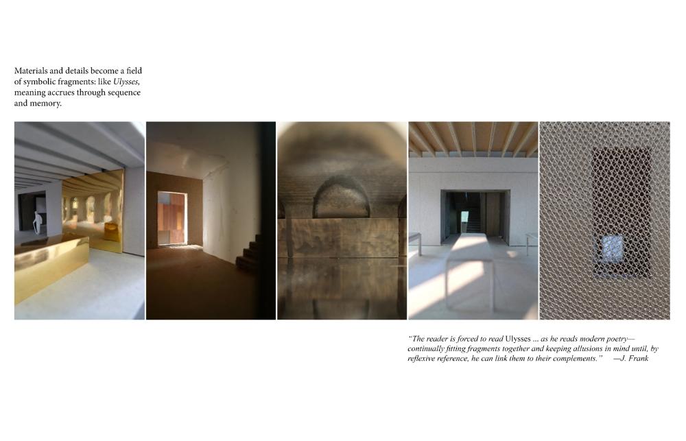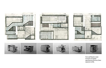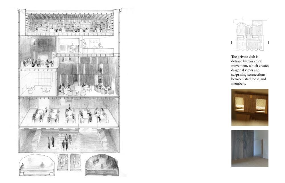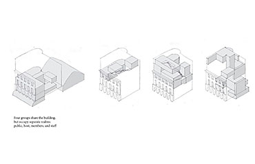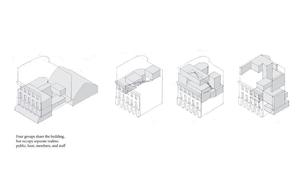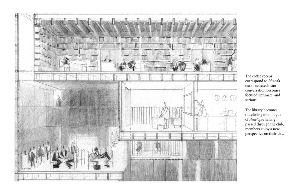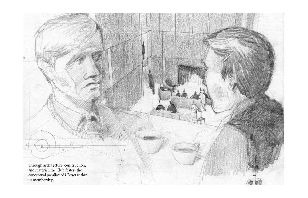 The Periphery Club: Making Knowledge in the City of Collective Memory Part 2 Project 2011 Jonathan Loewen Dublin Institute of Technology | Ireland This proposal investigates four interests: an understanding of the city as a form of memory, and the epistemological implications thereof; the specific memory of Ireland’s recent financial crisis; the ‘others’ that this crisis created and displaced; and my own role as an ‘other’ studying in Ireland, who arrived in anticipation of leaving. Work began with an investigation of Dublin as a series of memories, placing particular emphasis on Joyce’s Ulysses. In what may be the best-known ‘memory’ of Dublin, Joyce argues that modernity is the ability to consciously shift one’s own perspective, in order to apprehend and accept the Other. Such thinking was conspicuously and critically absent among those who might have prevented Ireland’s financial collapse.—Located on Dublin’s College Green, the Periphery Club occupies the shell of what was Patrick Daly’s Club (1791), a social club for Parliamentarians. Daly’s was renowned as both a luxurious spectacle and a place for productive, non-partisan debate, shaped by the host himself. The Periphery Club adapts this memory, reinhabiting the building—now administered by Ireland’s National Asset Management Agency—as a club for Ireland’s fiscal policy makers, and an opportunity to foster the critical perception Joyce describes.The club accommodates four groups: the host, an expert-in-residence; the public, invited for special events; the members, the object of the club’s perceptual reformulations; and the staff, who operate interstitially between other rooms and functions. Each group occupies a separate (Other) realm, with fissures and crossovers creating moments of mutual apprehension. Materiality and detailing are conceived as a field of symbolic fragments: as in Ulysses, meaning accrues through sequence and memory. The narrative sequence of club rooms, adapted from Ulysses’ climax of perceptual reformulation, is interrupted by moments of strategic emptiness. At the club’s centre, a cubic excision enables the building’s most significant moment of encounter, and exposes the mechanism the controls the façade: a shroud of bronze mesh that tightens or unravels to reflect the club’s varying accessibility. This loom and veil thus extend the building’s conceptual parallax from the private realm of the club into the public realm of the city. Tutor(s) Donal Hickey
