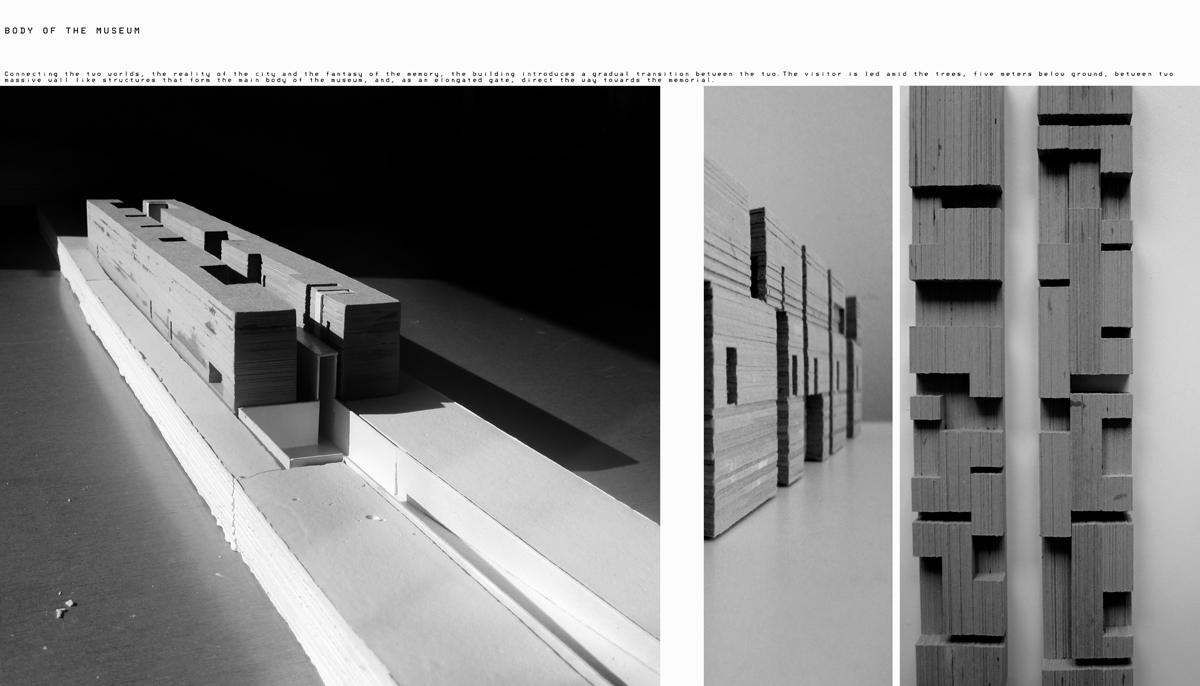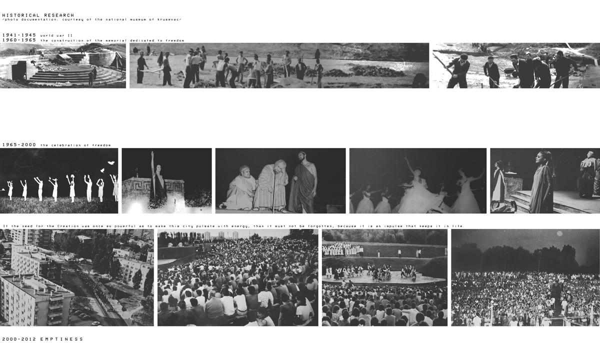 Museum of The Immortal - A city's claim to immortality Part 2 Project 2012 Andjela Karabasevic University of Belgrade | Serbia The city is essentially immortal. With the impossibility of its natural death, it is on us to protect it from all the posing threats and thus sustain its eternal life. This project struggles to save the life of the city of Krusevac. It pursues its fading immortality, by grasping the light of its glorious past and channeling it into the future. Inspired by local historical events, it is located by the memorial complex Slobodiste, built in 1965 by the architect and sculptor Bogdan Bogdanovic. Dedicated to the innocent killed here during World War II, it includes a huge amphitheater under the open sky, where supreme theatrical performances were held for 35 years after its completion. The country gradually got smaller and weaker, and this extraordinary space is now only used by the residents of Krusevac for recreational purposes. The city itself that once used to be a marking point on the Yugoslavian cultural map is on its verge of dying out.The design proposes an extension of the road leading from the centre of Krusevac towards the memorial, on the point where it suddenly stops and the emptiness takes over. Being the link between the two worlds, the reality of the city and the fantasy of the memory, the building introduces a gradual transition between the two. The visitor is led five meters below ground, between two massive wall like structures, forming the main body of the museum. Linear interior space ends with an underground tunnel that emerges directly into the amphitheater of Slobodiste, in this way making the crossing between the worlds complete.Museum of the Immortal aims to rebuild a path that once used to be a walk of death turned into a stride for life, and then forcefully forgotten. In the end, if history does repeat itself, we should be the ones who chose which part of it we want to be replayed in our present time. In this endless time loop, the bright spots are the ones that seek for our attention, and, after all, make us truly alive. Tutor(s) Prof. Dejan Miljkovic