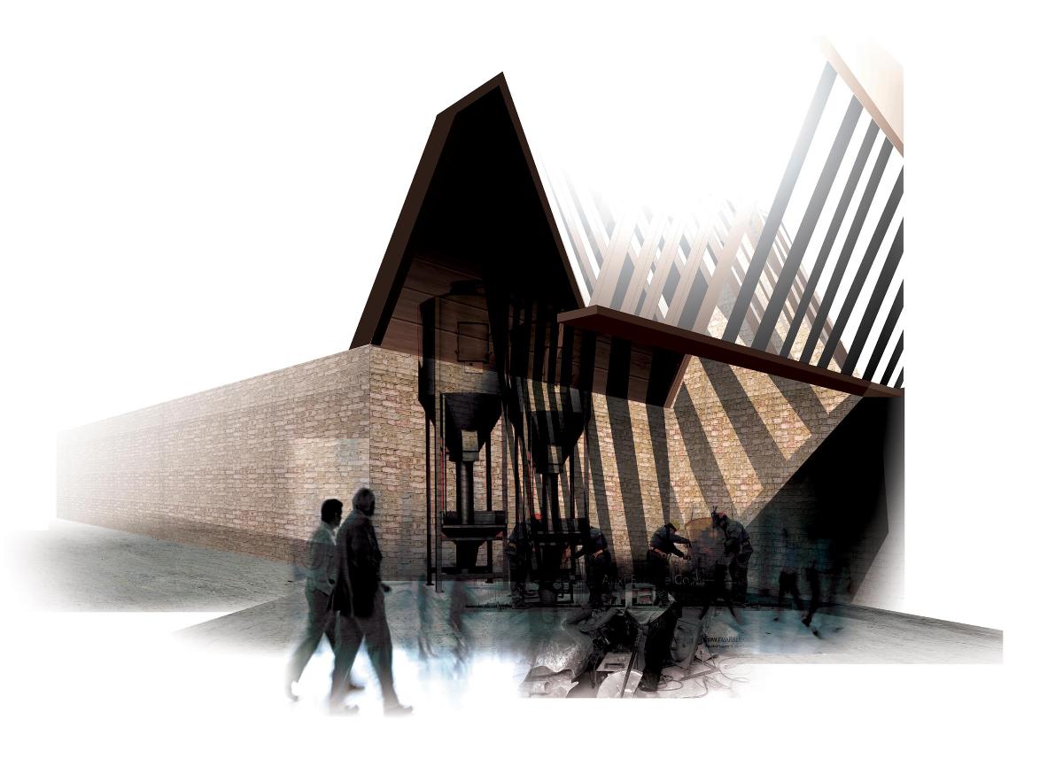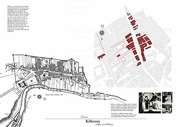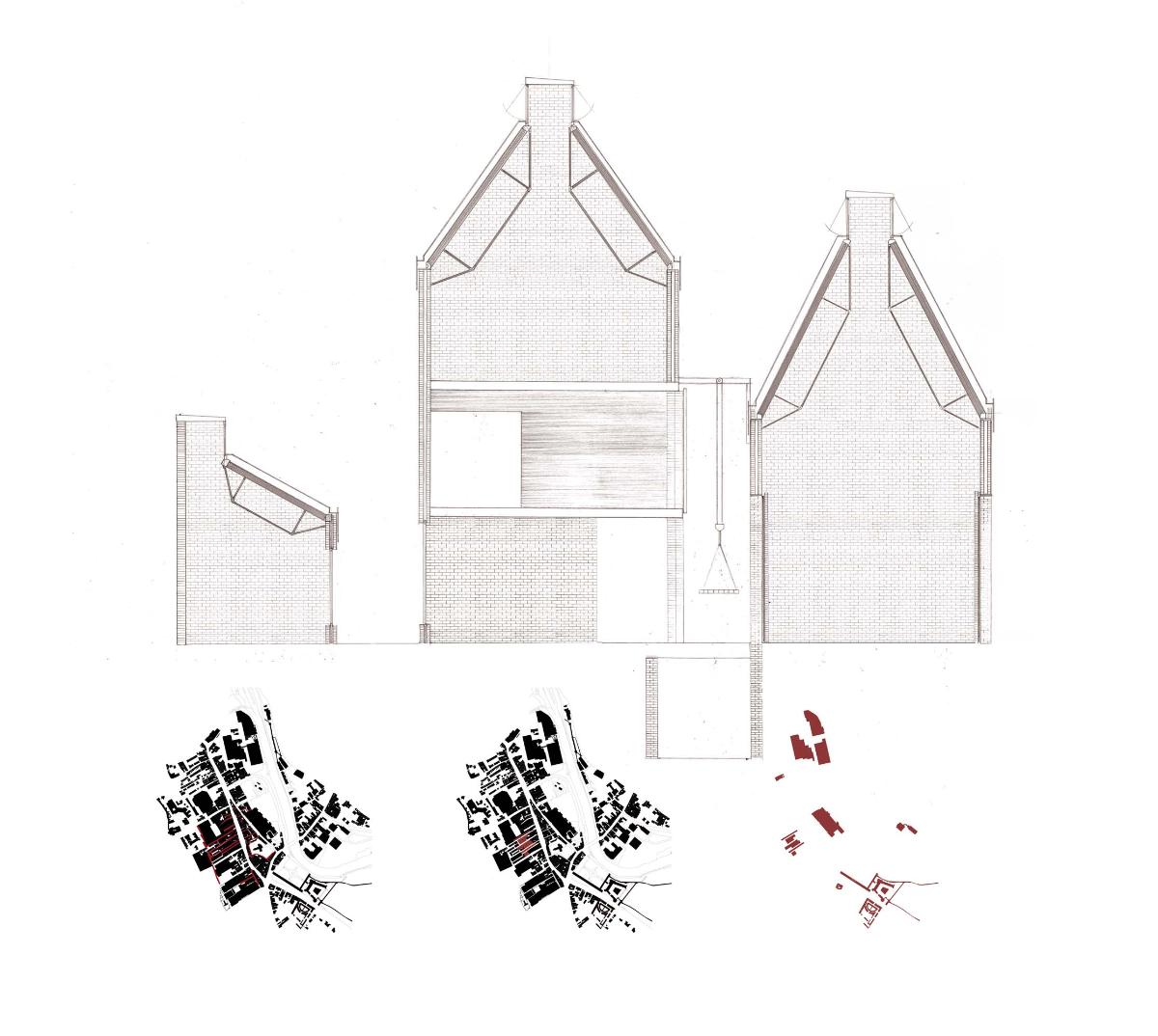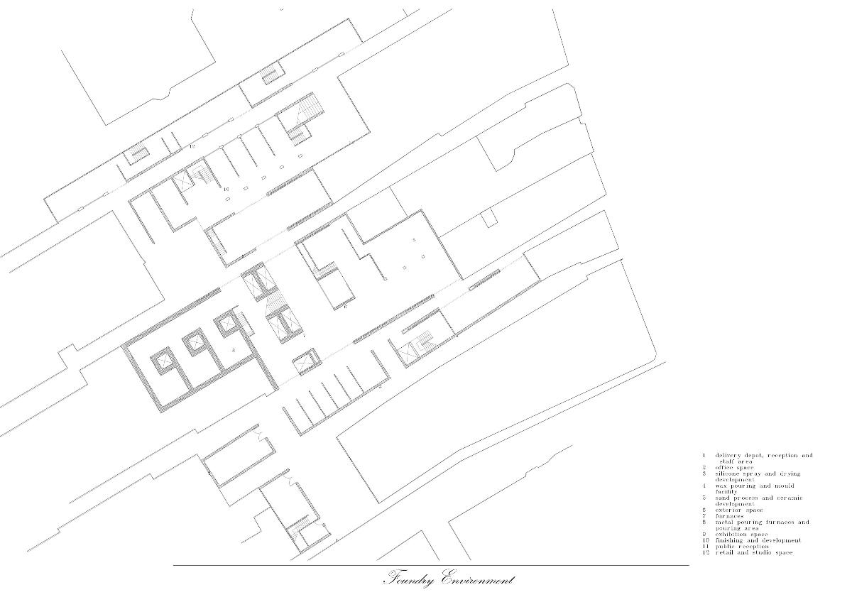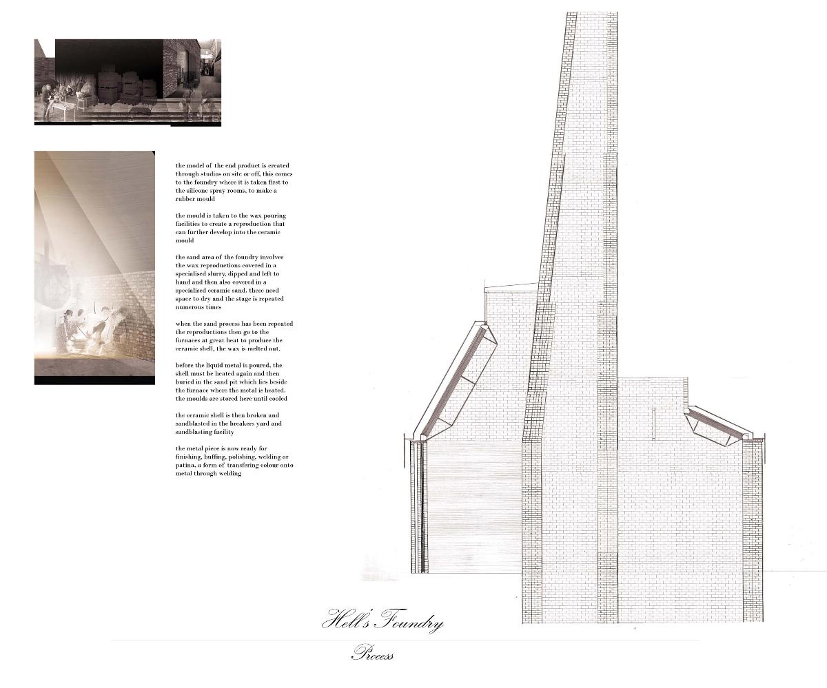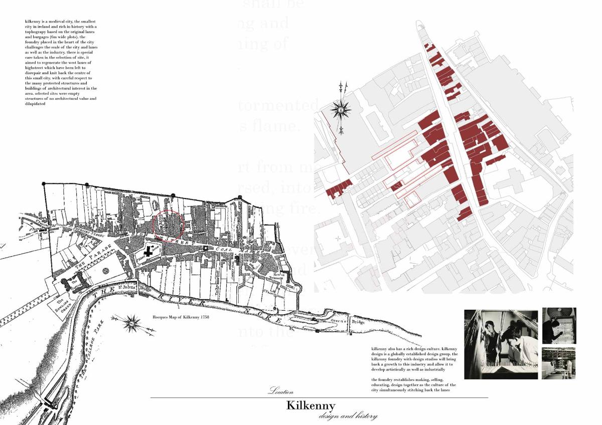 Urban Fragments: Bronze Foundry, Kilkenny City, Ireland Part 1 Project 2012 Amy Hore University College Cork | Ireland Urban Fragments is a project of Regeneration in Kilkenny city, Ireland. Redeveloping existing site conditions and reworking the city’s medieval history which has been left behind and in disrepair. The building works not simply as an object but as part of the city grain and city life.Design_Making_SellingKilkenny has a history of design and making. This project challenges the scale of the site itself as well as the scale of a ‘design making selling’ industry within a small city. It has the potential to introduce a regenerated design culture into the city.This project of Urban regeneration takes the form of a bronze foundry. The programme contains large design workshops, metal workshops, exhibition space, education and selling across a number of lanes within the city centre. The building filters through these open lanes becoming a hub of design within the city rather than a closed entity. The project breathes a new life into the city in terms of its design, its purpose and its renewal of the city grain that has forgotten its potential in this part of the city.The Urban Fragments Project is located on the lanes that branch off to the west of High Street, the winding centre of the city. It maintains the site boundaries of the former buildings with respect to buildings of architectural interest that surround it. The form of this building is simple. The heavy brick walls respond to the history of the industry and site, whilst the high pitched spaceframe timber structure of the roof and glazed rooflights take it beyond a romantic tribute to an antique vocation. Tutor(s) Dr Gary Boyd David Naessens