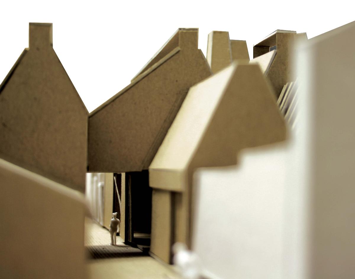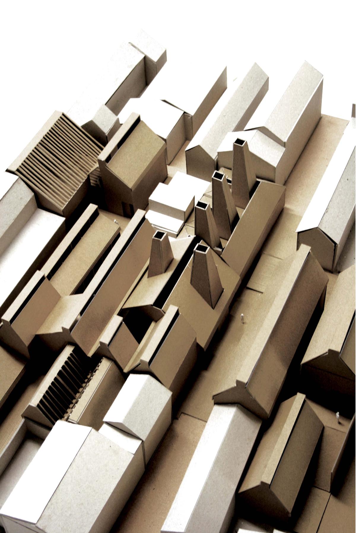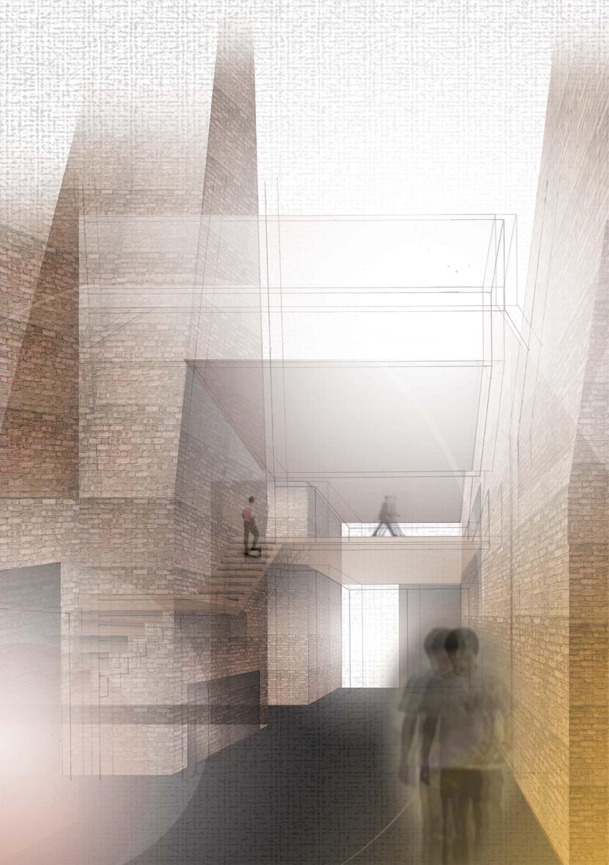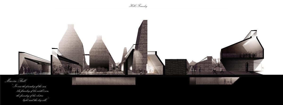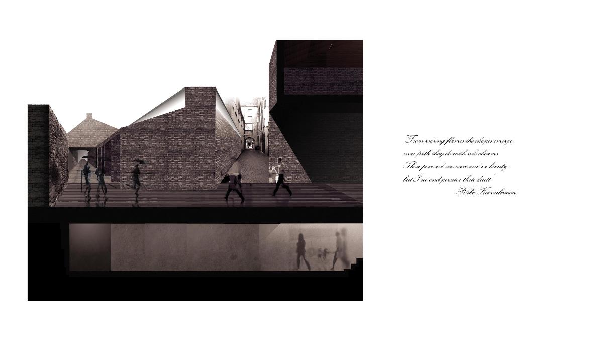 Urban Fragments: Bronze Foundry, Kilkenny City, Ireland Part 1 Project 2012 Amy Hore University College Cork | Ireland Urban Fragments is a project of Regeneration in Kilkenny city, Ireland. Redeveloping existing site conditions and reworking the city’s medieval history which has been left behind and in disrepair. The building works not simply as an object but as part of the city grain and city life.Design_Making_SellingKilkenny has a history of design and making. This project challenges the scale of the site itself as well as the scale of a ‘design making selling’ industry within a small city. It has the potential to introduce a regenerated design culture into the city.This project of Urban regeneration takes the form of a bronze foundry. The programme contains large design workshops, metal workshops, exhibition space, education and selling across a number of lanes within the city centre. The building filters through these open lanes becoming a hub of design within the city rather than a closed entity. The project breathes a new life into the city in terms of its design, its purpose and its renewal of the city grain that has forgotten its potential in this part of the city.The Urban Fragments Project is located on the lanes that branch off to the west of High Street, the winding centre of the city. It maintains the site boundaries of the former buildings with respect to buildings of architectural interest that surround it. The form of this building is simple. The heavy brick walls respond to the history of the industry and site, whilst the high pitched spaceframe timber structure of the roof and glazed rooflights take it beyond a romantic tribute to an antique vocation. Tutor(s) Dr Gary Boyd David Naessens