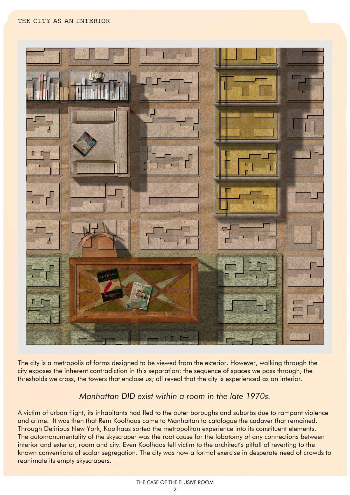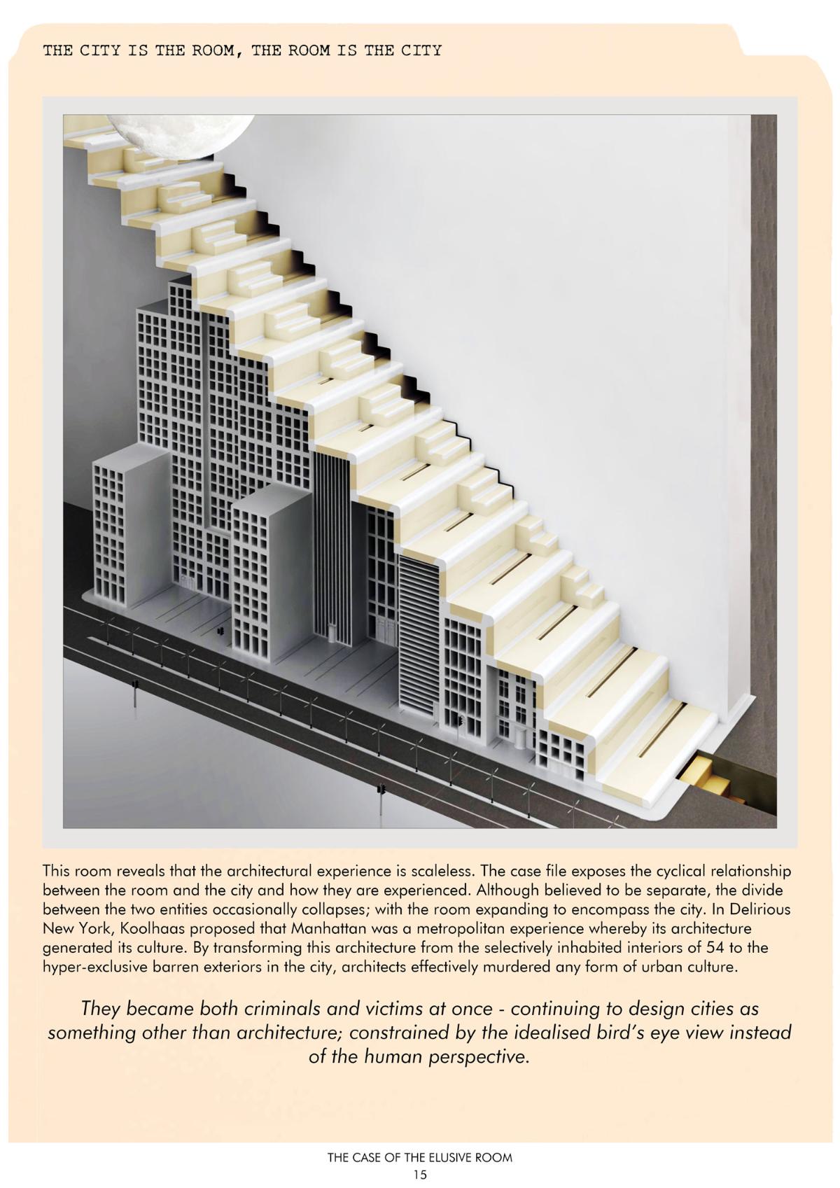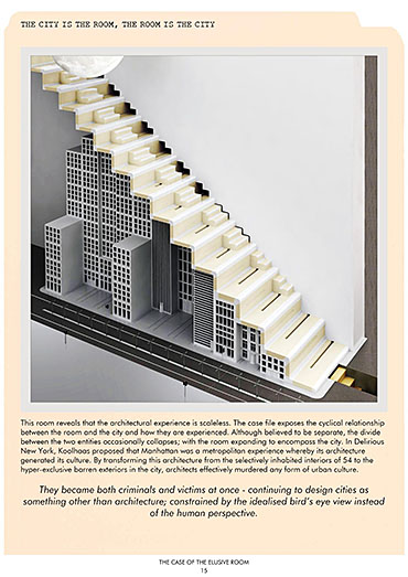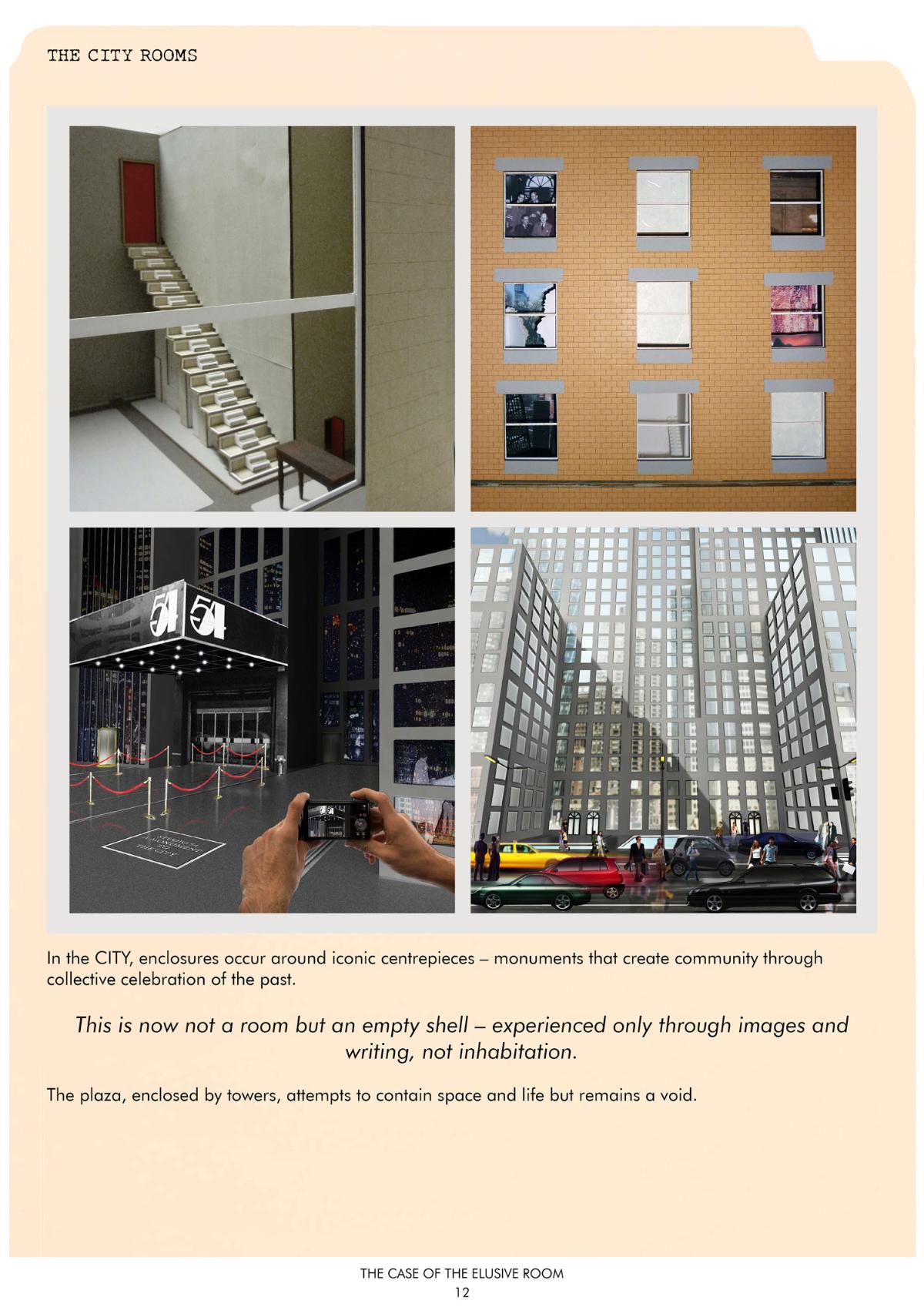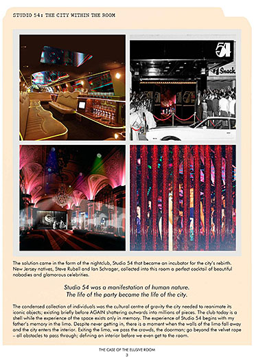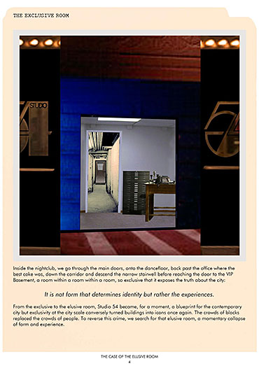 The Case of the Elusive Room Part 2 Project 2012 Manijeh Verghese Architectural Association London | UK The Case of the Elusive Room is the mystery that has plagued the city over the crime committed by architects in believing that the room and the city are mutually exclusive. Architects categorise space according to scale. To challenge this segregation of scales, we journey in search of the elusive room that collapses the city into an interior. Inspired by Dennis Wheatley’s 1930s murder mysteries, the project is documented as a case file that collects spatial clues to resolve how the city fleetingly collapsed into an interior to help solve the crime of why the room and city have since been separated again. The case file format allows the reader to take on the role of the detective. Sorting through evidence and unpeeling layered images firsthand constructs the journey through the project.Beginning with the prototypical city within the room, Studio 54, the spaces of the iconic nightclub are reconstructed to understand how, in translating its exclusivity to the city scale, buildings turned into uninhabitable icons once again. To reverse this crime, we search for that elusive room; a momentary collapse of form and experience where the room expands to encompass the city and render it as whole once again.Solving the case file exposes the inadequacy of the conventional architectural description of the room and the city. Moving through the different scalar spaces reveals that we are perpetrators of the crime of not only reading the room and the city as discrete entities but failing to recognise that they are one and the same. By collapsing the various scales into the space of the room, the city is a constantly aggregated experience of concentric interiority. In Delirious New York, Koolhaas proposed Manhattan as a metropolitan experience whereby its architecture generated its culture. By transforming this architecture from the selective interiors of 54 to the hyper-exclusive barren exteriors in the city, architects effectively murdered any form of urban culture. They became both criminals and victims at once - continuing to design cities as something other than architecture; constrained by the idealised bird’s eye view instead of the human perspective. Tutor(s)Ms Natasha Sandmeier