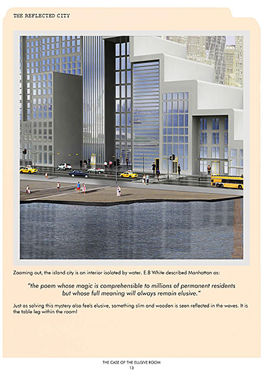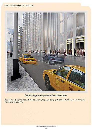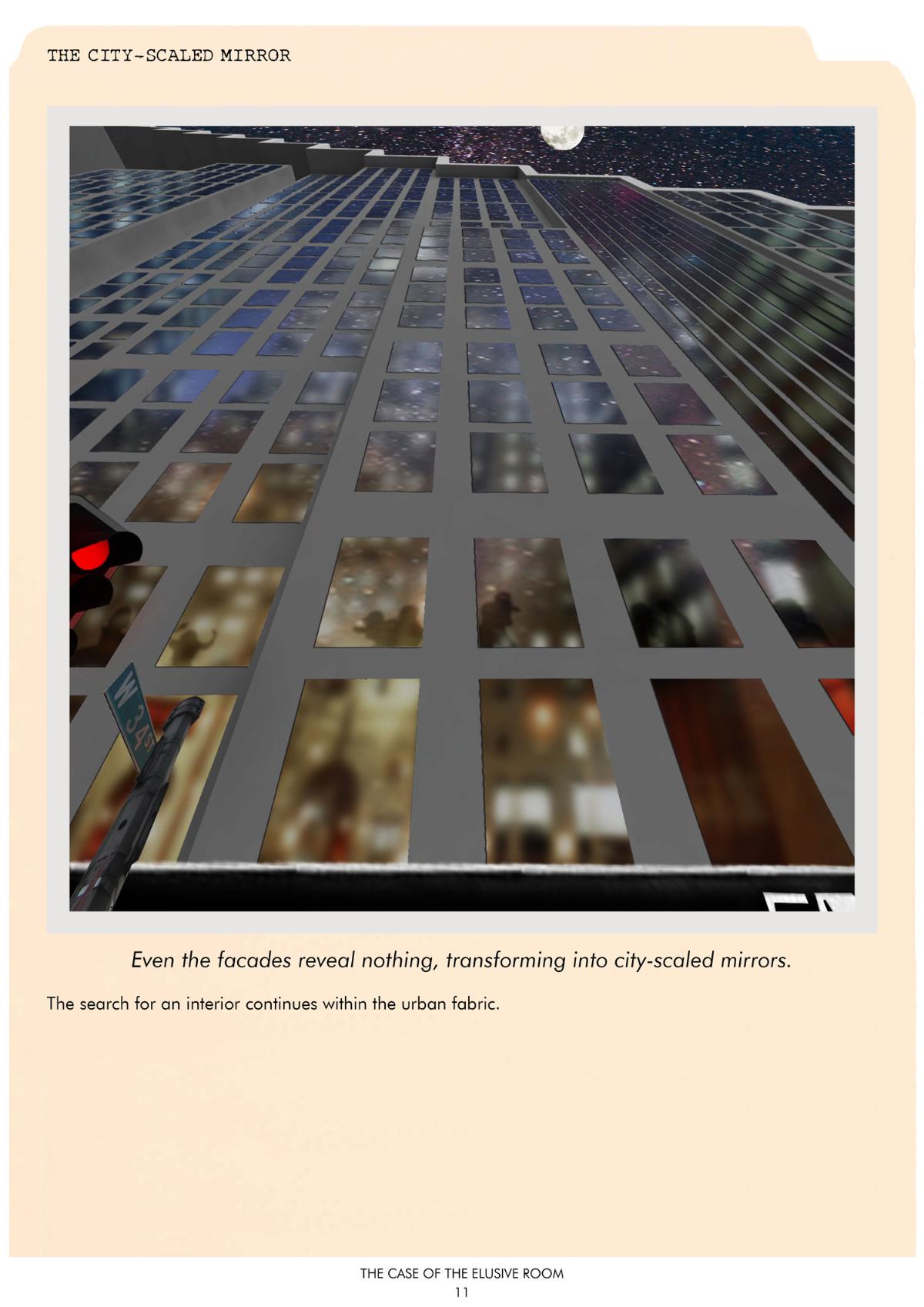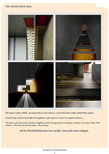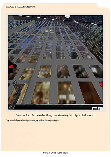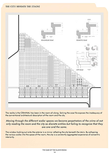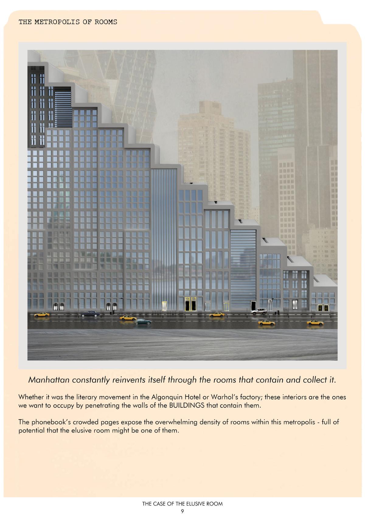 The Case of the Elusive Room Part 2 Project 2012 Manijeh Verghese Architectural Association London | UK The Case of the Elusive Room is the mystery that has plagued the city over the crime committed by architects in believing that the room and the city are mutually exclusive. Architects categorise space according to scale. To challenge this segregation of scales, we journey in search of the elusive room that collapses the city into an interior. Inspired by Dennis Wheatley’s 1930s murder mysteries, the project is documented as a case file that collects spatial clues to resolve how the city fleetingly collapsed into an interior to help solve the crime of why the room and city have since been separated again. The case file format allows the reader to take on the role of the detective. Sorting through evidence and unpeeling layered images firsthand constructs the journey through the project.Beginning with the prototypical city within the room, Studio 54, the spaces of the iconic nightclub are reconstructed to understand how, in translating its exclusivity to the city scale, buildings turned into uninhabitable icons once again. To reverse this crime, we search for that elusive room; a momentary collapse of form and experience where the room expands to encompass the city and render it as whole once again.Solving the case file exposes the inadequacy of the conventional architectural description of the room and the city. Moving through the different scalar spaces reveals that we are perpetrators of the crime of not only reading the room and the city as discrete entities but failing to recognise that they are one and the same. By collapsing the various scales into the space of the room, the city is a constantly aggregated experience of concentric interiority. In Delirious New York, Koolhaas proposed Manhattan as a metropolitan experience whereby its architecture generated its culture. By transforming this architecture from the selective interiors of 54 to the hyper-exclusive barren exteriors in the city, architects effectively murdered any form of urban culture. They became both criminals and victims at once - continuing to design cities as something other than architecture; constrained by the idealised bird’s eye view instead of the human perspective. Tutor(s)Ms Natasha Sandmeier