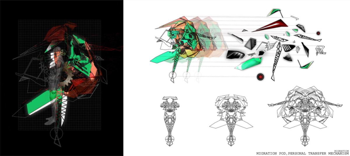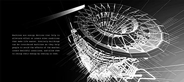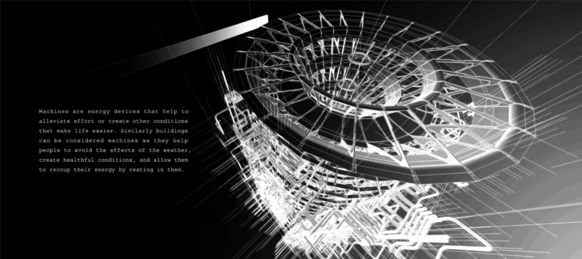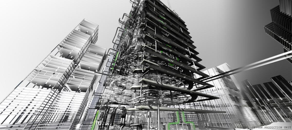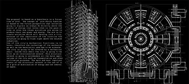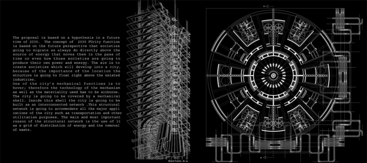 The city is going to be covered by a mechanical shell. Inside this shell the city is going to be built as an interconnected network .This structural network is going to accommodate all the major applications of the city such as transportation and other utilitarian purposes. The main and most important reason of the structural network is the use of it as a grid of distribution of energy and the removal of waste.