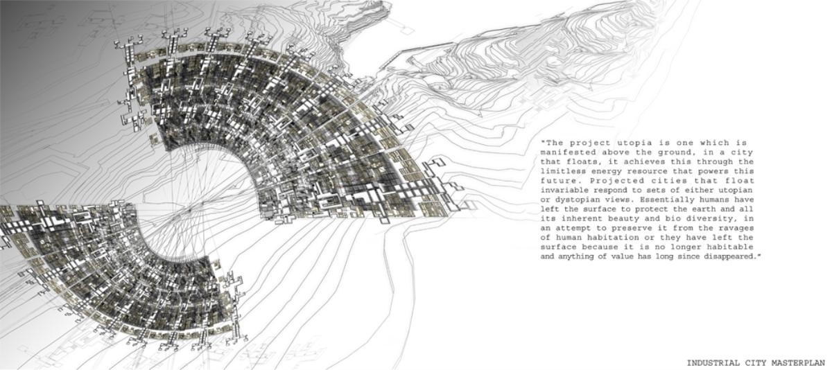 My projected utopia is one which is manifested above the ground, in a city that floats, it achieves this through the limitless energy resource that powers this future. Projected cities that float invariable respond to sets of either utopian or dystopian views. Essentially humans have left the surface to protect the earth and all its inherent beauty and bio diversity, in an attempt to preserve it from the ravages of human habitation or they have left the surface because it is no longer habitable and anything of value has long since disappeared.