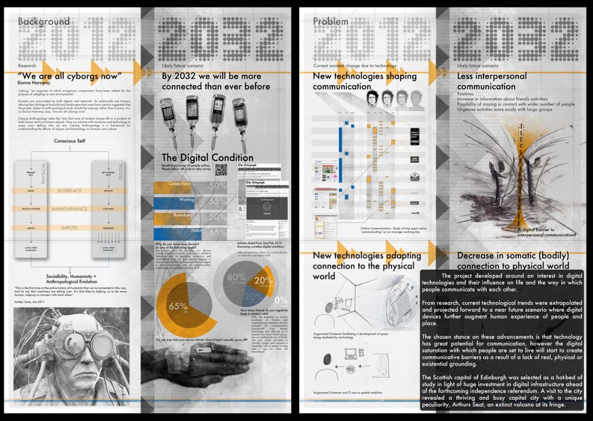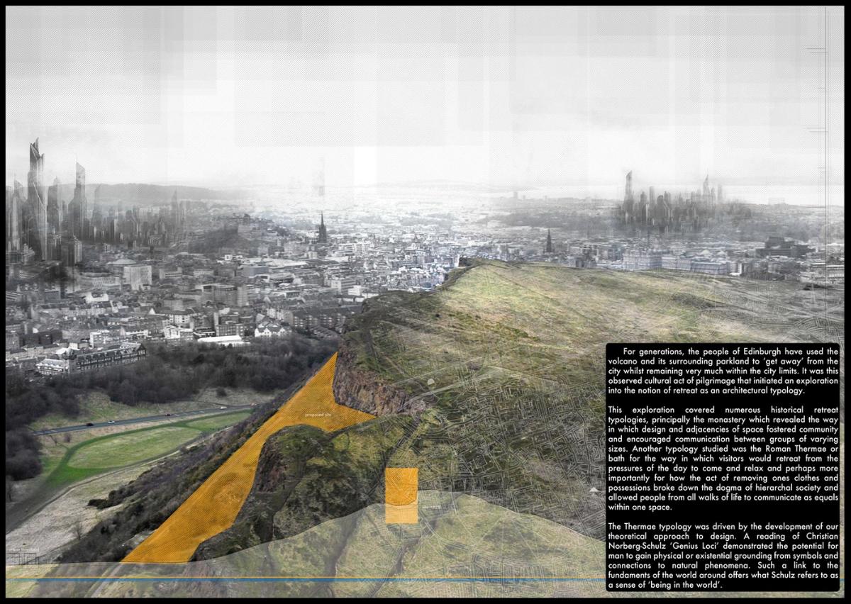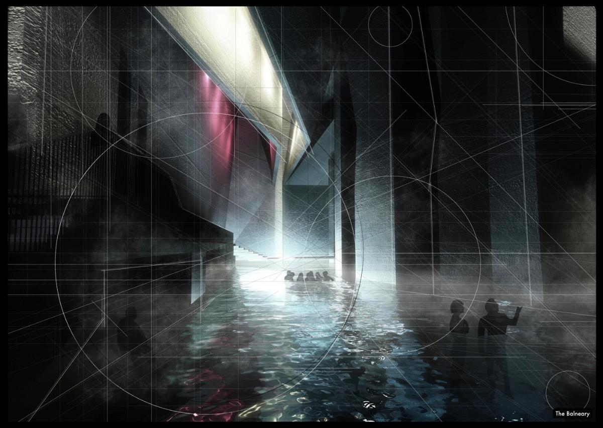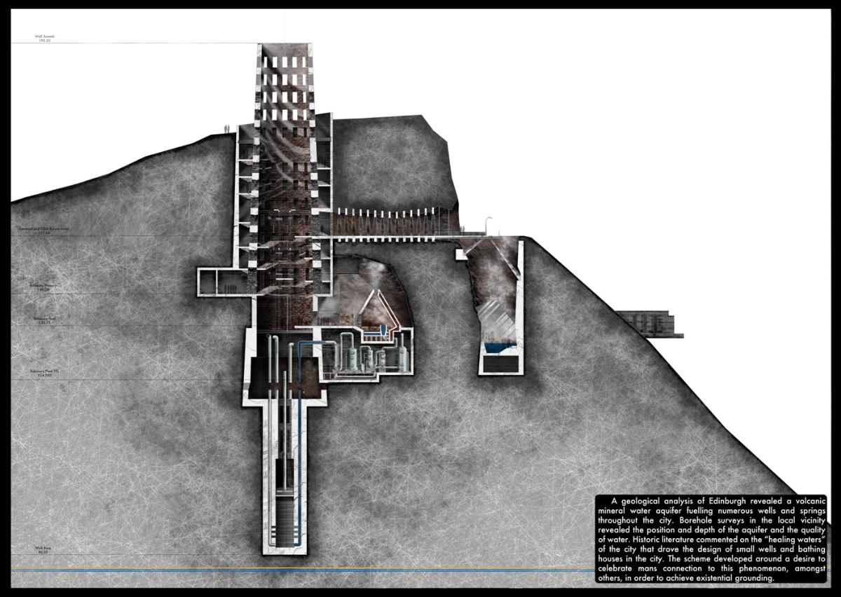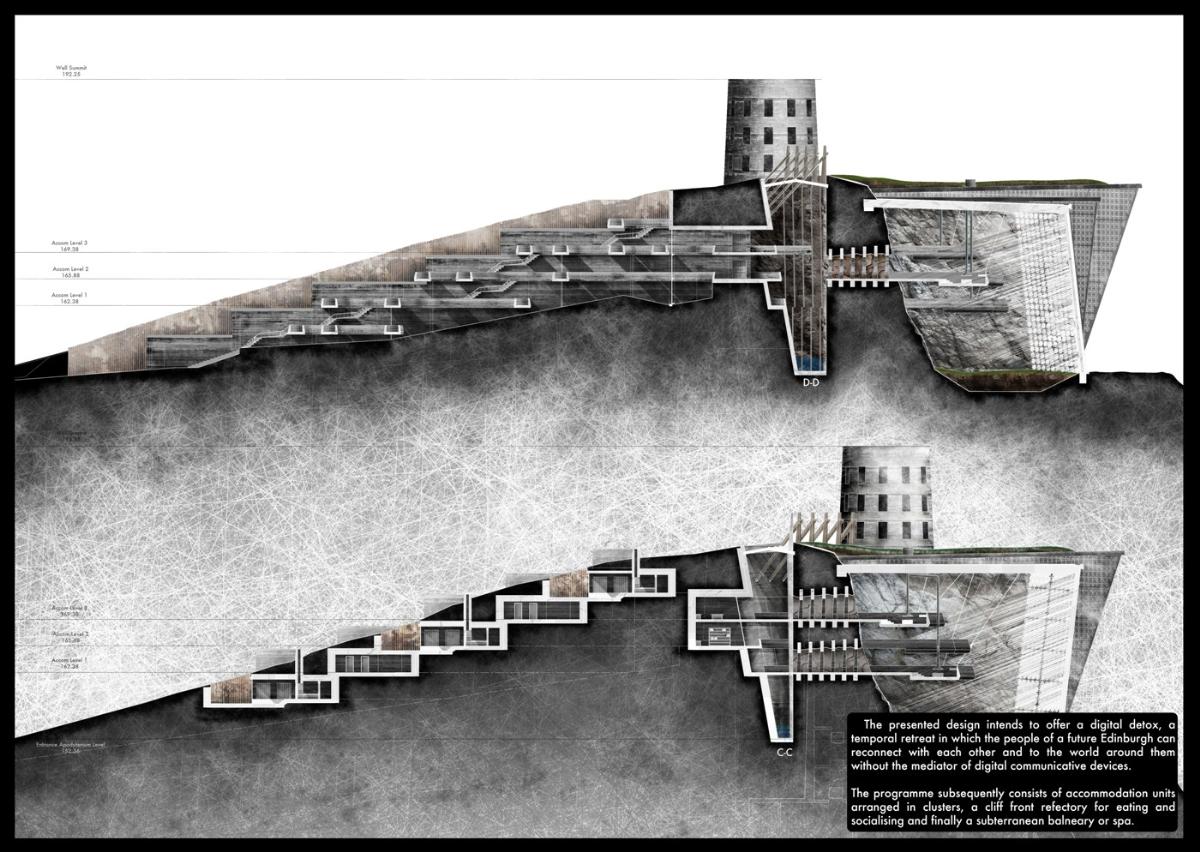 Digital Detox: A Retreat Typology. Part 2 Project 2012 Oliver O'NeillJames FosbrookAdam John University of Liverpool | UK Digital Detox is a project that explores the influence of digital technology on everyday life and the way in which reliance on digital media is set to influence human experience of people and place in the future.Set in 2032 in the Scottish capital of Edinburgh, the project bases itself on projections of urban life in the near future. The term ‘augmented existence’ describes how technology is set to become the mediator between ourselves and the world and people around us.The projects response to the pressures of this future digital saturation questioned the notion of ‘retreat’ in architecture and its potential in a near future scenario. Precedents including monasteries and Roman Thermae identified retreat as a cultural activity of the past and informed a proposal for a future typology.The scheme as presented houses a temporal community for individuals to engage in a digital detox. Re-engagement with the body and senses is central to the design of the retreat that centres on a subterranean mineral spa or Balneary.As opposed to a digital ‘blackout’, the retreat celebrates technology and its potential to enhance the physical experience of space via interactive environments that amplify the occupier’s connection to the elements, space and people around them. Tutor(s) Dr Richard Koeck