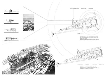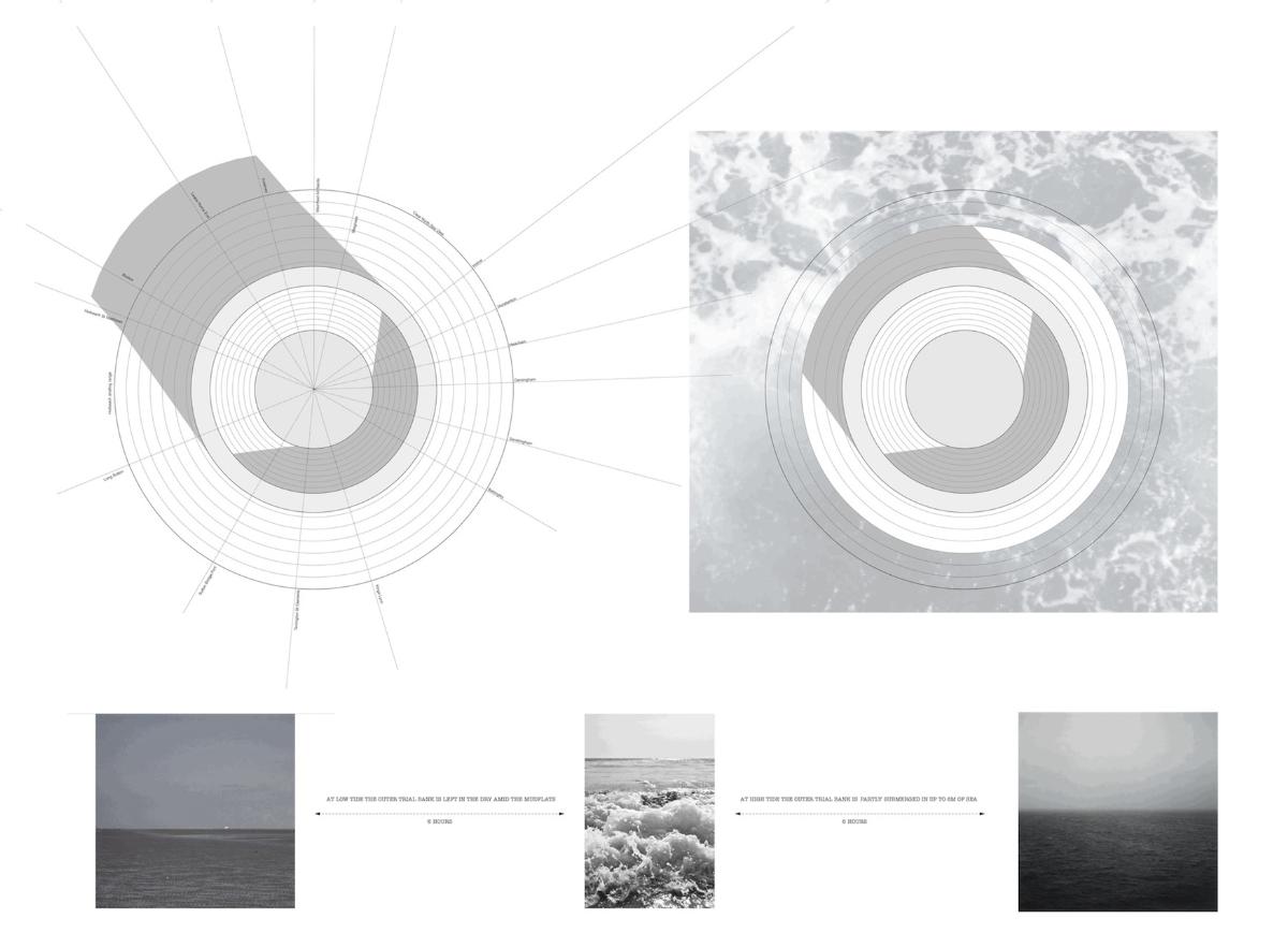 In order to monitor the full panorama of the wash, the building must rotate. A cutting is made through the island to allow the sea to fill the central crater, at high tide the weight of the building is borne by the sea, and the building can be rotated by sculling with an oar from the building to push it gently in place. The whole building is supported on a steel trolley with guide wheels at the base.
