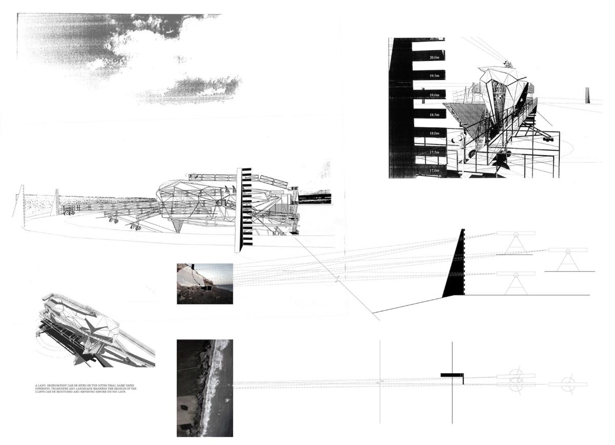 The Land Observatory, sited in this extreme environment is like Scott’s Hut in the Antarctic; an outpost. Within the building are housed powerful telescopes which look deeply at the crumbling cliffs and coast line, they cross reference points on the landscape with fixed markers built onto the Outer Trial Bank.