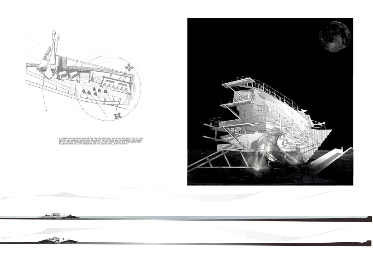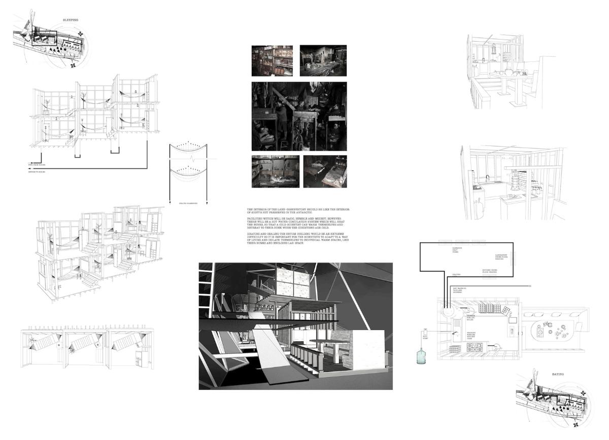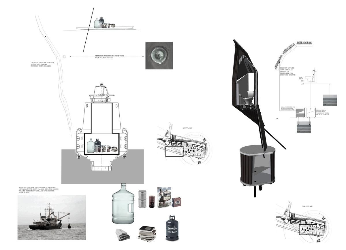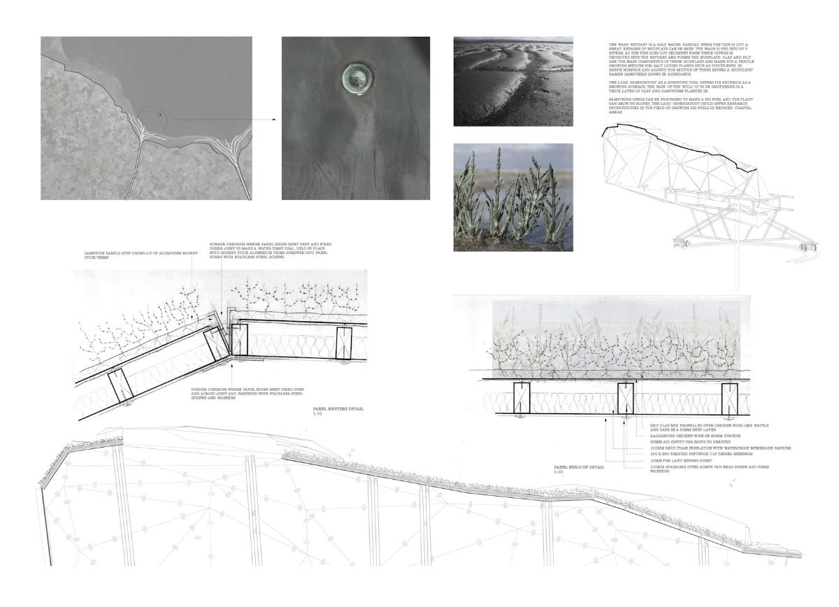Scientists living within the building will have to learn to adapt to life in the building, waking and working with the tides, and warming themselves in the heated bunks when it gets to cold, and maintaining the Samphire planted façade of the building and resmothering it with silt and clay, gathered when the tide goes out.